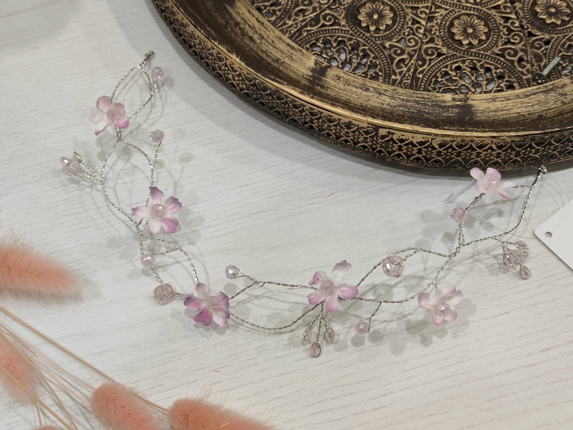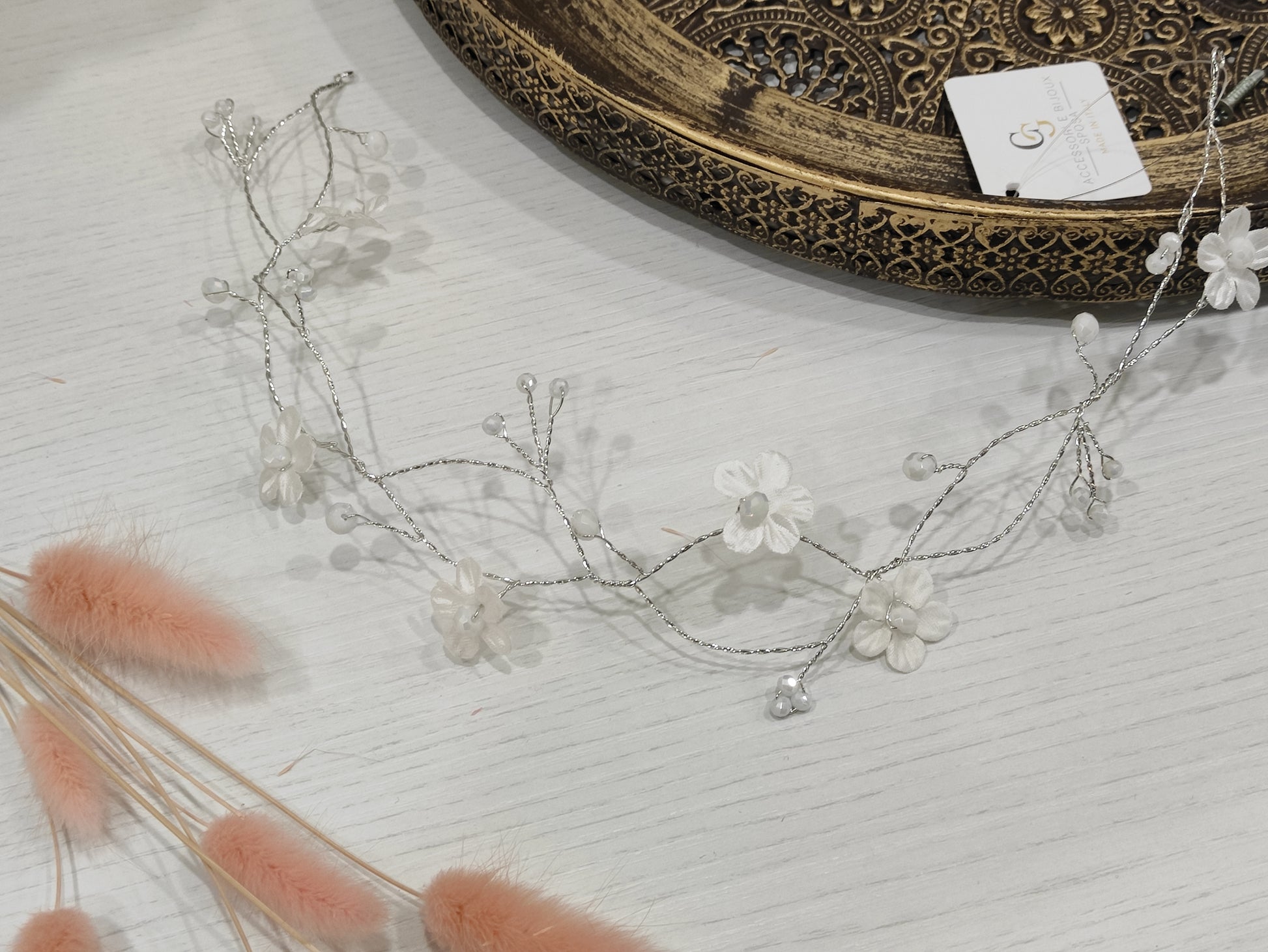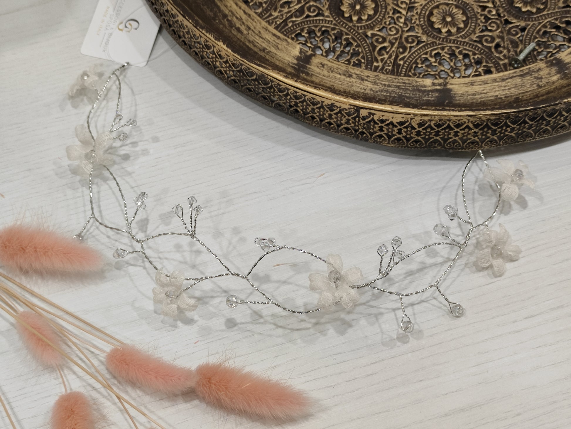 Filo bijoux con cristalli swarovski e fiorellini raso o organza, realizzabile in vari colori.