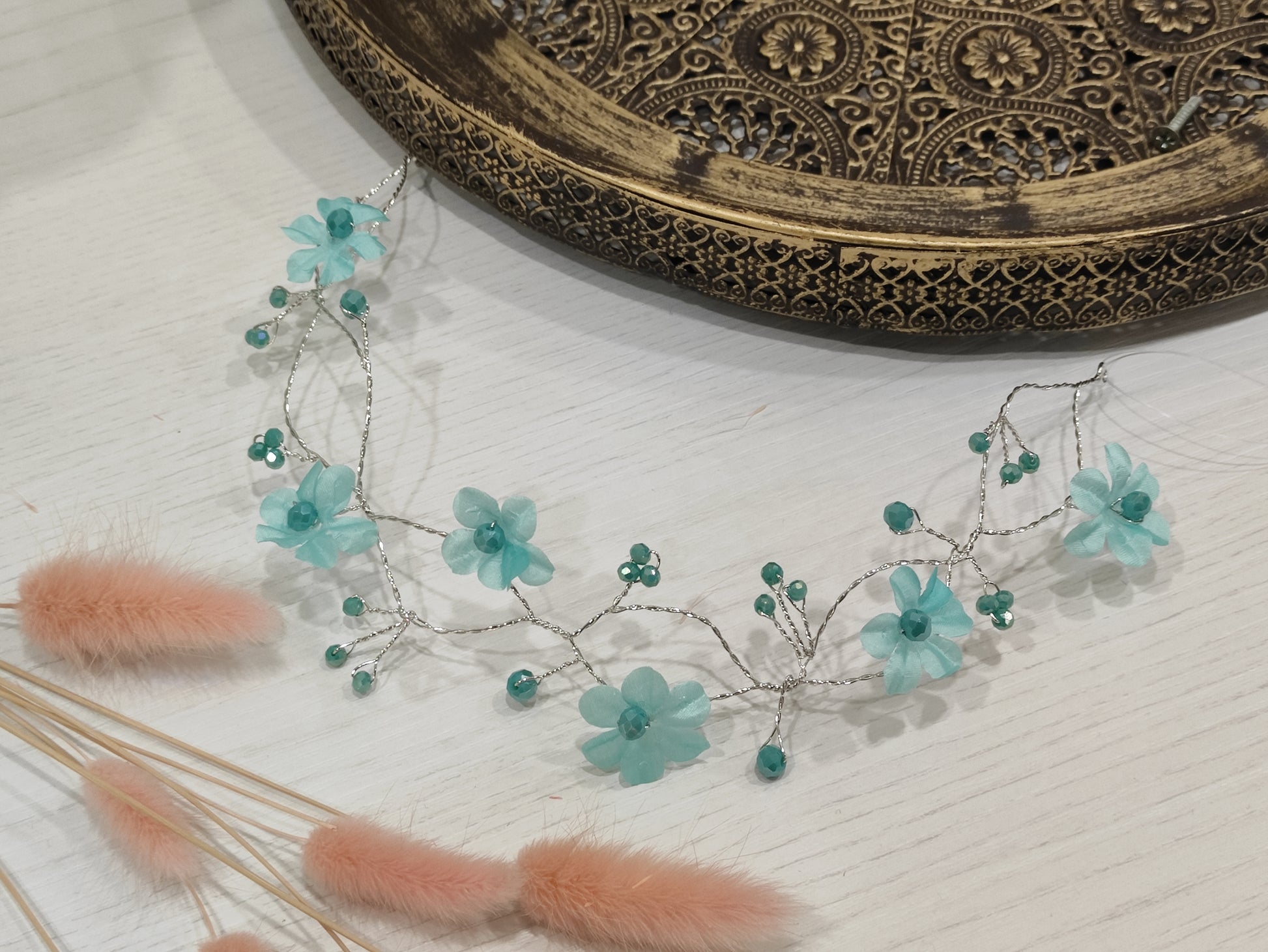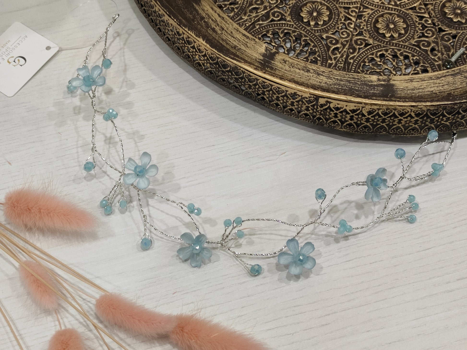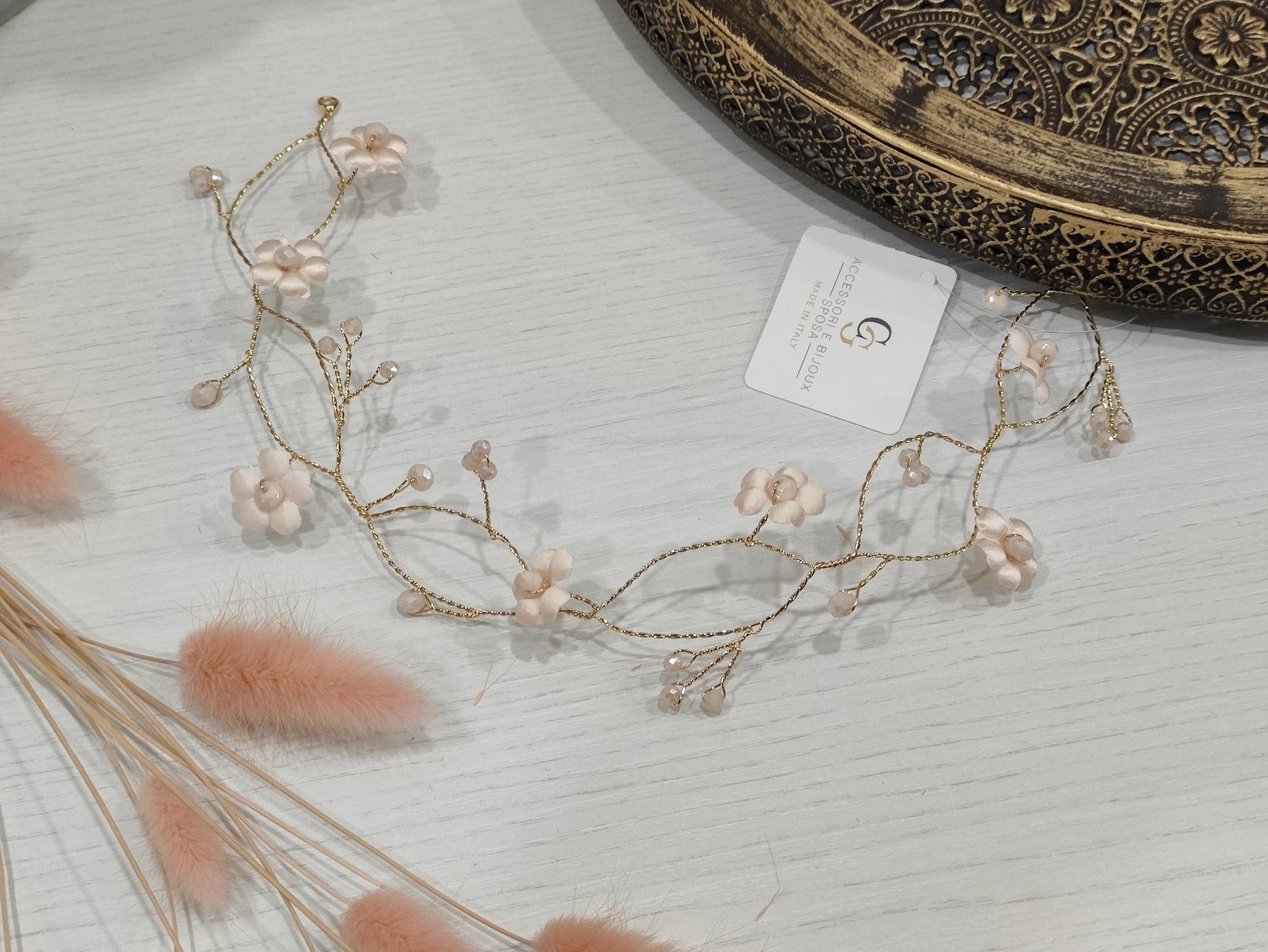 Filo bijoux con cristalli swarovski e fiorellini raso o organza, realizzabile in vari colori.