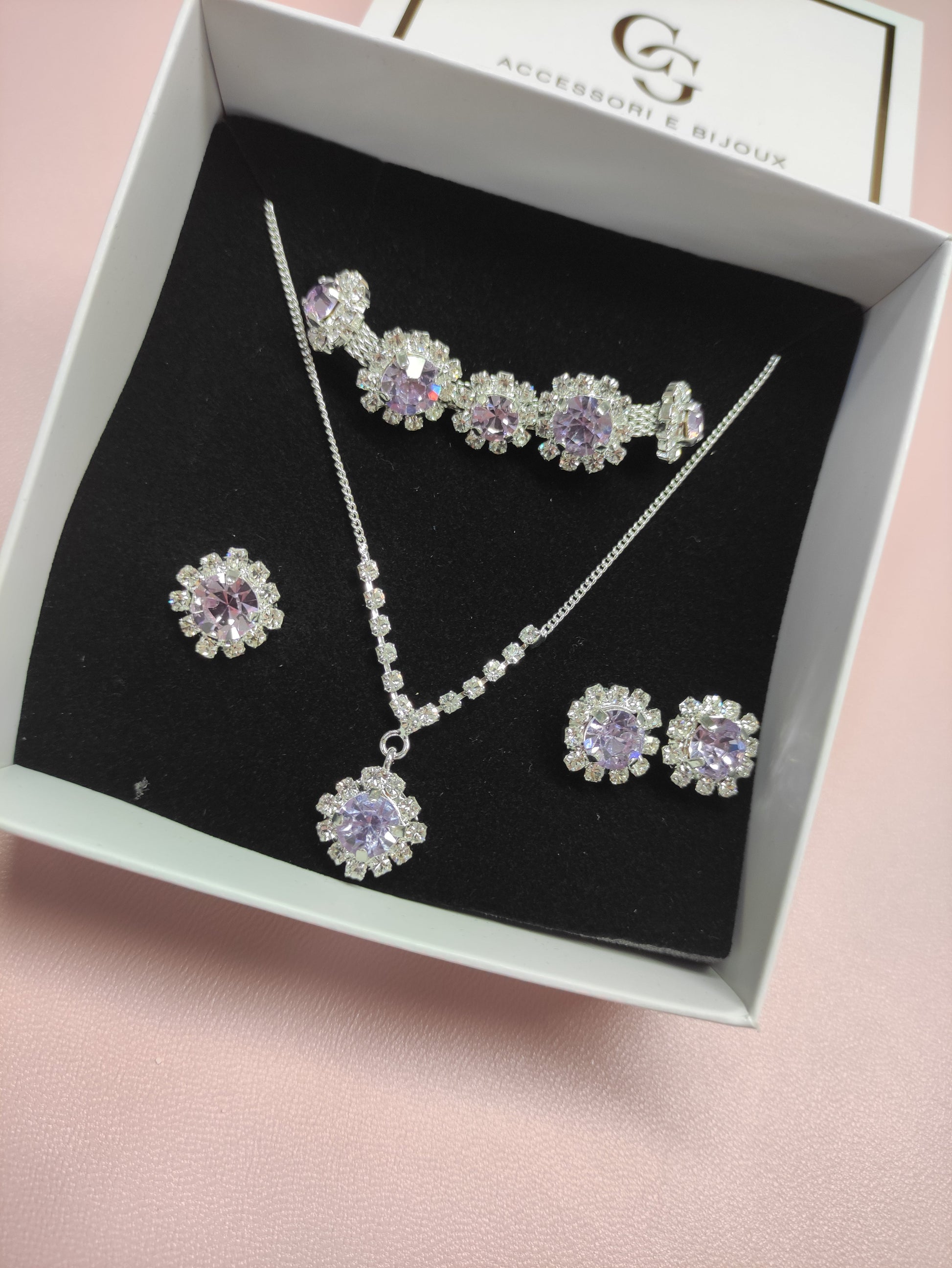 Parure composta da collana, orecchini, bracciale in strass e pietre Swarovski con galvanica oro nickel free, chiusura con moschettone tradizionale e catenina regolabile, orecchini con chiusura a vite, personalizzabile con galvanica argento.