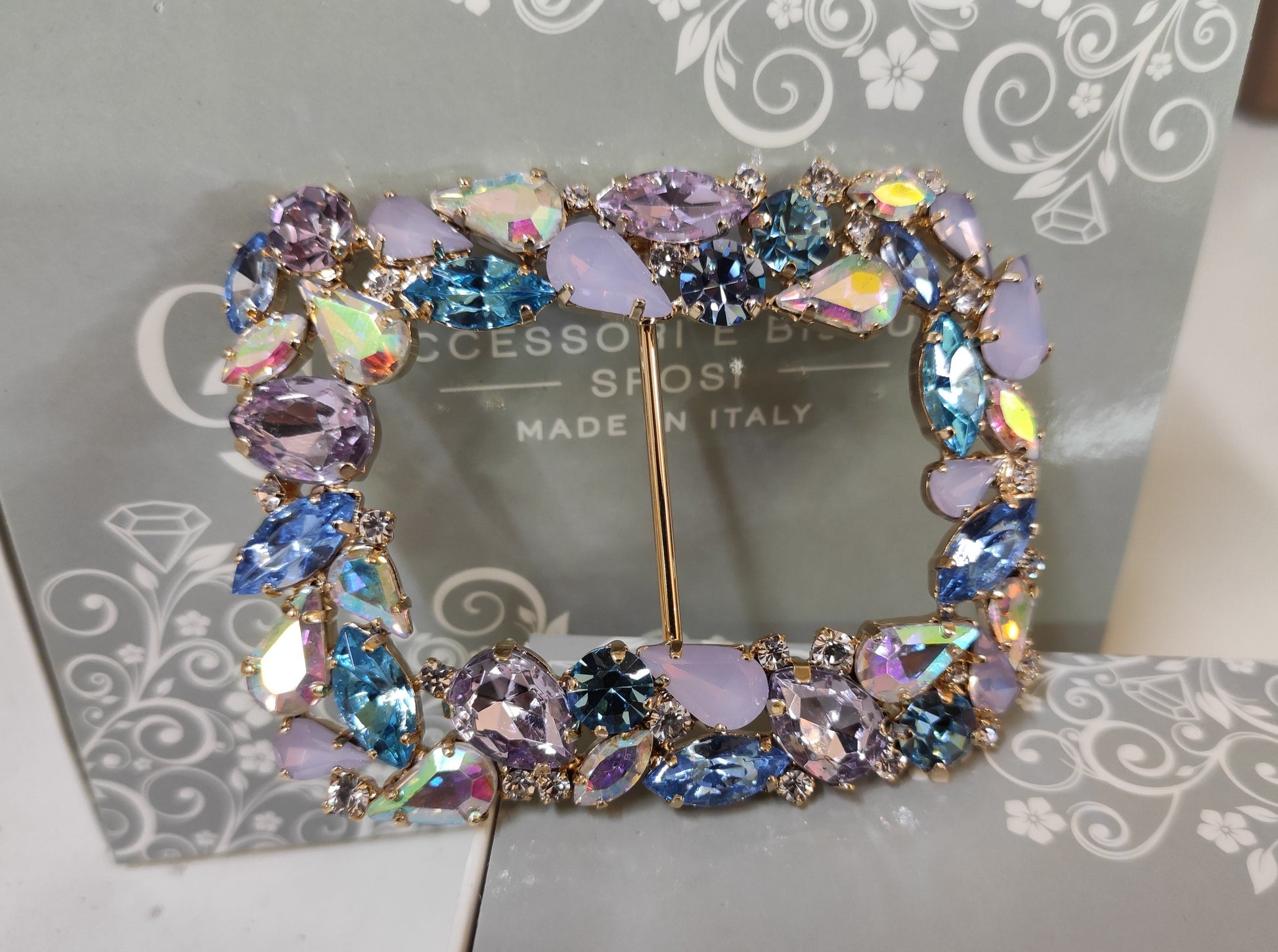 Fibbia bijoux, da applicare su cinture in tessuto. Lavorazione con pietre e strass Swarovski e Preciosa, con passante. Lega in stagno e galvanica nichel free.