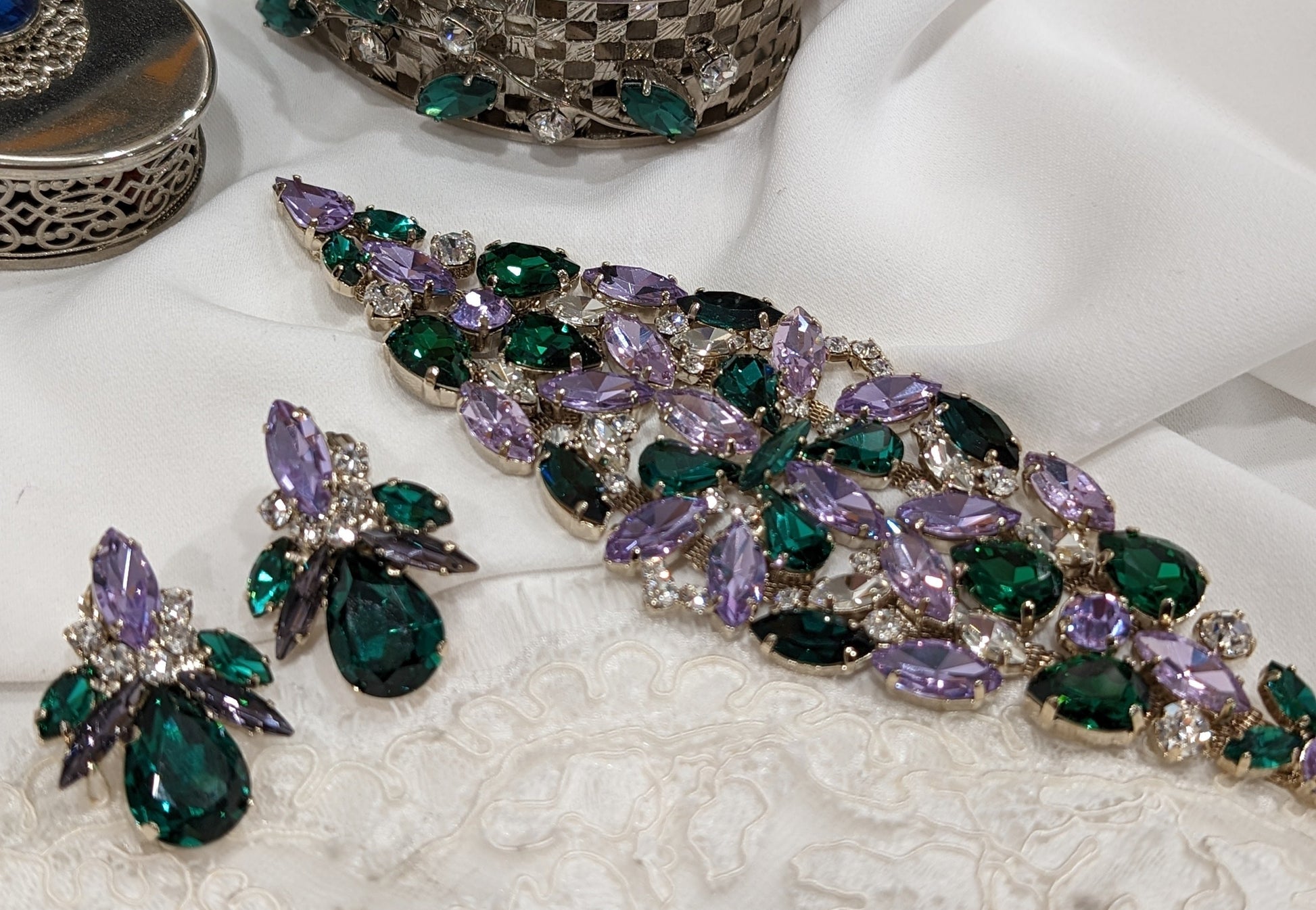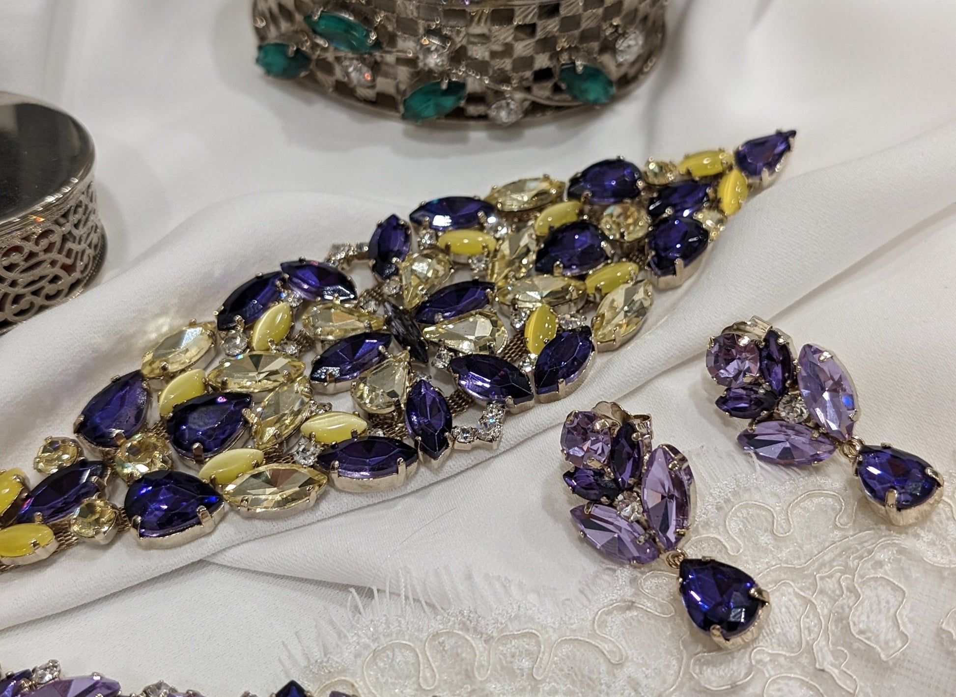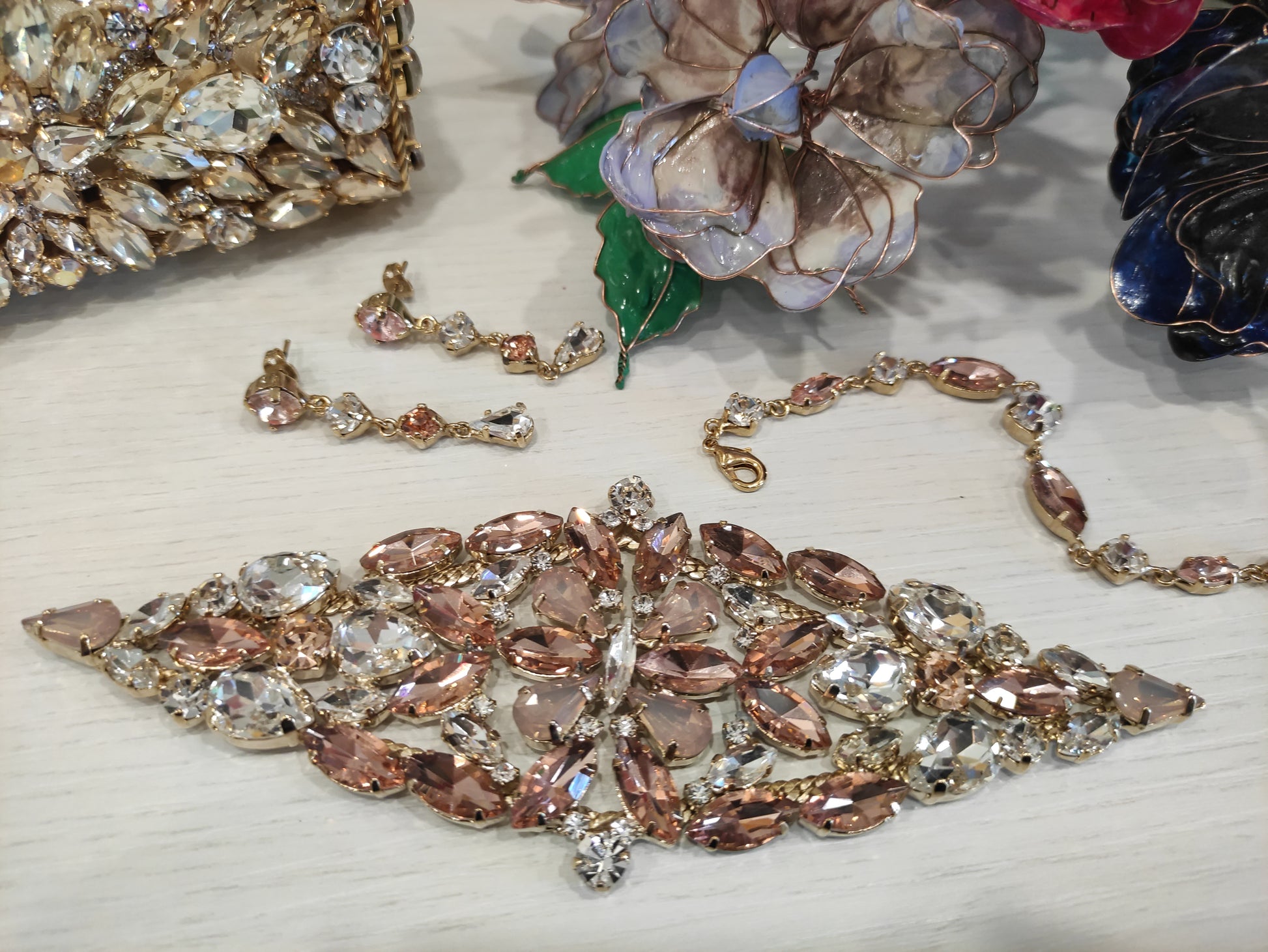 Accessorio bijoux, da applicare su cinture in tessuto. Lavorazione con pietre e strass Swarovski e Preciosa, con lega in stagno e galvanica nichel free.