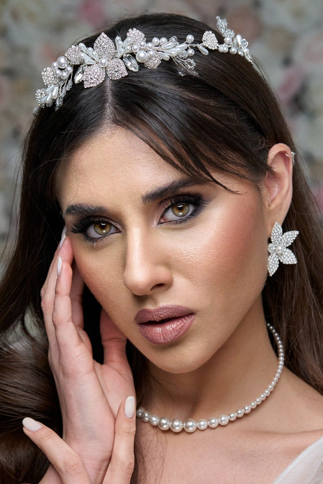 Accessorio bijoux, lavorazione a giro testa con perle cristalli e foglioline in strass swarovski, fatto a mano, made in italy, personalizzabile.