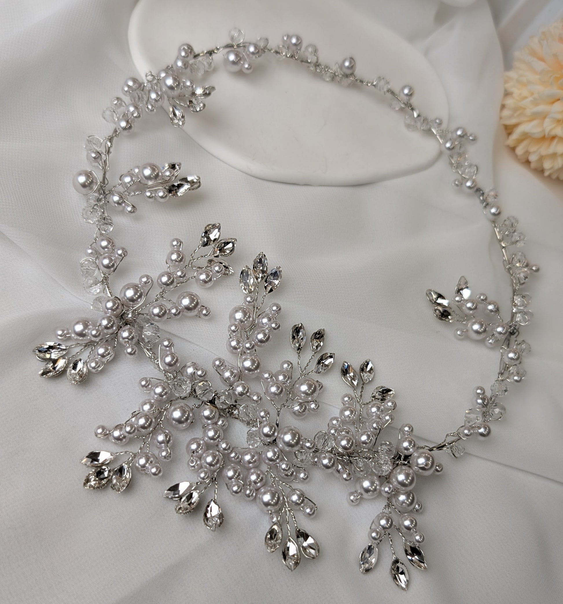 Accessorio bijoux, lavorazione a giro testa con perle e pietre swarovski, fatto a mano, made in italy, personalizzabile.