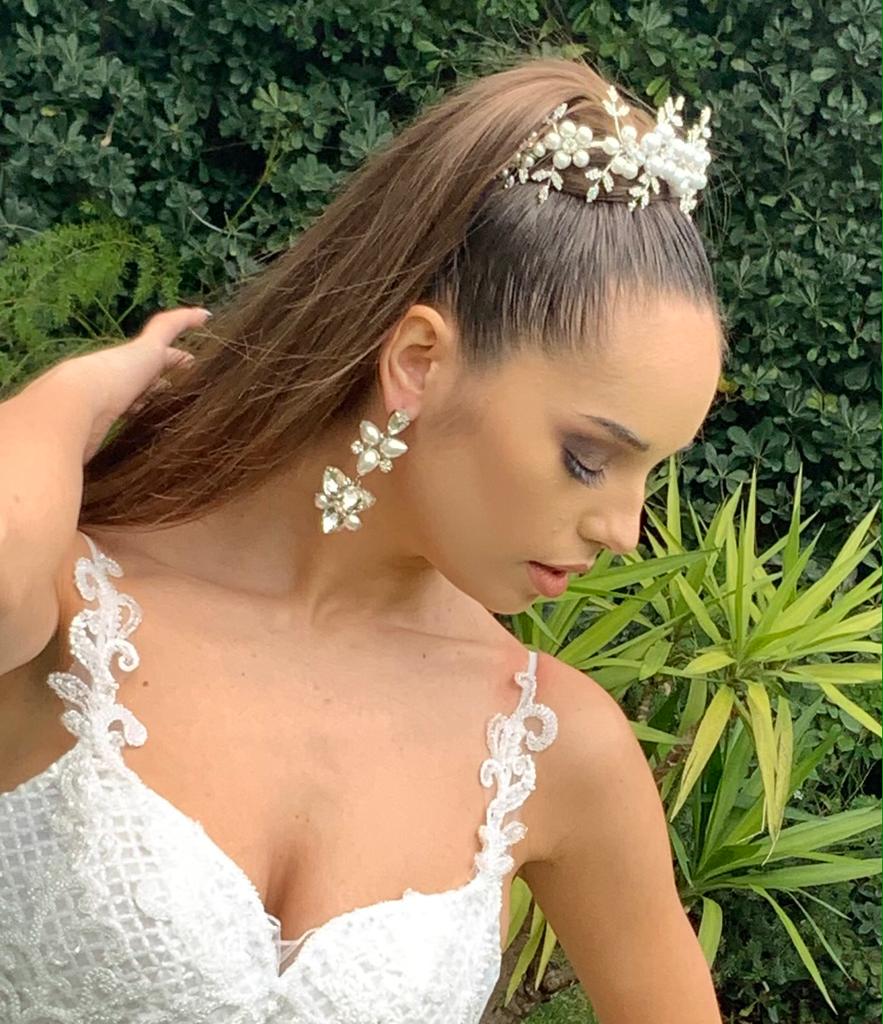 Accessorio bijoux modellabile con fiori in perle e rametti in foglioline strass swarovski, fatto a mano, made in italy, personalizzabile.