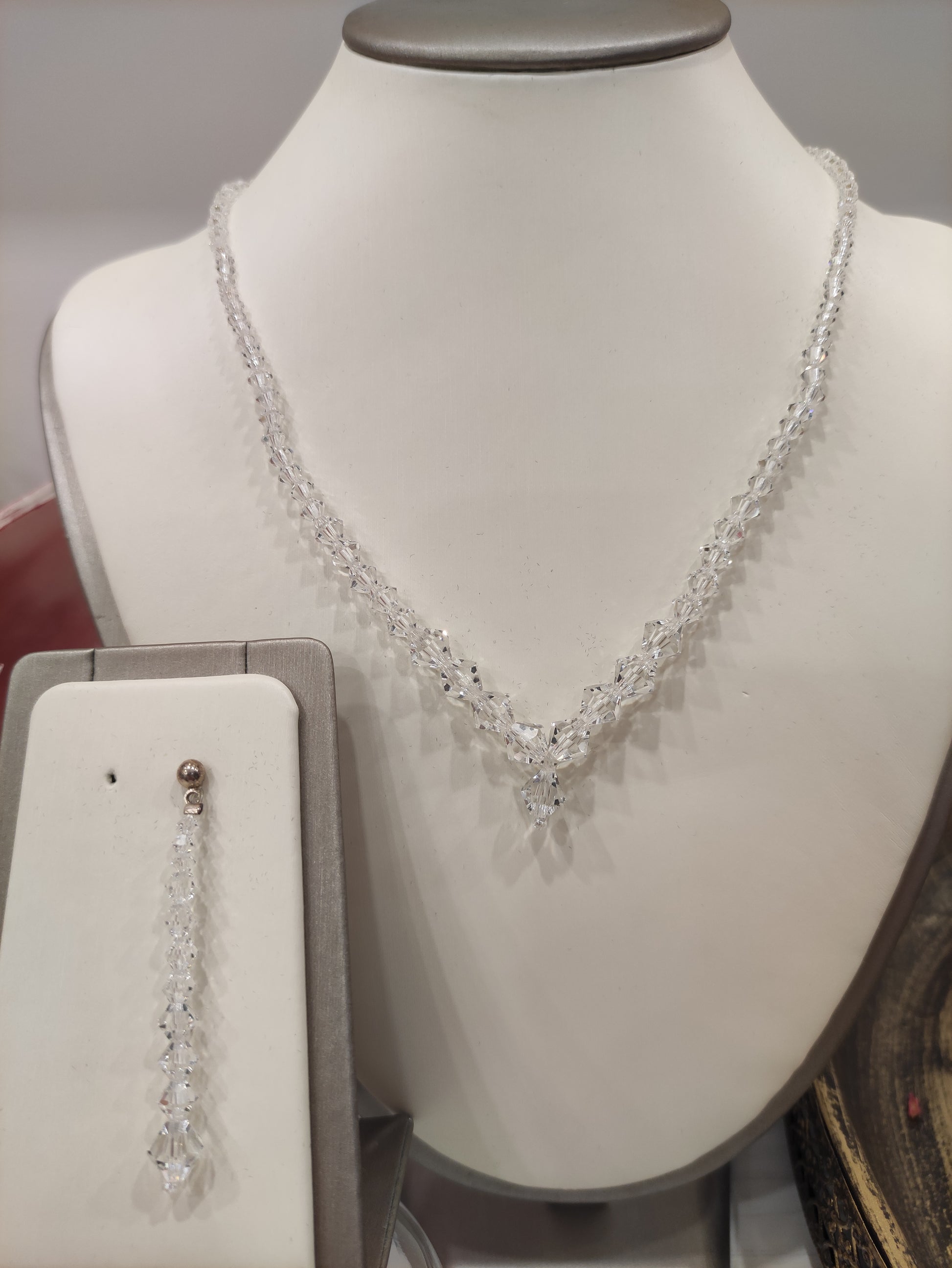 Parure composta da collana e orecchini in cristalli Swarovski. Chiusura con moschettone tradizionale e catenina regolabile, orecchini con chiusura a vite.