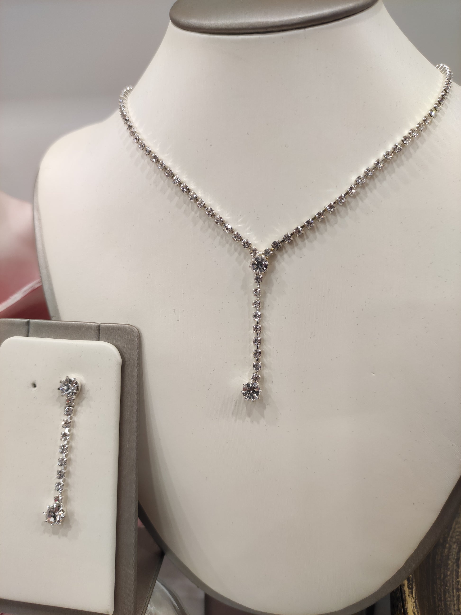Parure composta da collana e orecchini in strass Swarovski, con galvanica argento nickel free, chiusura con moschettone tradizionale e catenina regolabile, orecchini con chiusura a vite, personalizzabile con galvanica oro