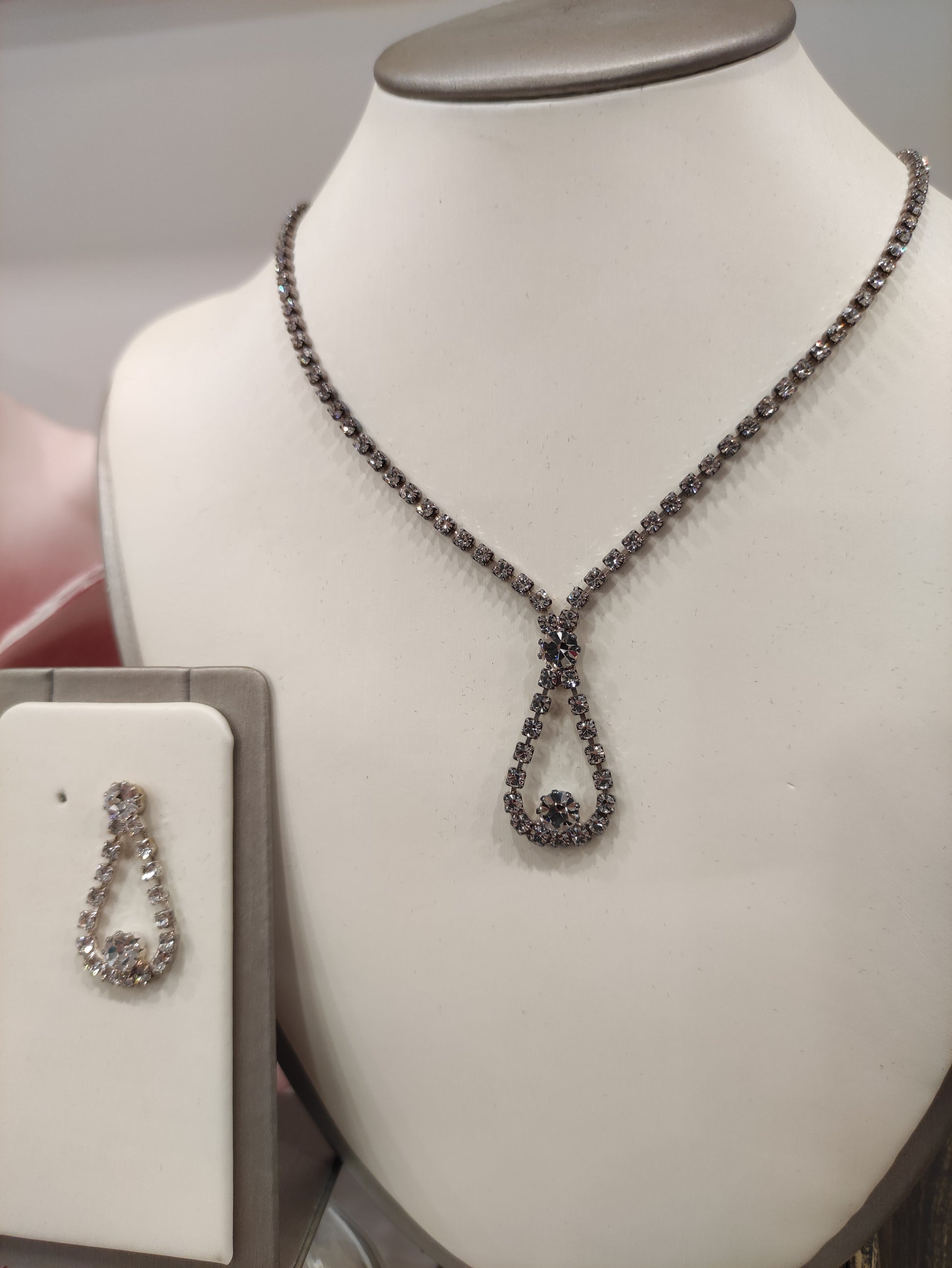 Parure composta da collana e orecchini in strass Swarovski, con galvanica argento nickel free, chiusura con moschettone tradizionale e catenina regolabile, orecchini con chiusura a vite, personalizzabile con galvanica oro