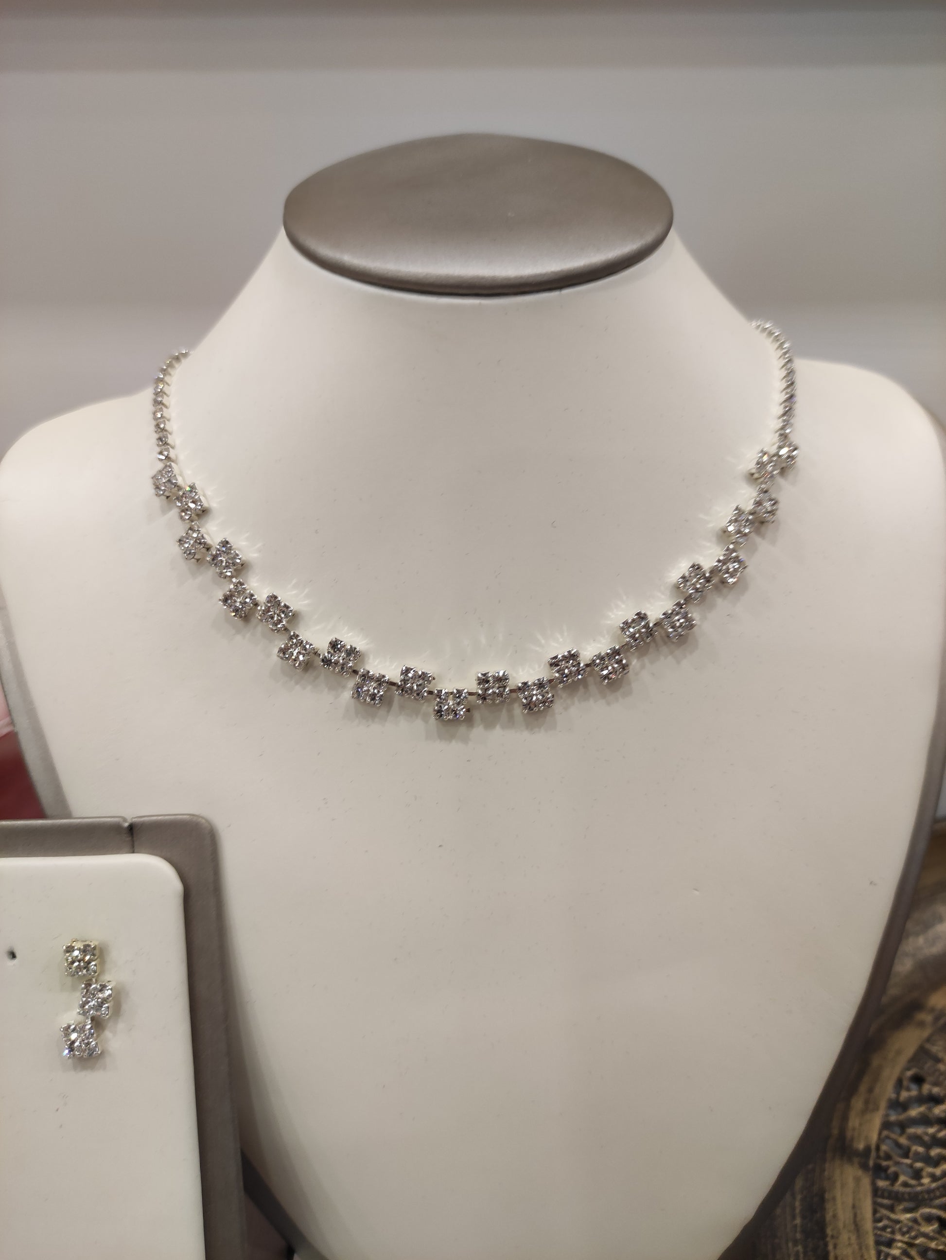 Parure composta da collana e orecchini in strass Swarovski, con galvanica argento nickel free, chiusura con moschettone tradizionale e catenina regolabile, orecchini con chiusura a vite, personalizzabile con galvanica oro
