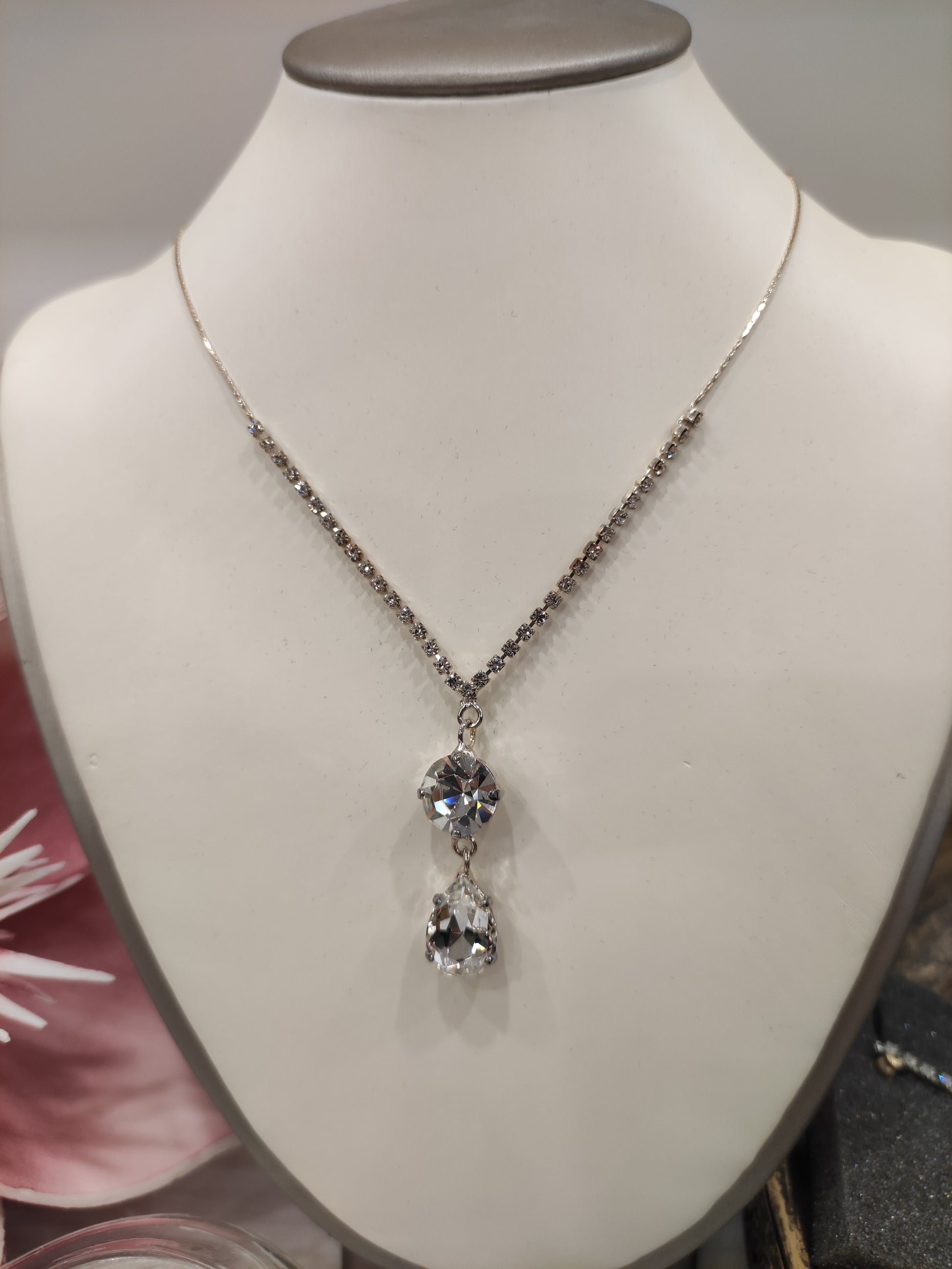 Parure composta da collana e orecchini in strass e pietre Swarovski, con galvanica argento nickel free, chiusura con moschettone tradizionale e catenina regolabile, orecchini con chiusura a vite, personalizzabile con galvanica oro