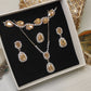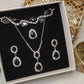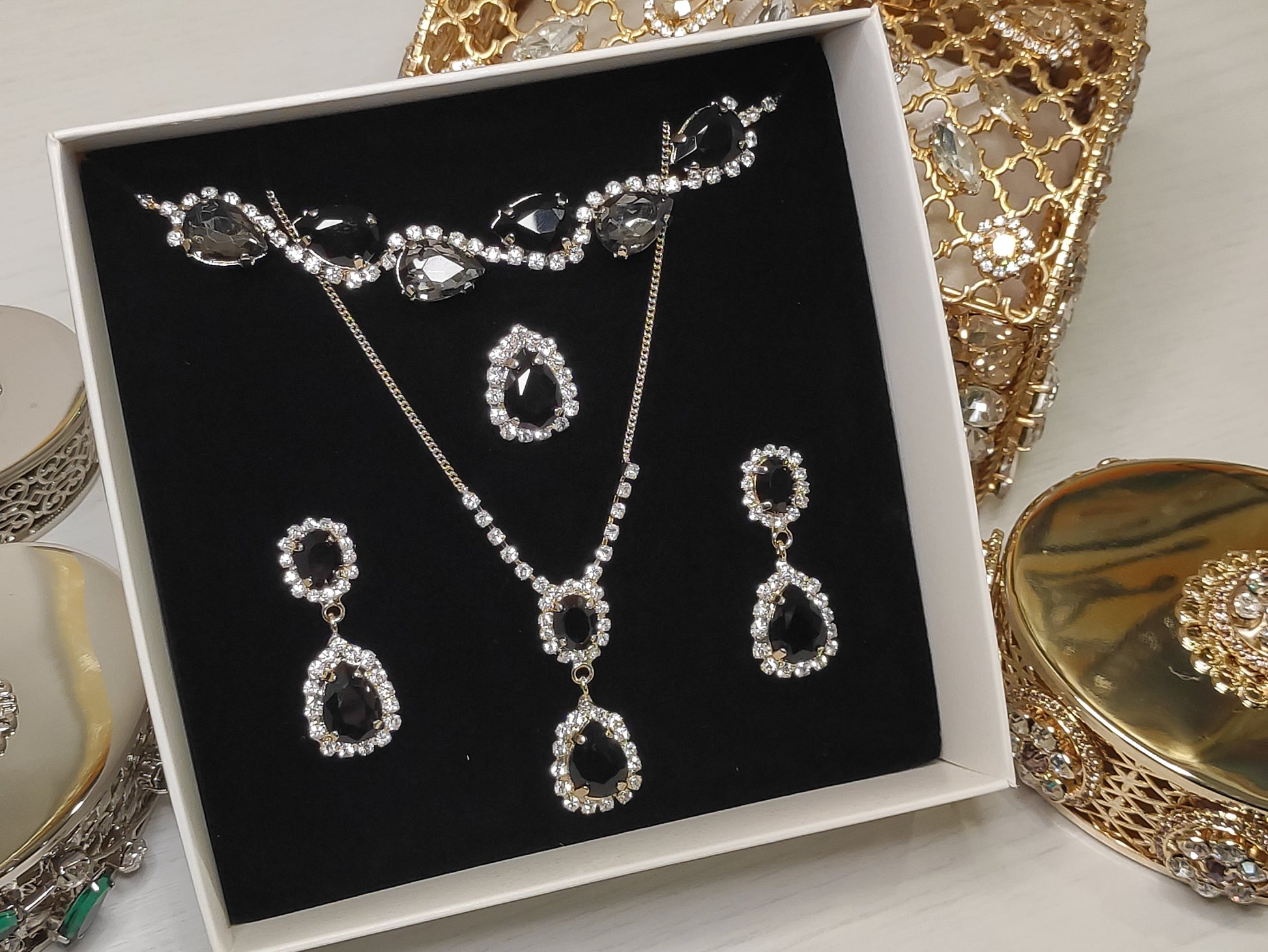 Parure composta da collana, orecchini, bracciale e anello in strass e pietre Swarovski con galvanica oro nickel free, chiusura con moschettone tradizionale e catenina regolabile, orecchini con chiusura a vite, personalizzabile con galvanica argento.