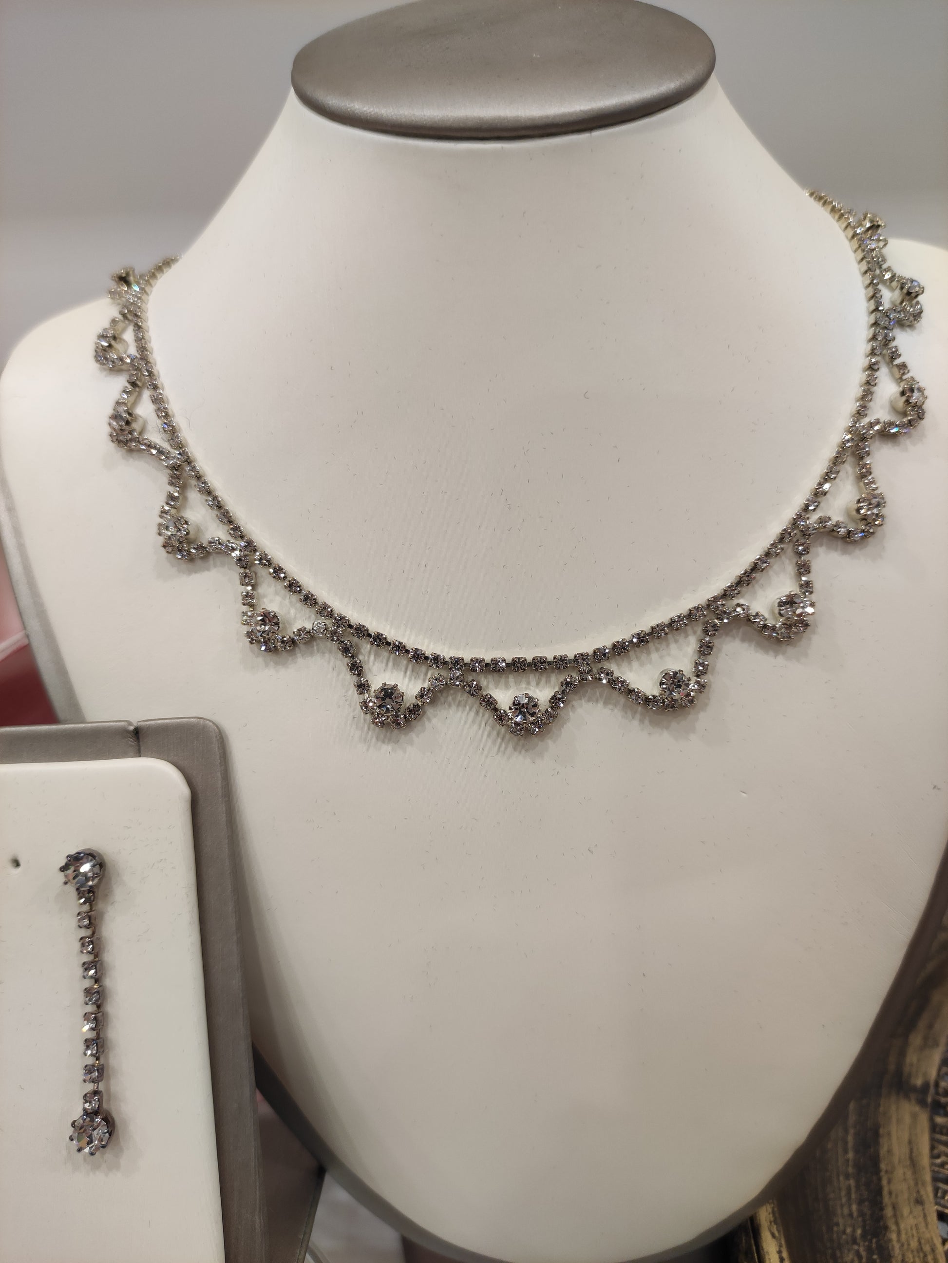 Parure composta da collana e orecchini in strass Swarovski, con galvanica argento nickel free, chiusura con moschettone tradizionale e catenina regolabile, orecchini con chiusura a vite, personalizzabile con galvanica oro