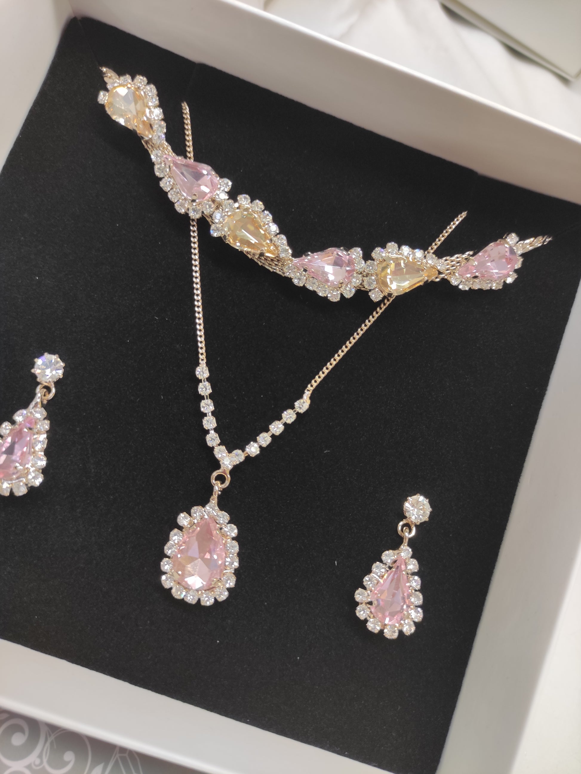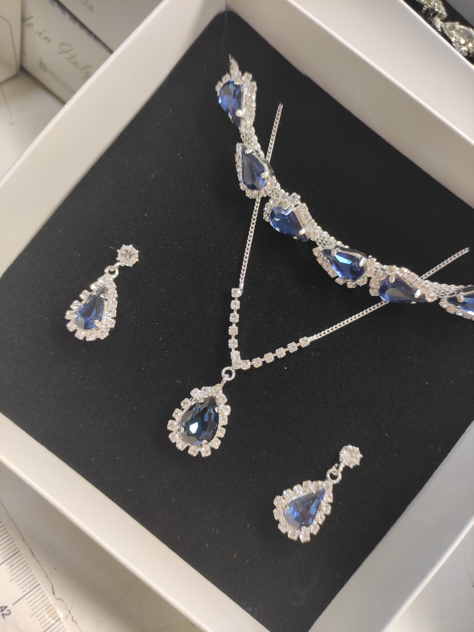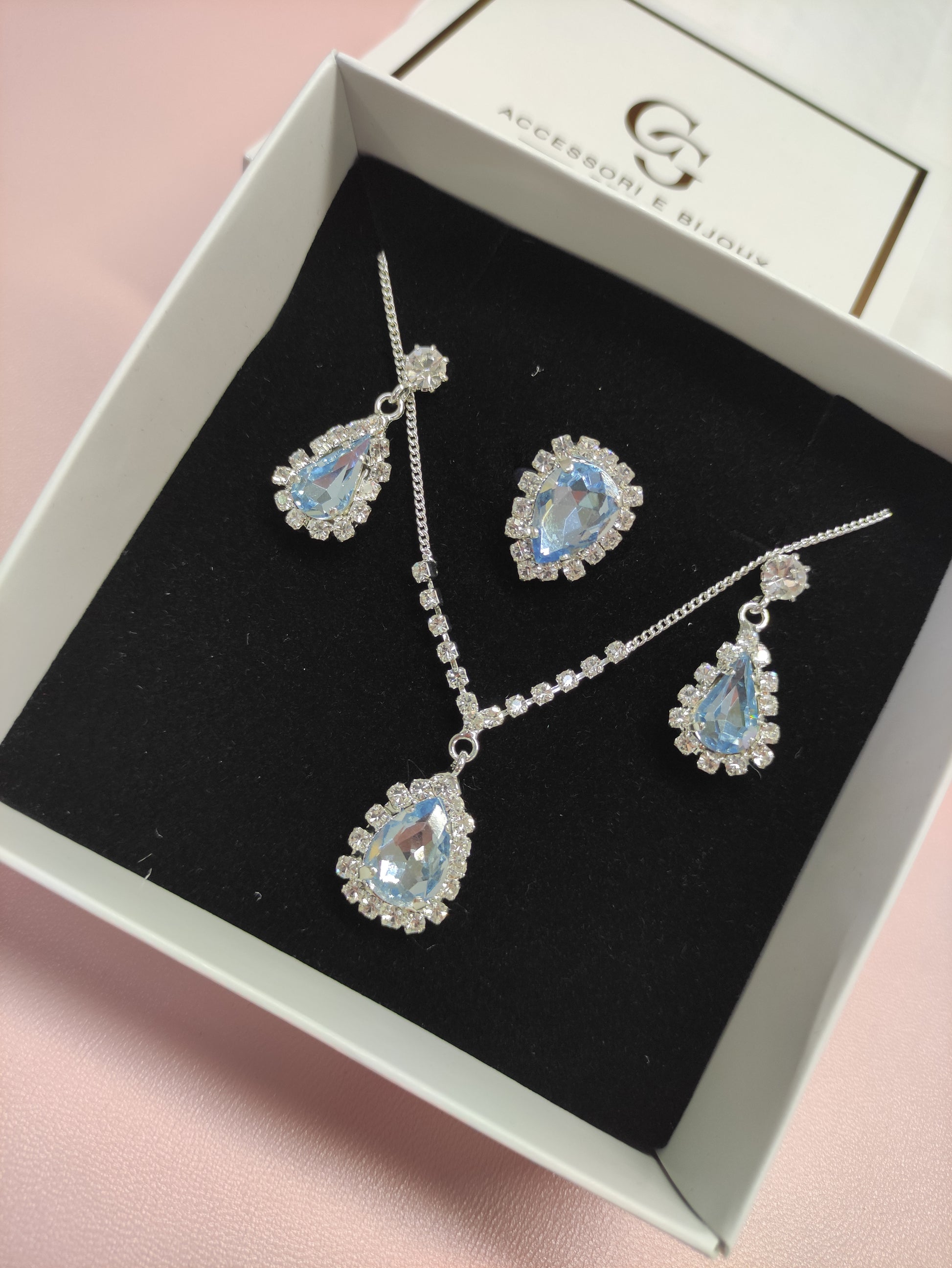 Parure composta da collana orecchini e bracciale in strass e pietre Swarovski, con galvanica argento nickel free, chiusura con moschettone tradizionale e catenina regolabile, orecchini con chiusura a vite, personalizzabile con galvanica oro