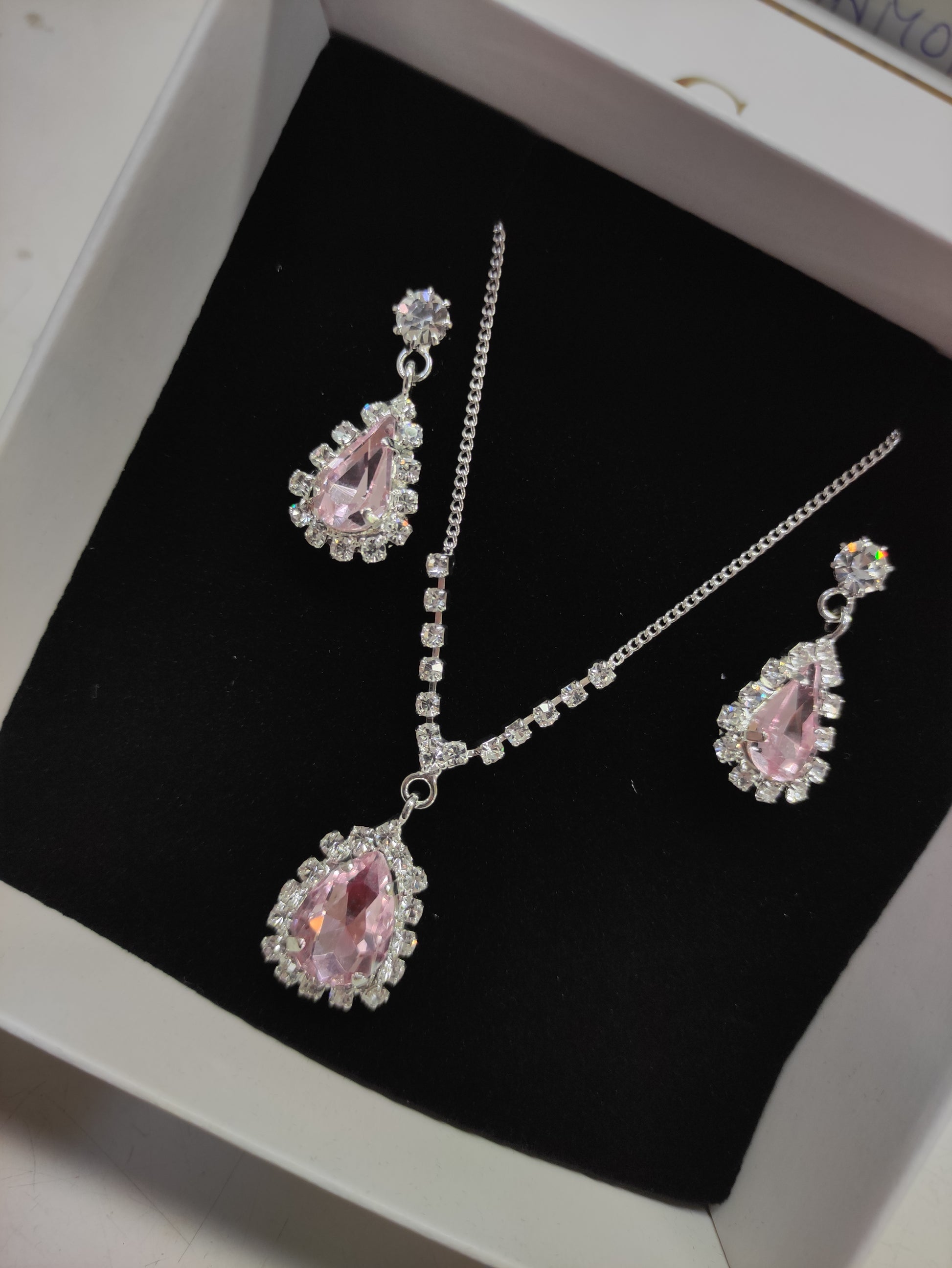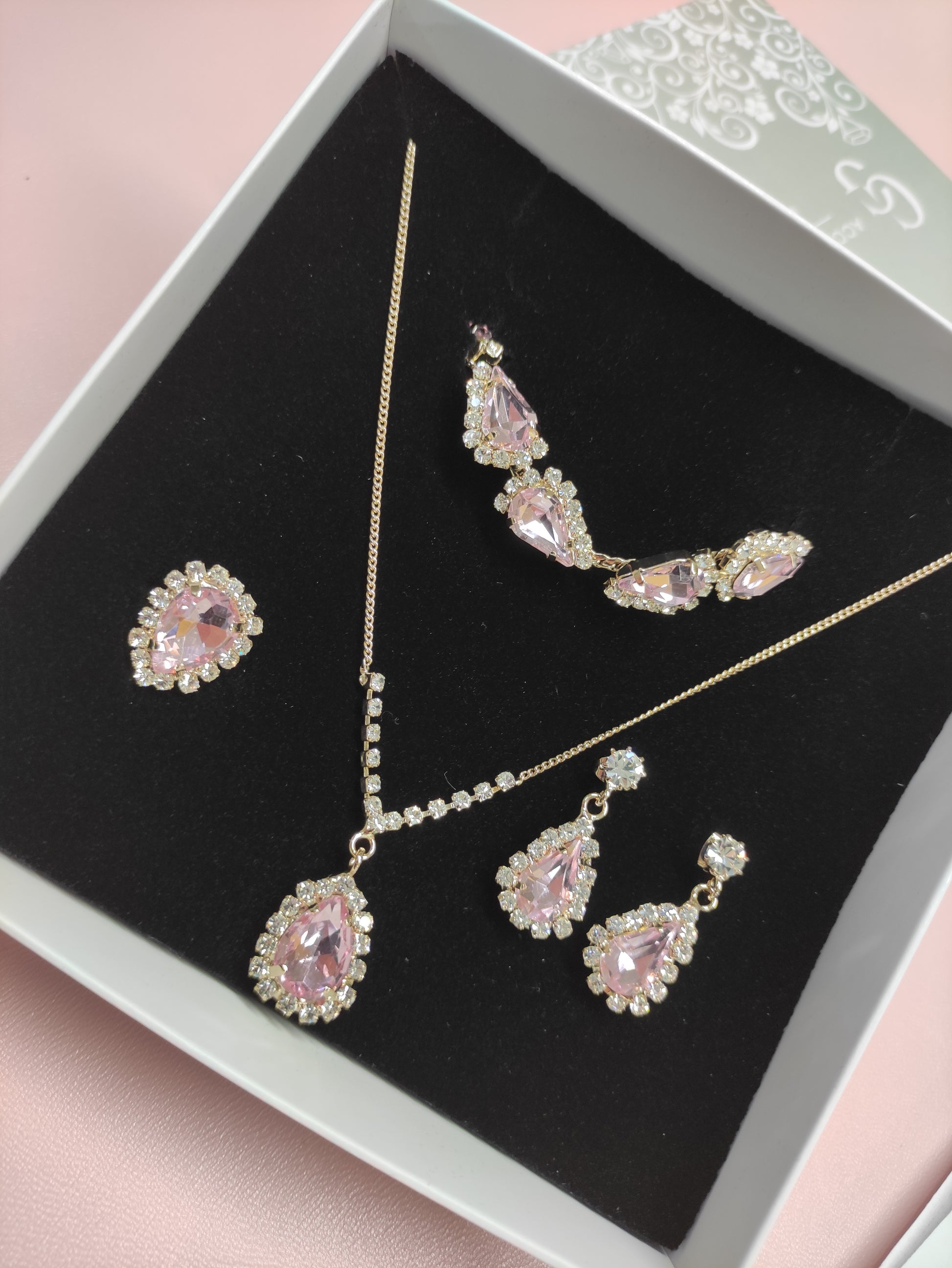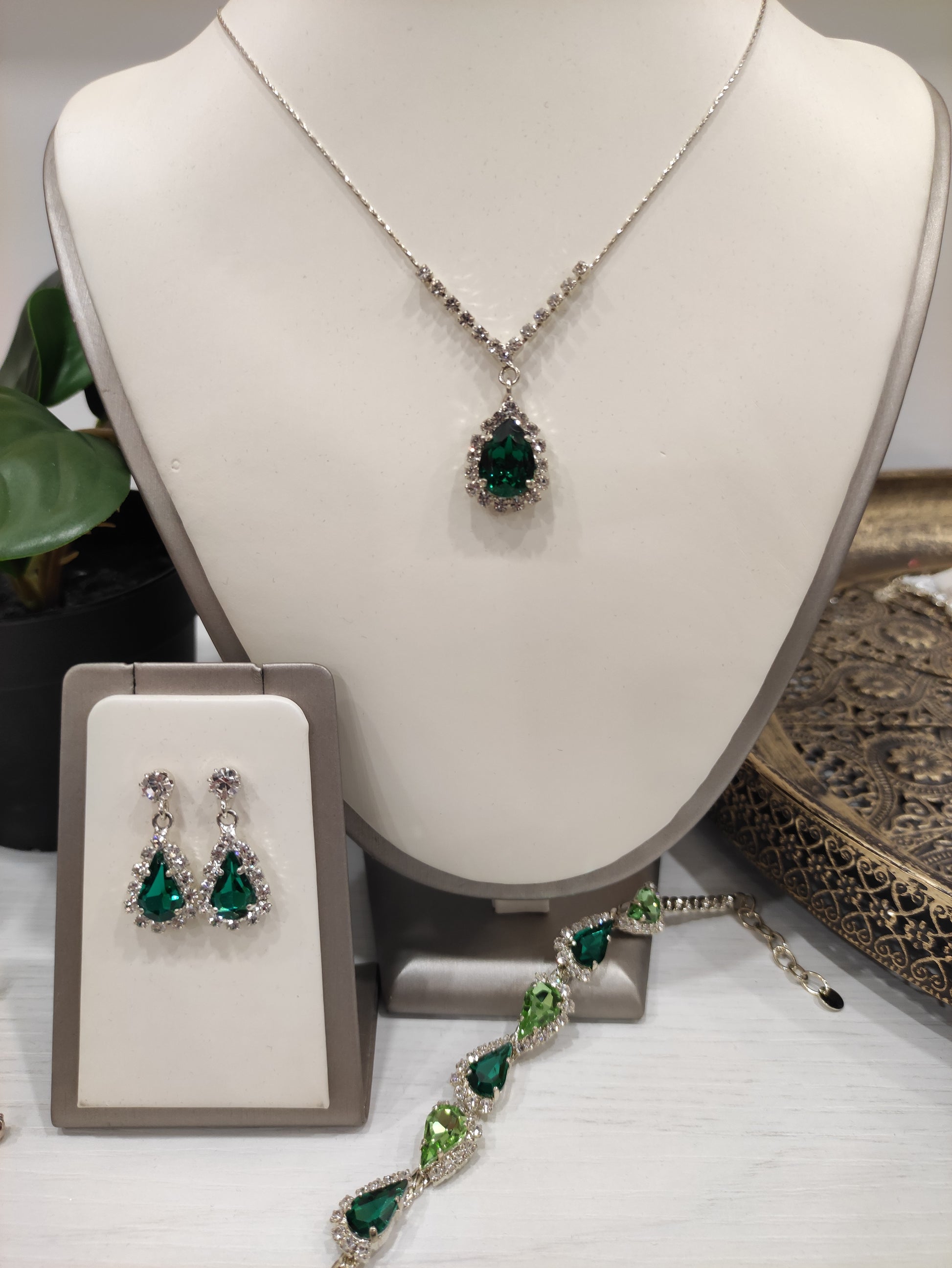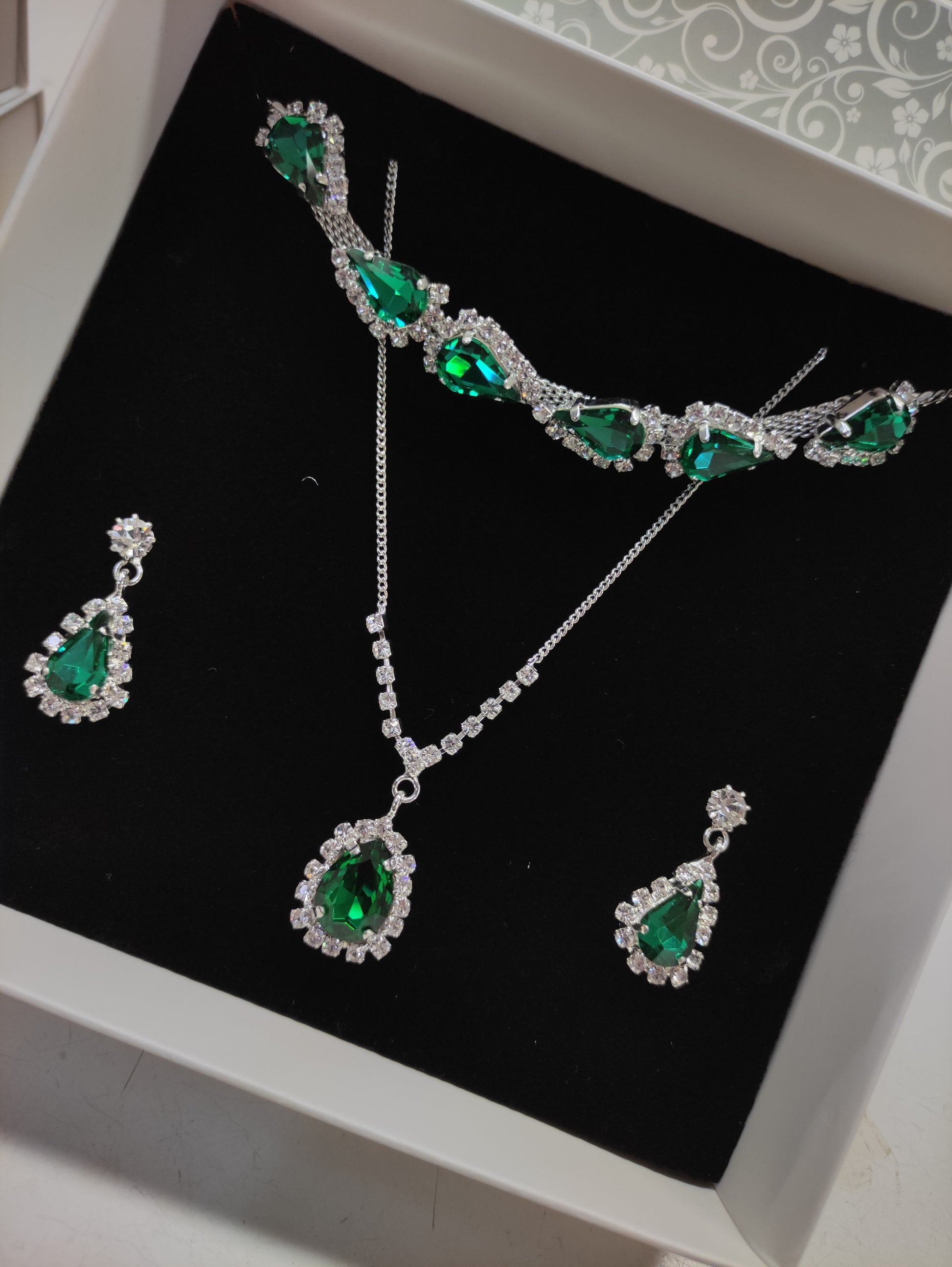 Parure composta da collana orecchini e bracciale in strass e pietre Swarovski, con galvanica argento nickel free, chiusura con moschettone tradizionale e catenina regolabile, orecchini con chiusura a vite, personalizzabile con galvanica oro