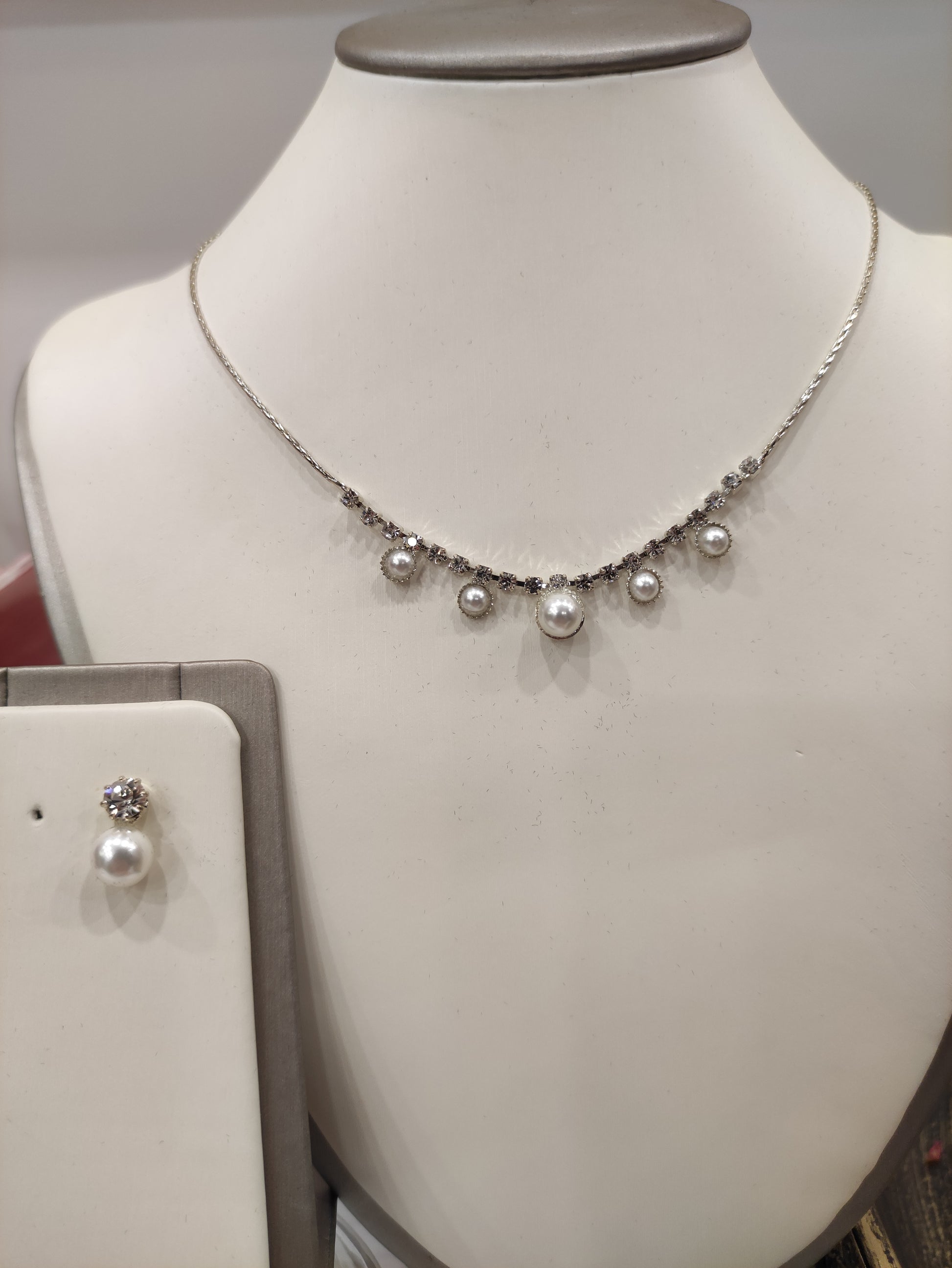 Parure composta da collana e orecchini in strass Swarovski e perle, con galvanica argento nickel free, chiusura con moschettone tradizionale e catenina regolabile, orecchini con chiusura a vite, personalizzabile con galvanica oro