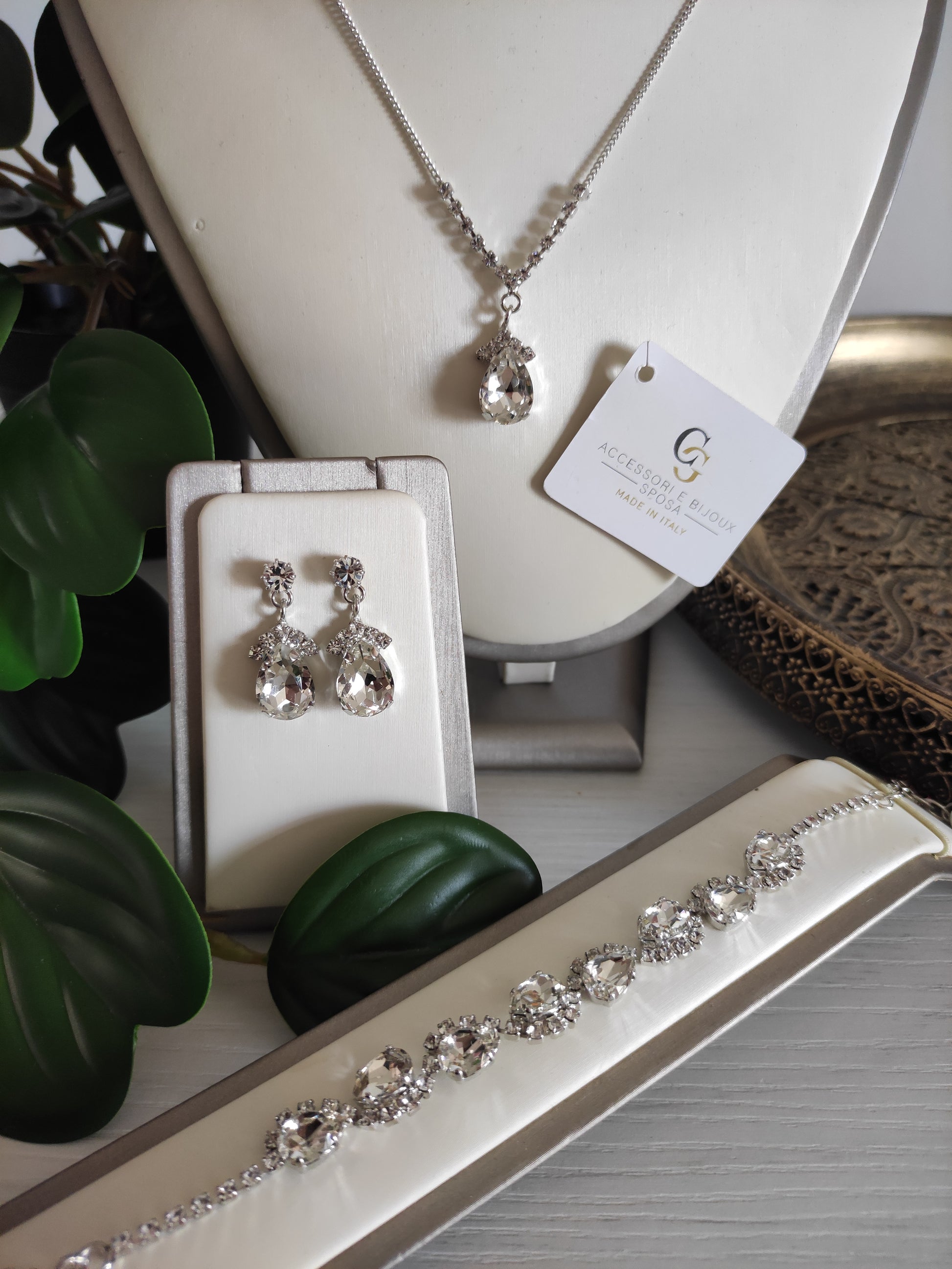 Parure composta da collana e orecchini in strass Swarovski, con galvanica argento nickel free, chiusura con moschettone tradizionale e catenina regolabile, orecchini con chiusura a vite, personalizzabile con galvanica oro