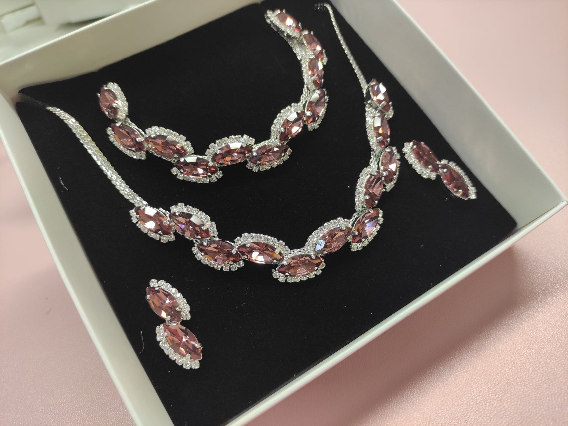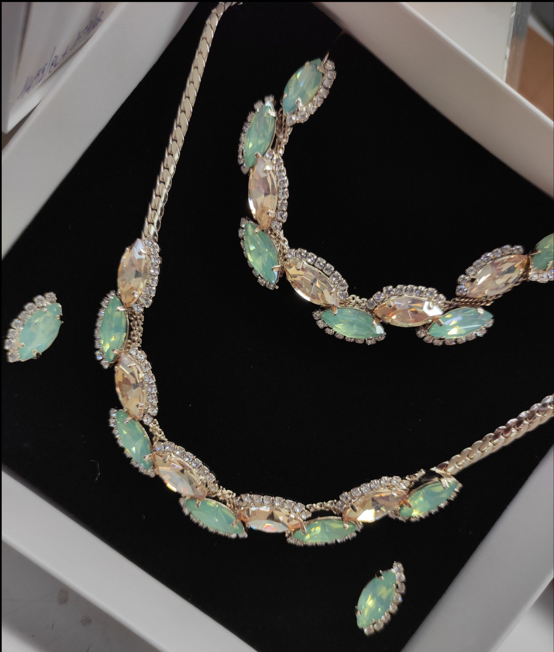 Parure composta da collana e orecchini in strass e pietre Swarovski con galvanica argento nickel free, chiusura con moschettone tradizionale e catenina regolabile, orecchini con chiusura a vite, personalizzabile con galvanica oro