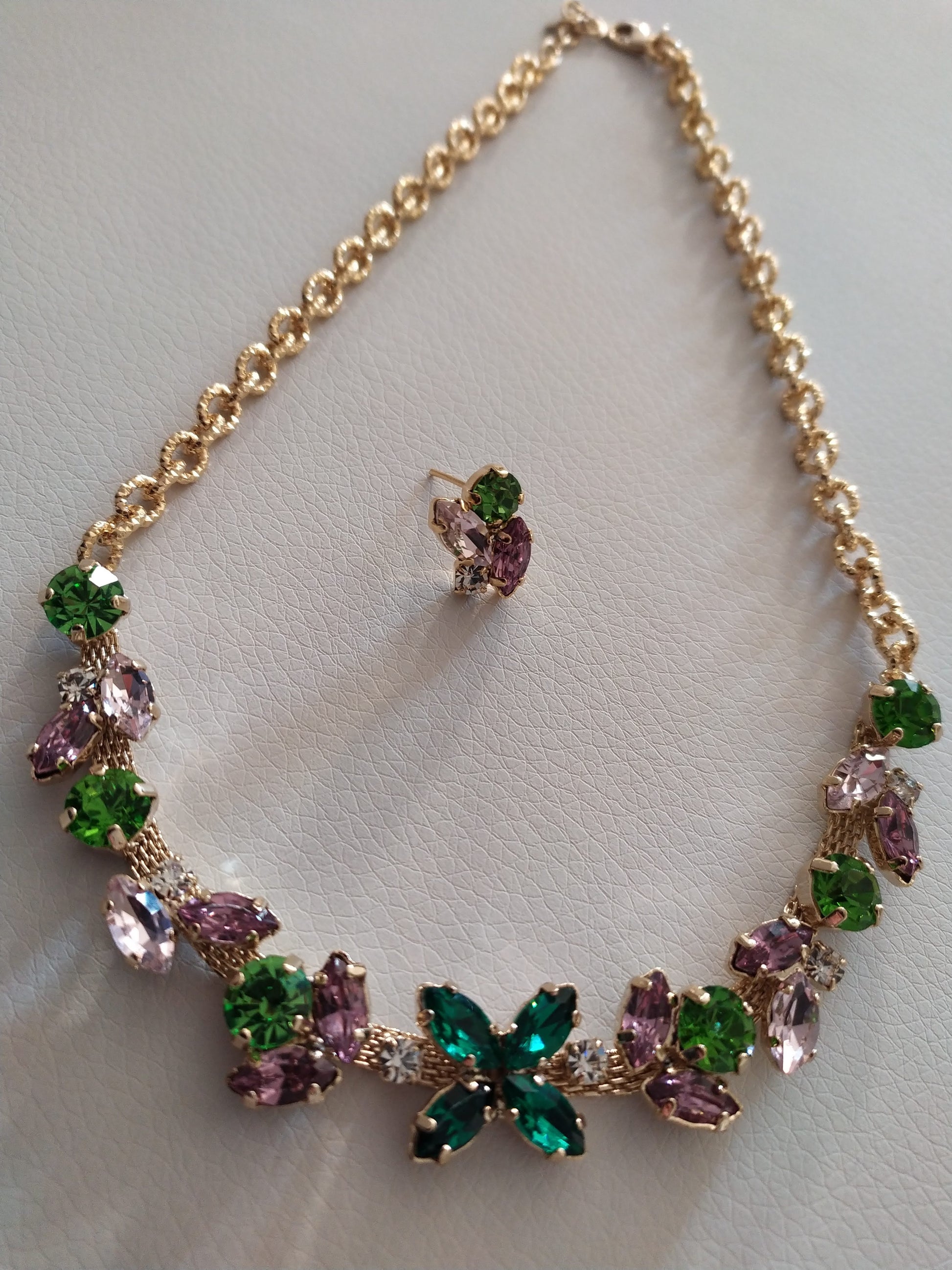 Parure composta da collana e orecchini in strass e pietre Swarovski, con galvanica oro nickel free, chiusura con moschettone tradizionale e catenina regolabile, orecchini con chiusura a vite, personalizzabile con galvanica argento