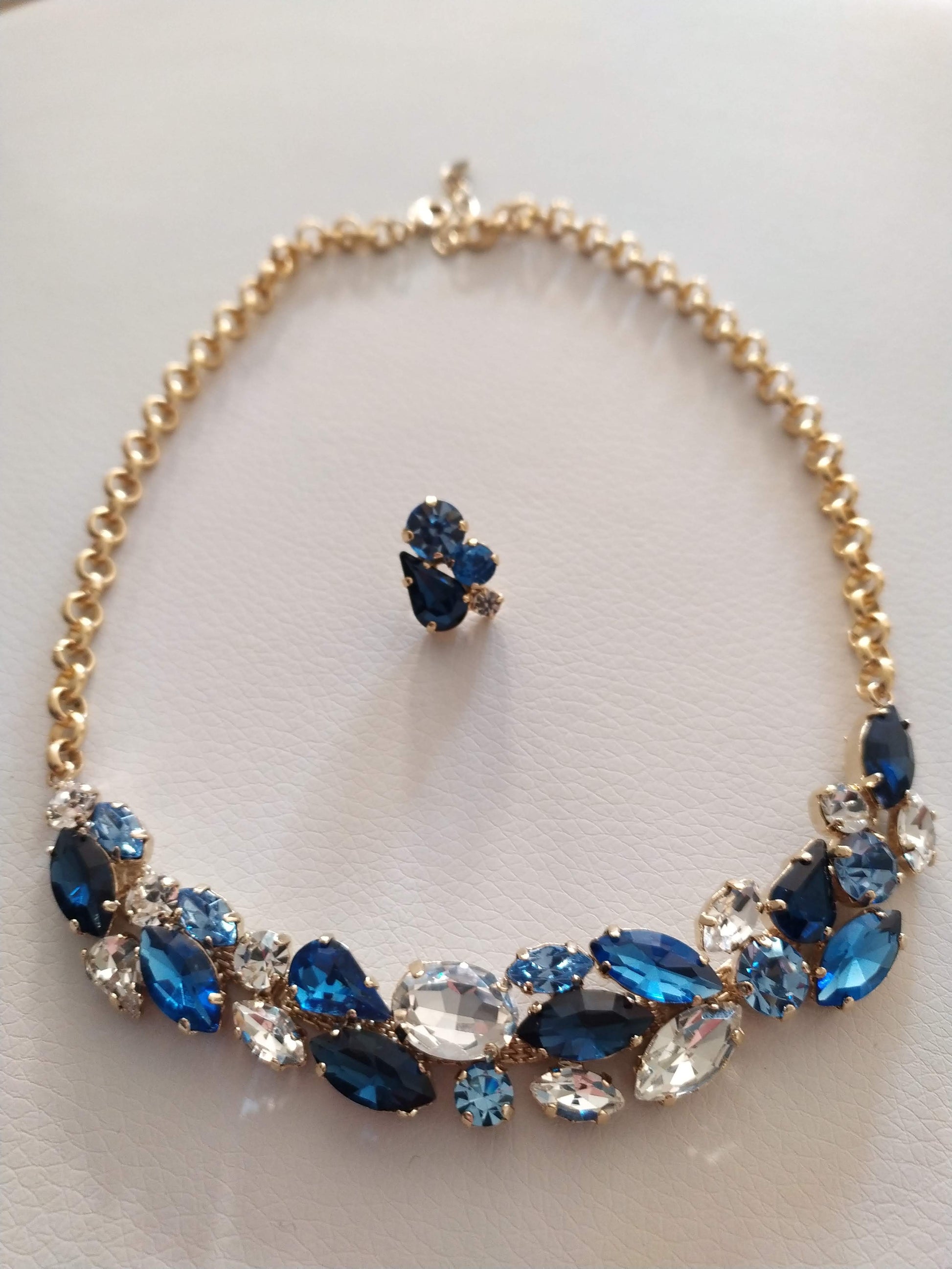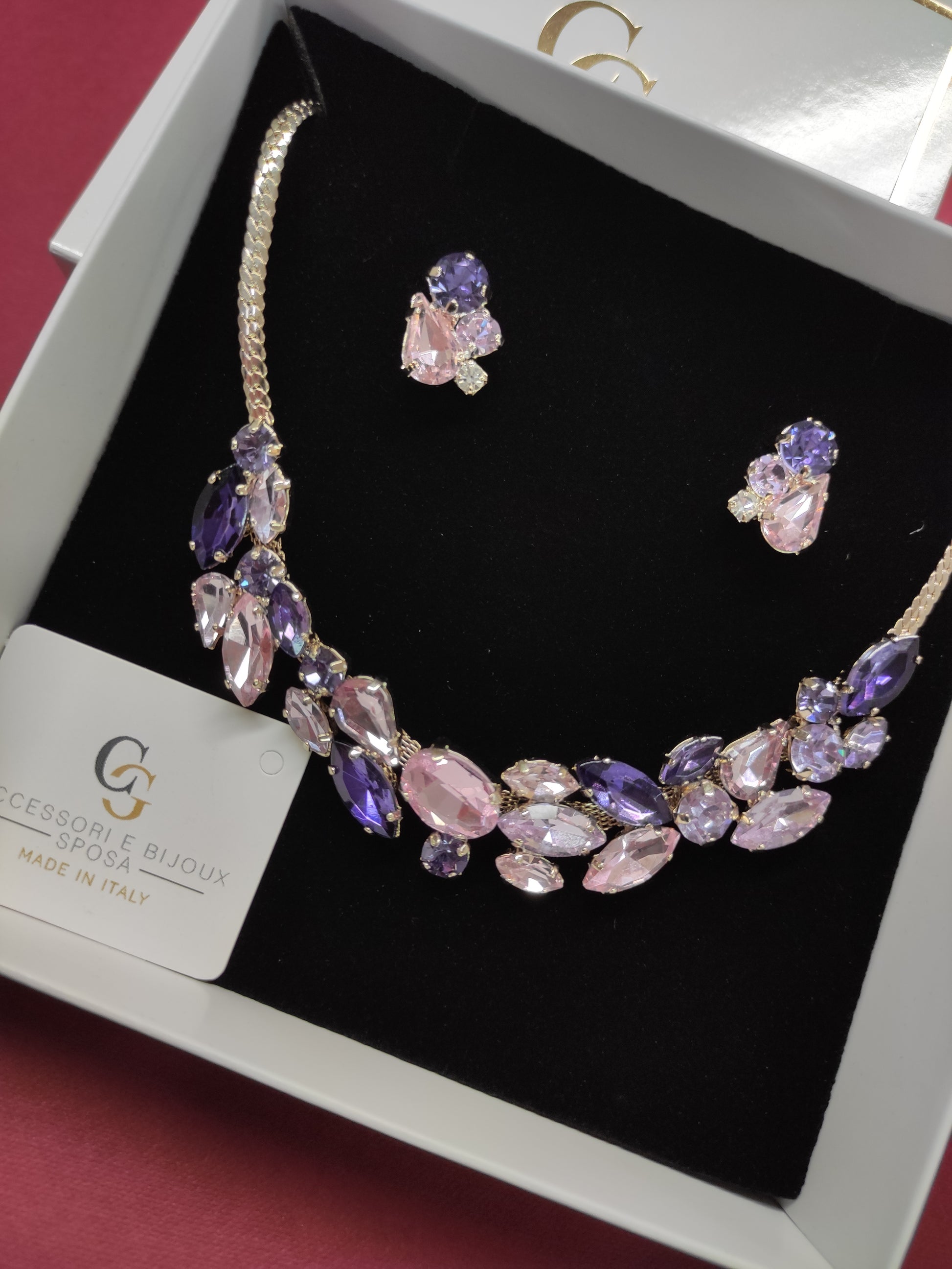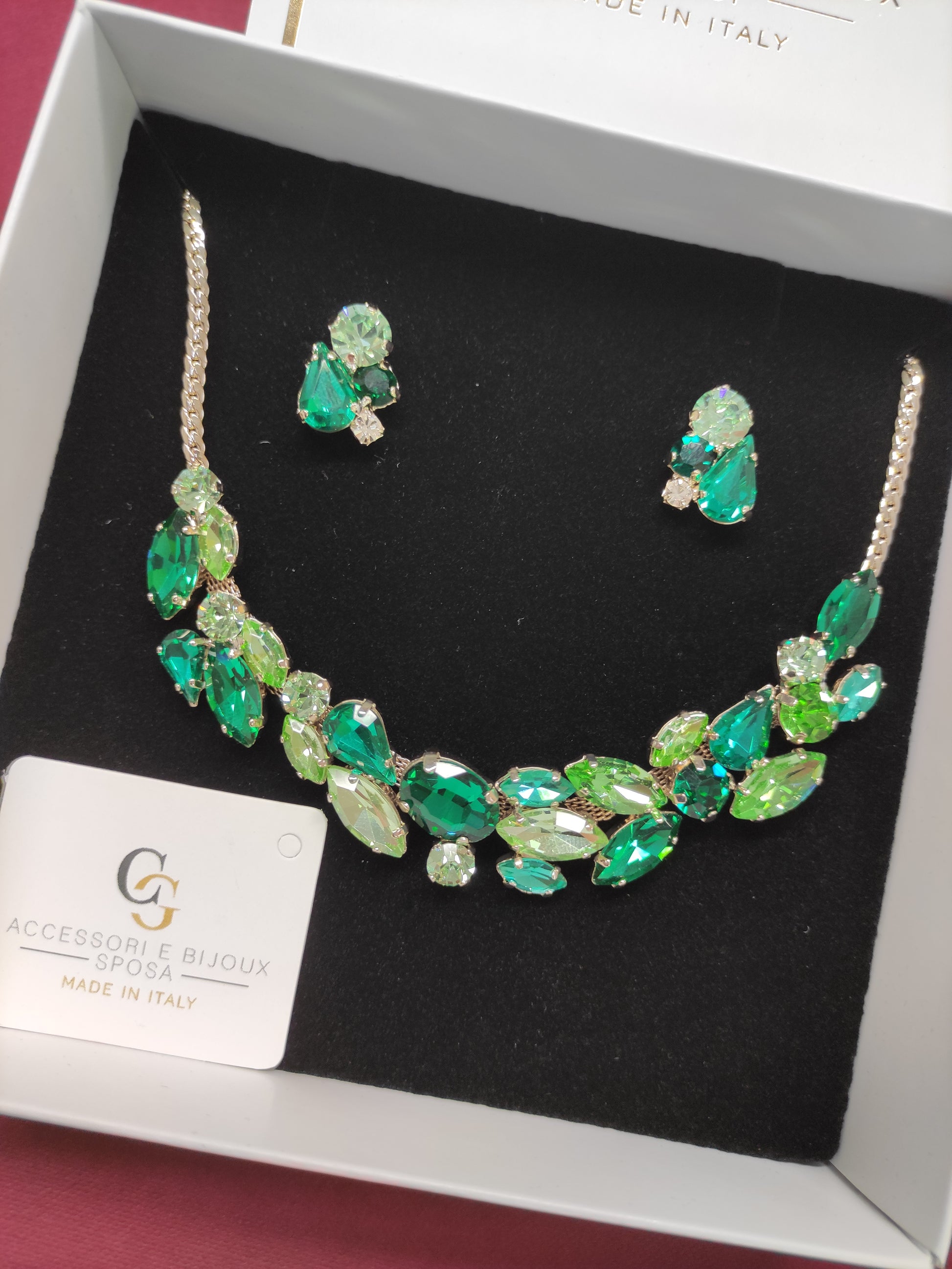 Parure composta da collana e orecchini in strass e pietre Swarovski, con galvanica oro nickel free, chiusura con moschettone tradizionale e catenina regolabile, orecchini con chiusura a vite, personalizzabile con galvanica argento