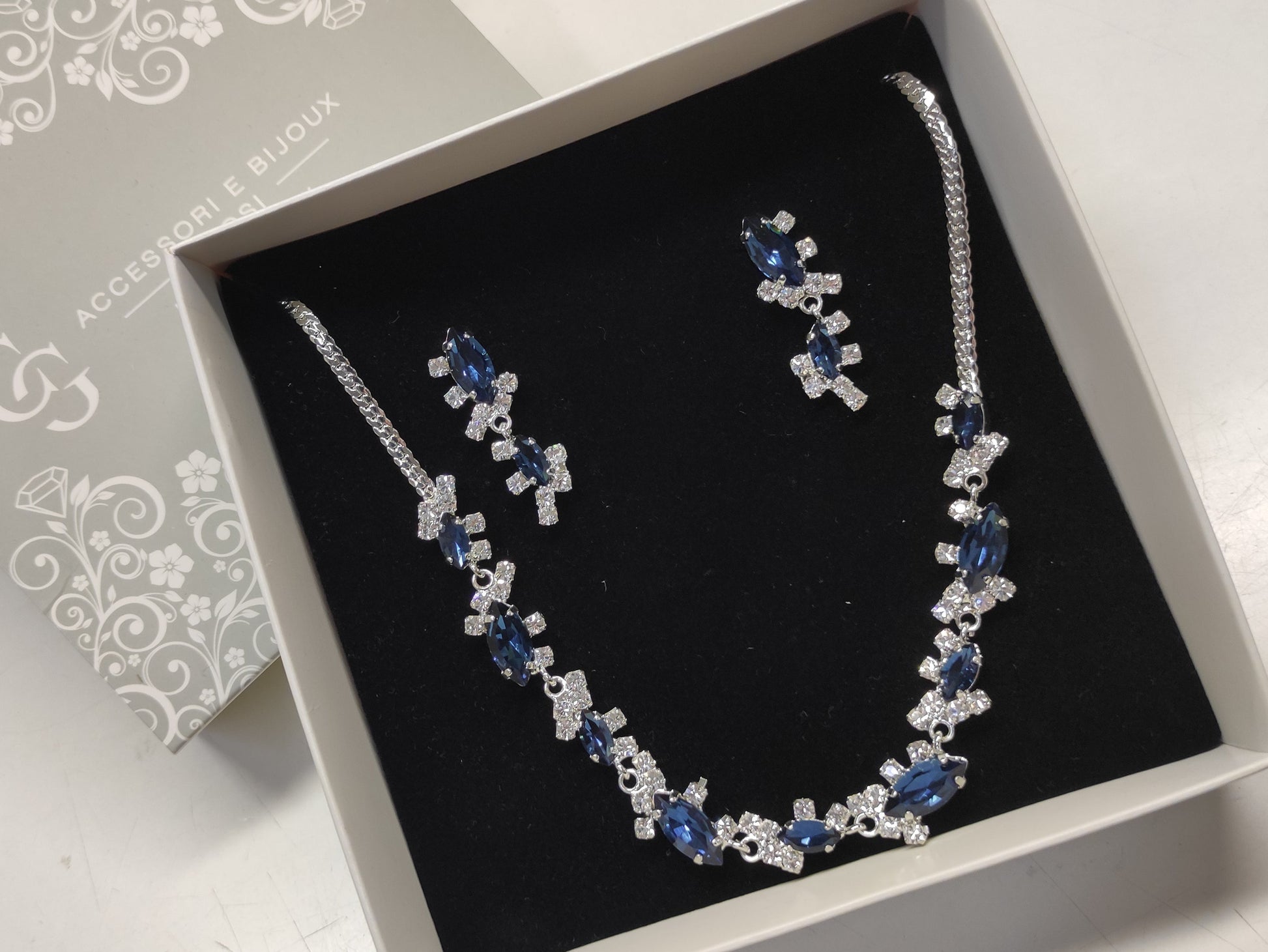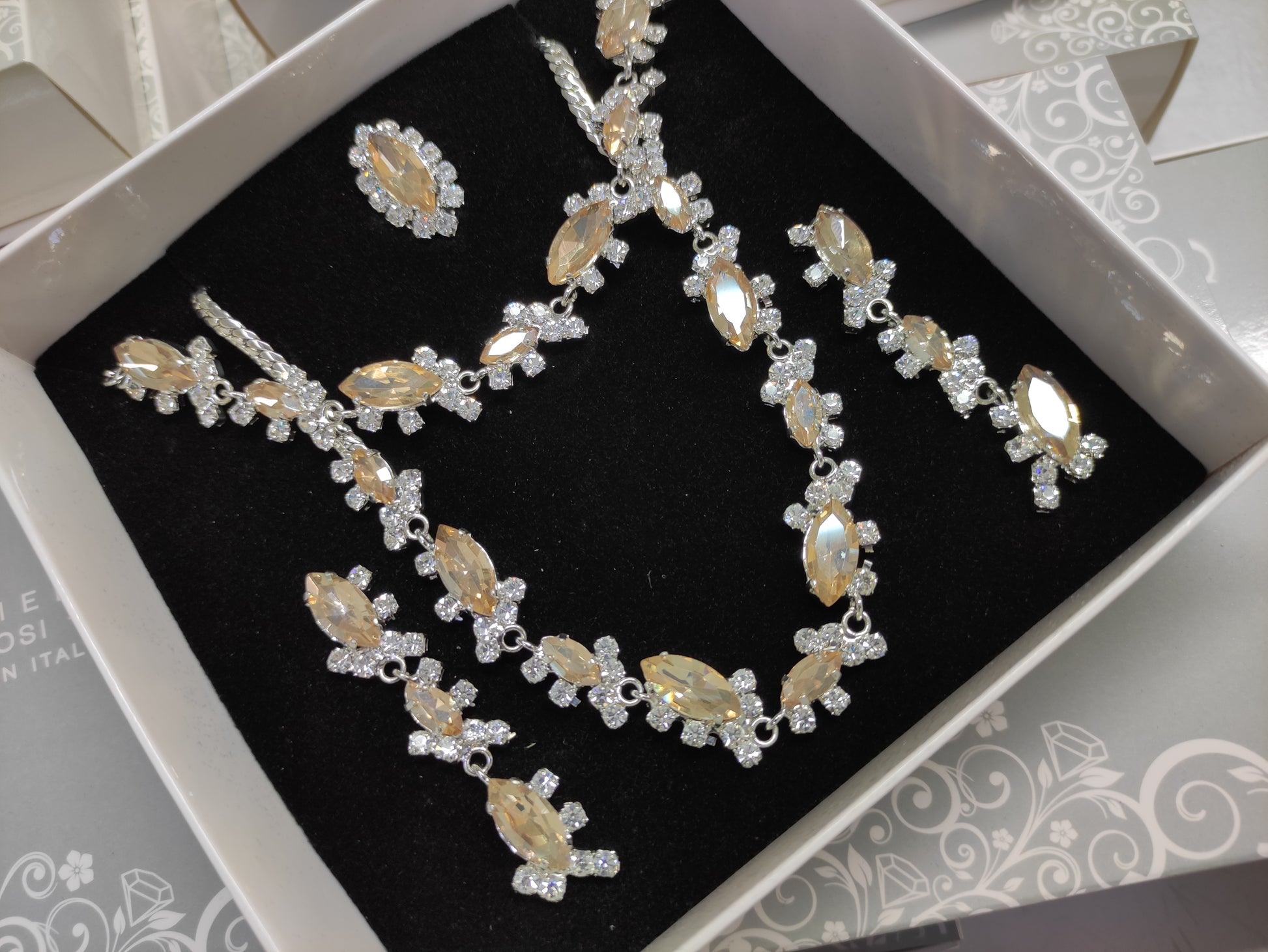 Parure composta da collana, orecchini, bracciale e anello in strass e pietre Swarovski, con galvanica oro nickel free, chiusura con moschettone tradizionale e catenina regolabile, orecchini con chiusura a vite, personalizzabile con galvanica argento.