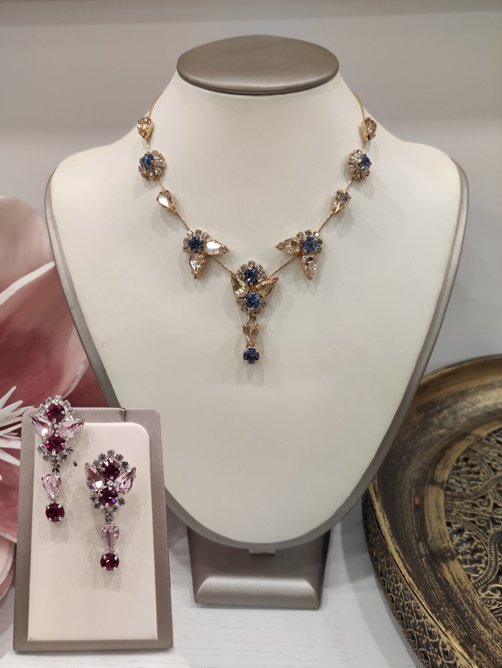 Parure composta da collana e orecchini in strass e pietre Swarovski con galvanica oro nickel free, chiusura con moschettone tradizionale e catenina regolabile, orecchini con chiusura a vite, personalizzabile con galvanica argento