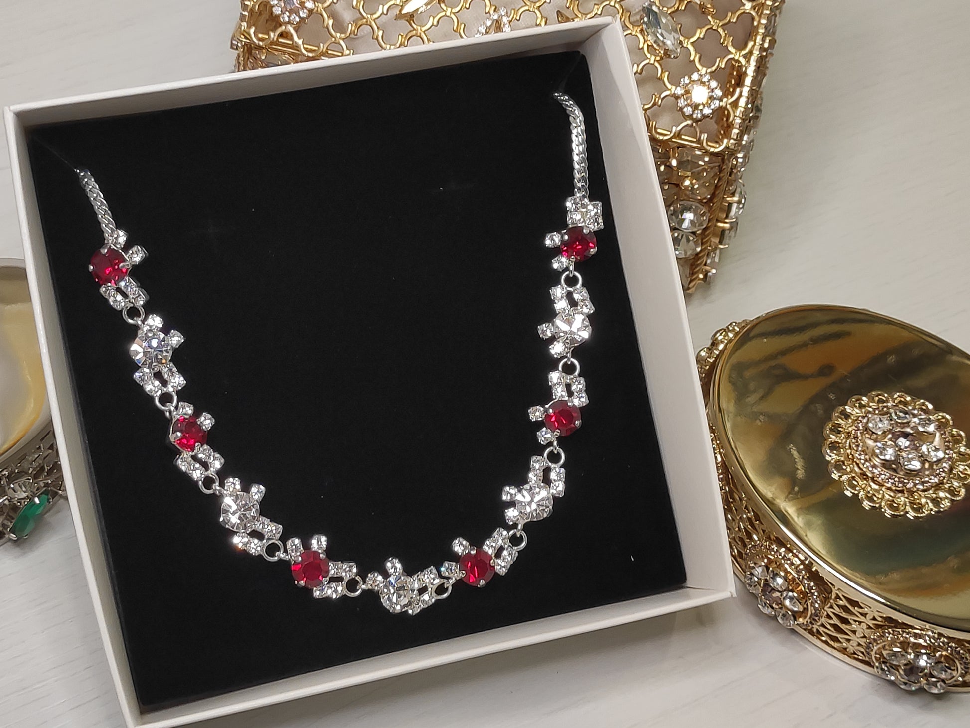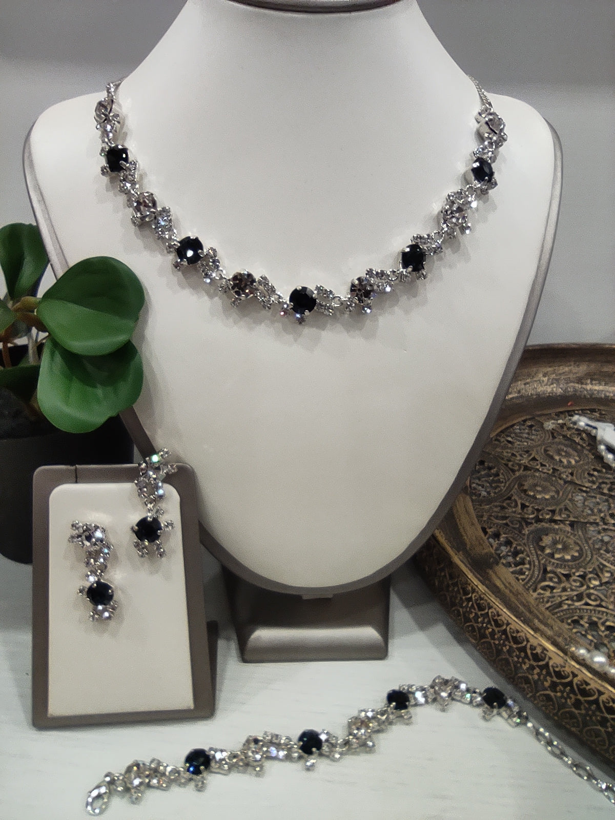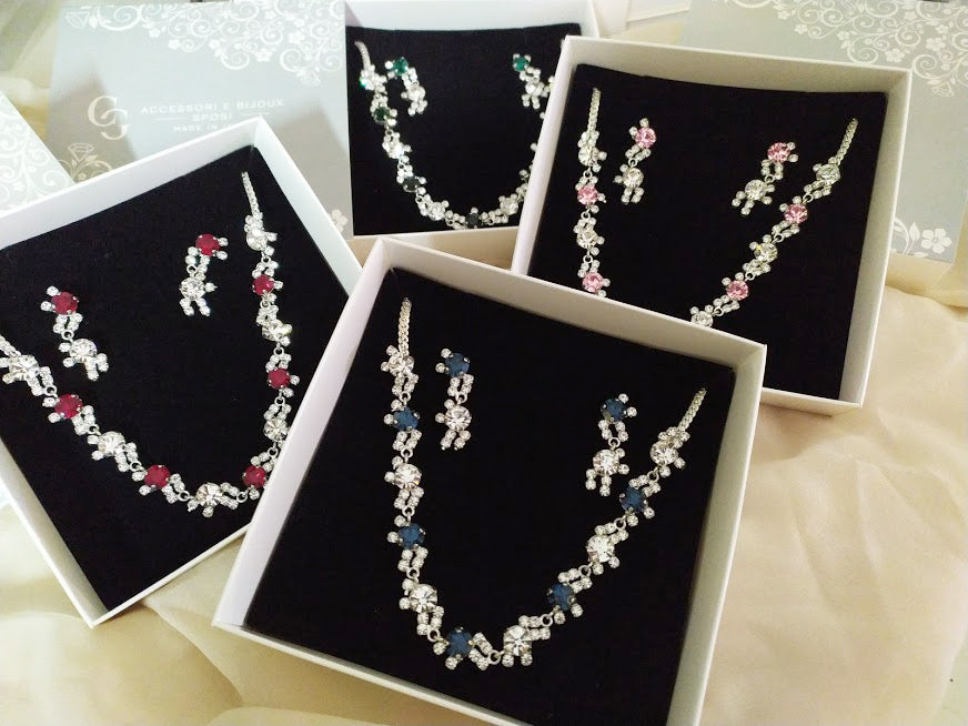 Parure composta da collana, orecchini e bracciale in strass e pietre Swarovski, con galvanica argento nickel free, chiusura con moschettone tradizionale e catenina regolabile, orecchini con chiusura a vite, personalizzabile con galvanica oro.