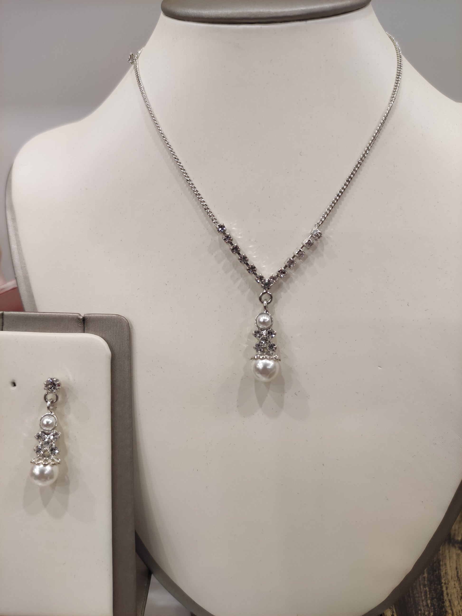 Parure composta da collana e orecchini in strass Swarovski e perle, con galvanica argento nickel free, chiusura con moschettone tradizionale e catenina regolabile, orecchini con chiusura a vite, personalizzabile con galvanica oro