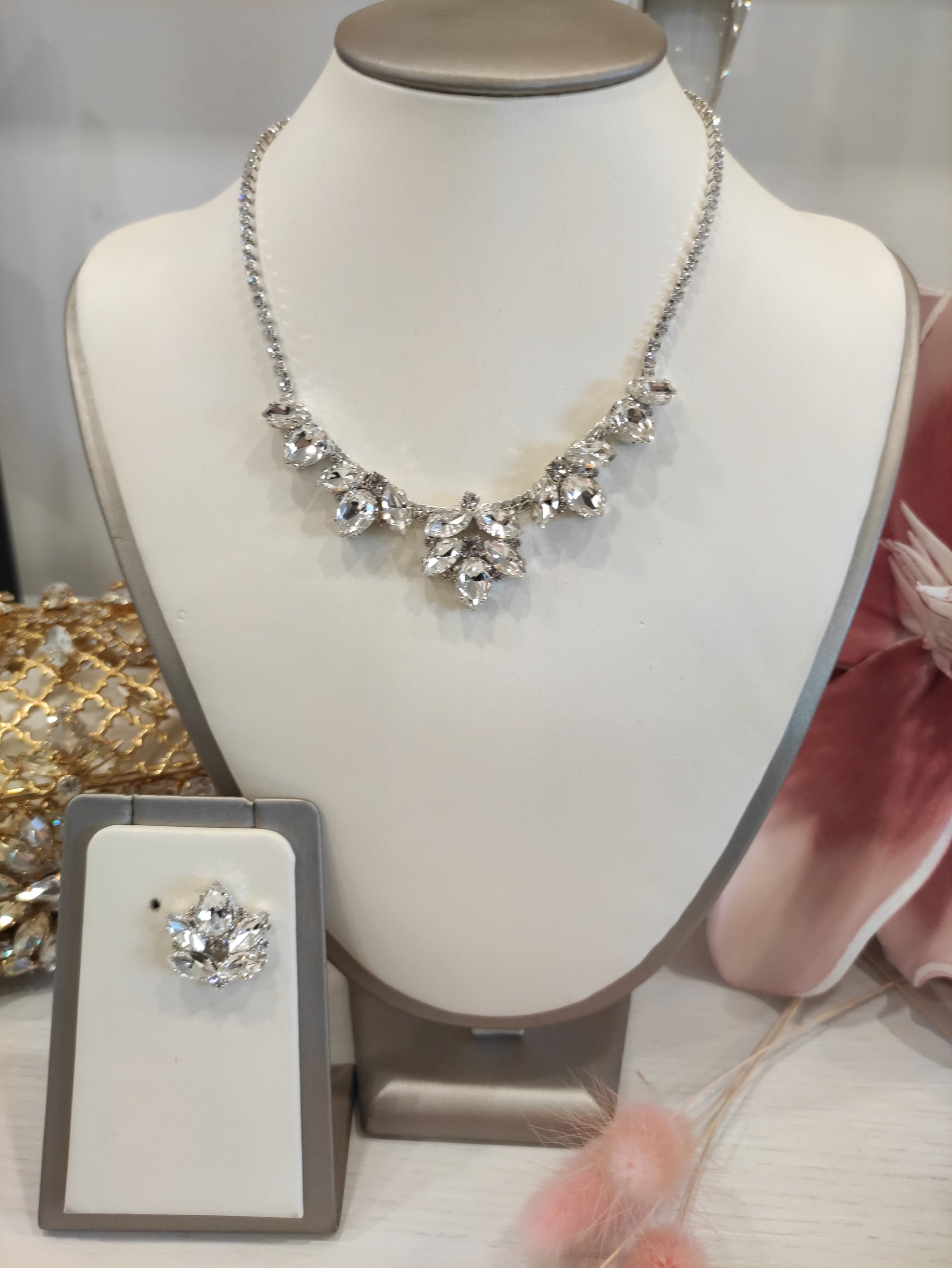 Parure composta da collana e orecchini in strass e pietre Swarovski, con galvanica argento nickel free, chiusura con moschettone tradizionale e catenina regolabile, orecchini con chiusura a vite, personalizzabile con galvanica oro.