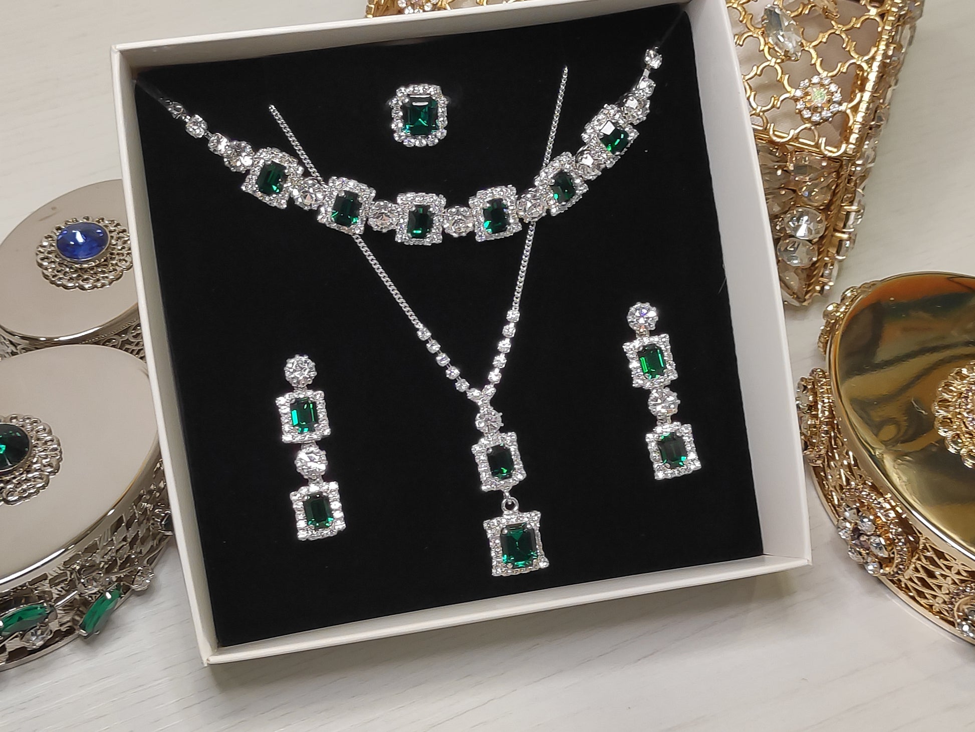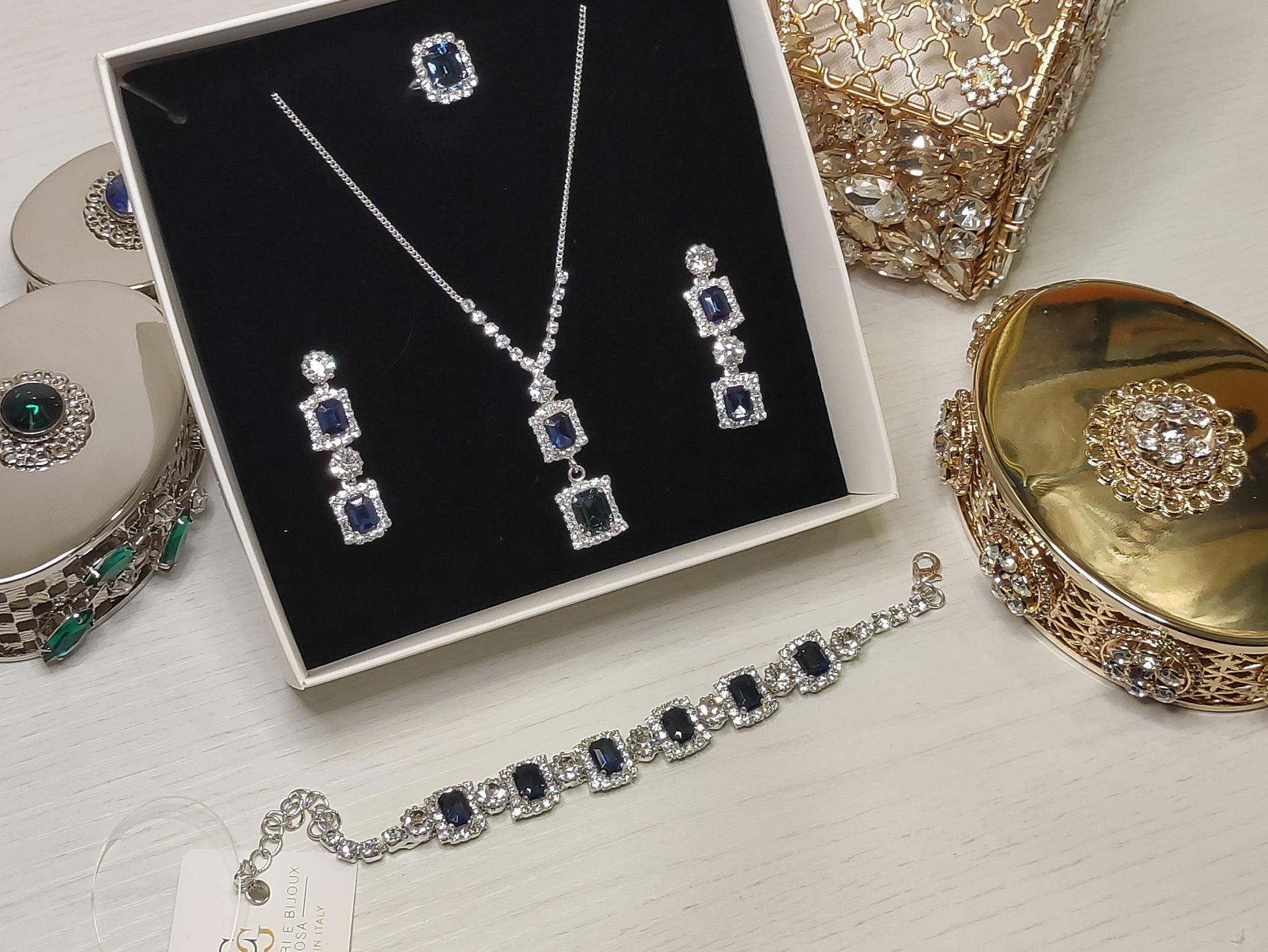 Parure composta da collana, orecchini, bracciale e anello in strass e pietre Swarovski con galvanica argento nickel free, chiusura con moschettone tradizionale e catenina regolabile, orecchini con chiusura a vite, personalizzabile con galvanica oro.