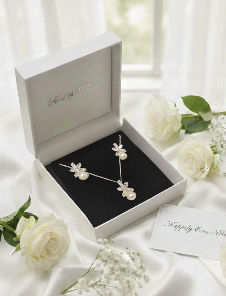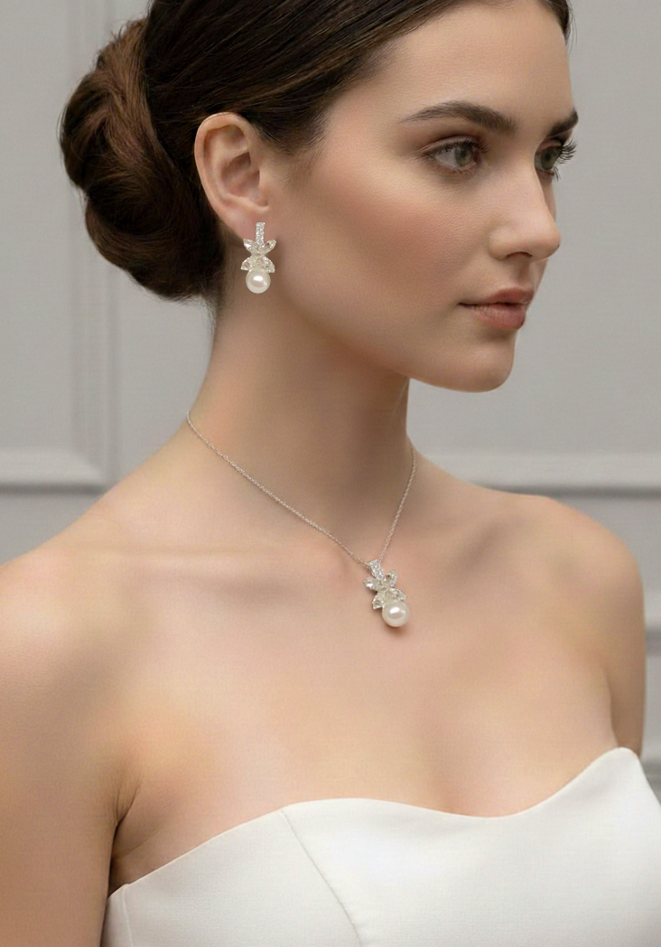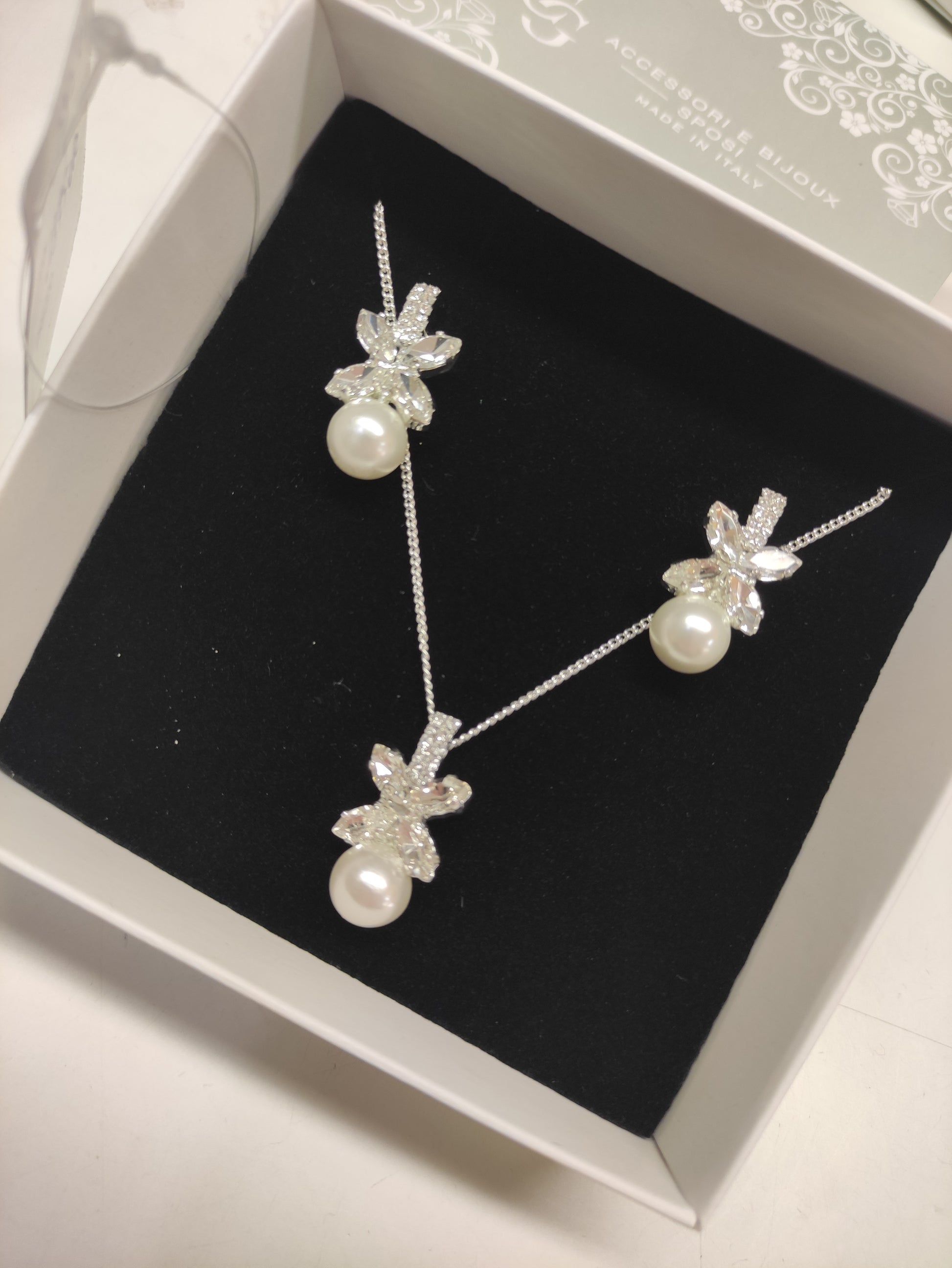 Parure composta da collana e orecchini in strass e pietre Swarovski e perle, con galvanica argento nickel free, chiusura con moschettone tradizionale e catenina regolabile, orecchini con chiusura a vite, personalizzabile con galvanica oro.