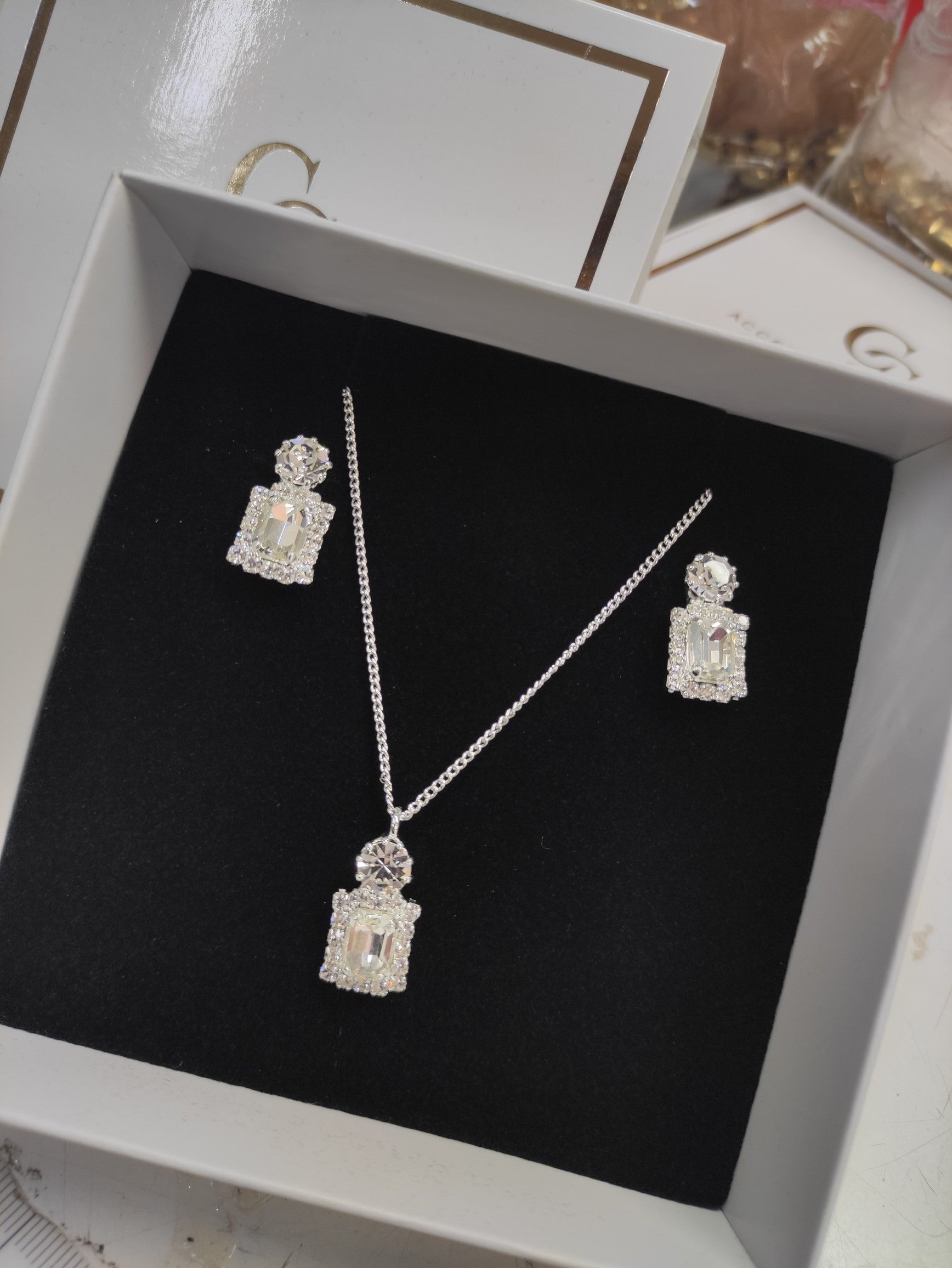 Parure composta da collana e orecchini in strass e pietre Swarovski, con galvanica argento nickel free, chiusura con moschettone tradizionale e catenina regolabile, orecchini con chiusura a vite, personalizzabile con galvanica oro