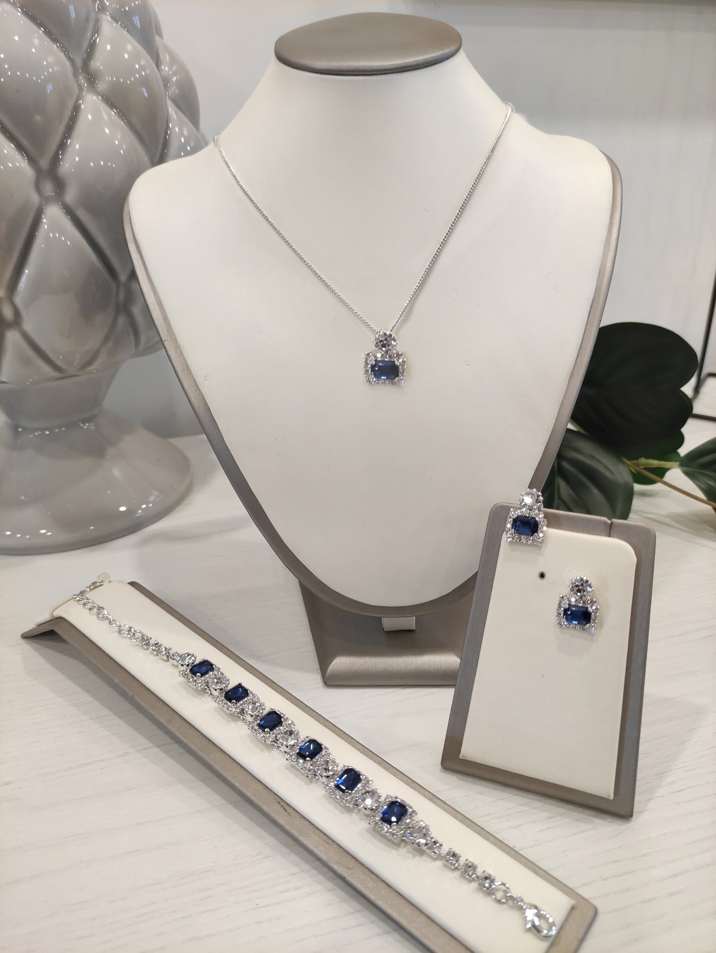 Parure composta da collana, orecchini e bracciale in strass e pietre Swarovski, con galvanica argento nickel free, chiusura con moschettone tradizionale e catenina regolabile, orecchini con chiusura a vite, personalizzabile con galvanica oro.
