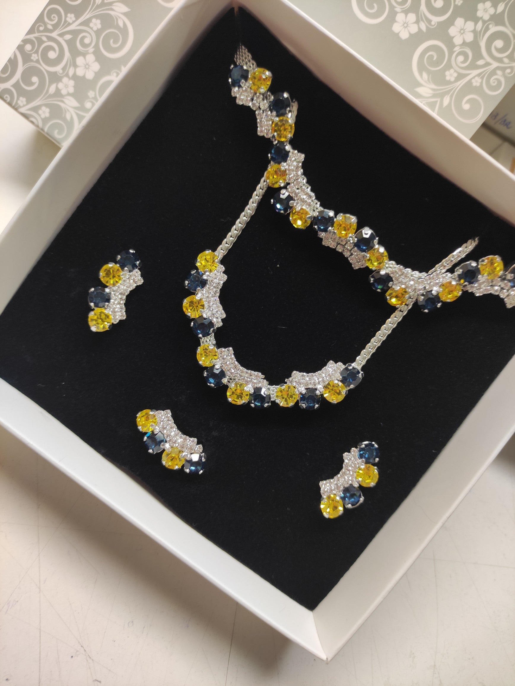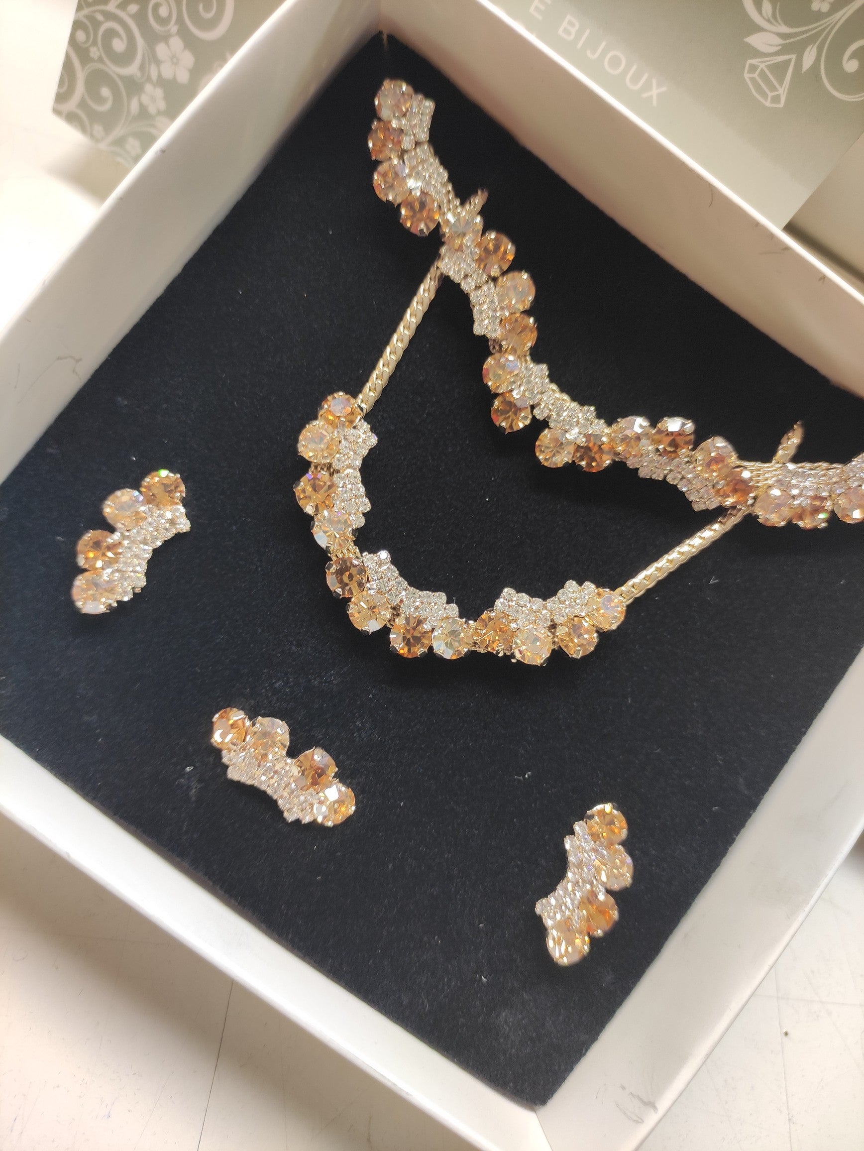Parure composta da collana, orecchini, bracciale e anello in strass e pietre Swarovski, galvanica argento nickel free, chiusura con moschettone tradizionale e catenina regolabile, orecchini con chiusura a vite, personalizzabile con galvanica oro.