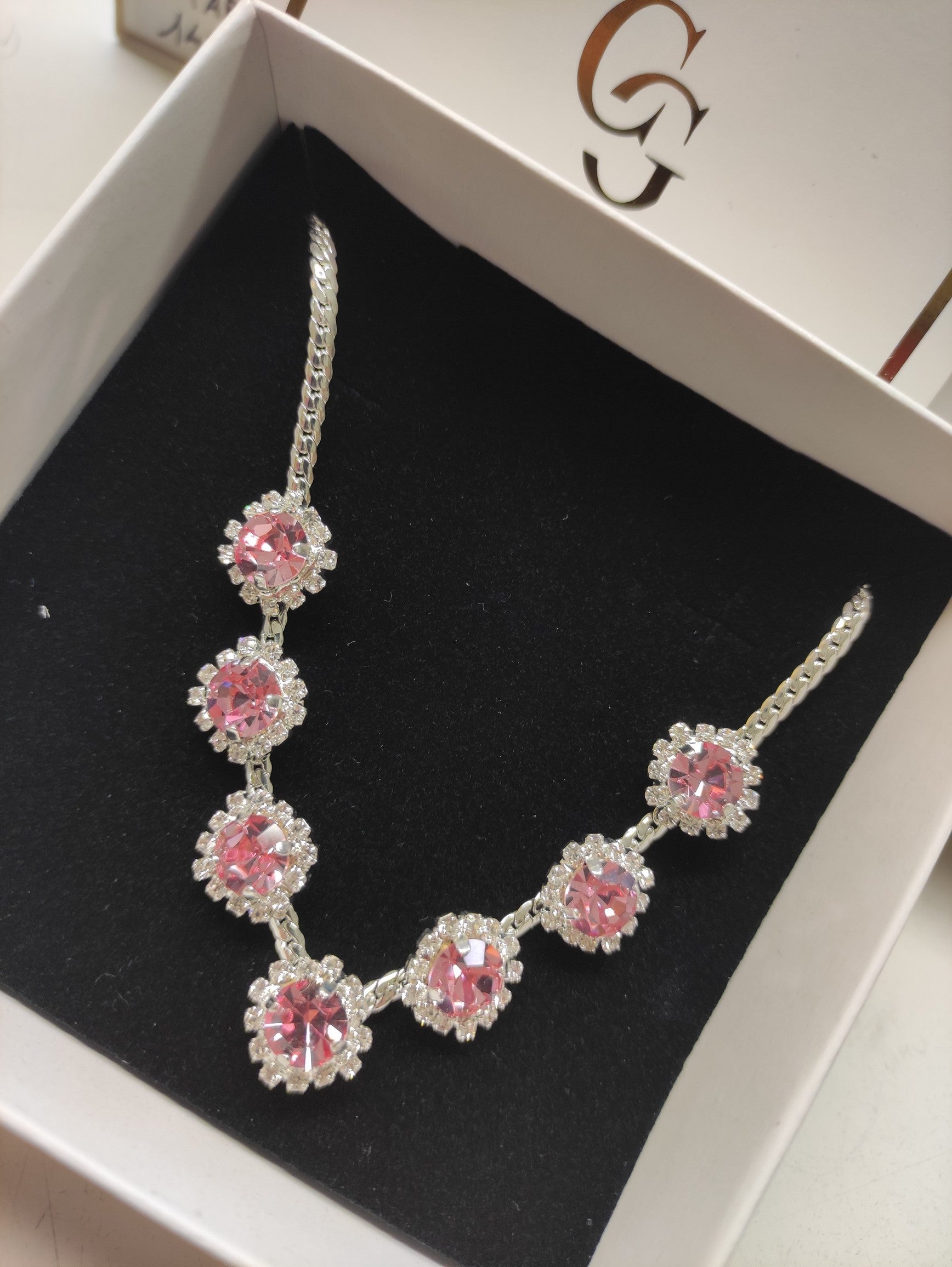 Parure composta da collana e orecchini in strass e pietre Swarovski, con galvanica argento nickel free, chiusura con moschettone tradizionale e catenina regolabile, orecchini con chiusura a vite, personalizzabile con galvanica oro