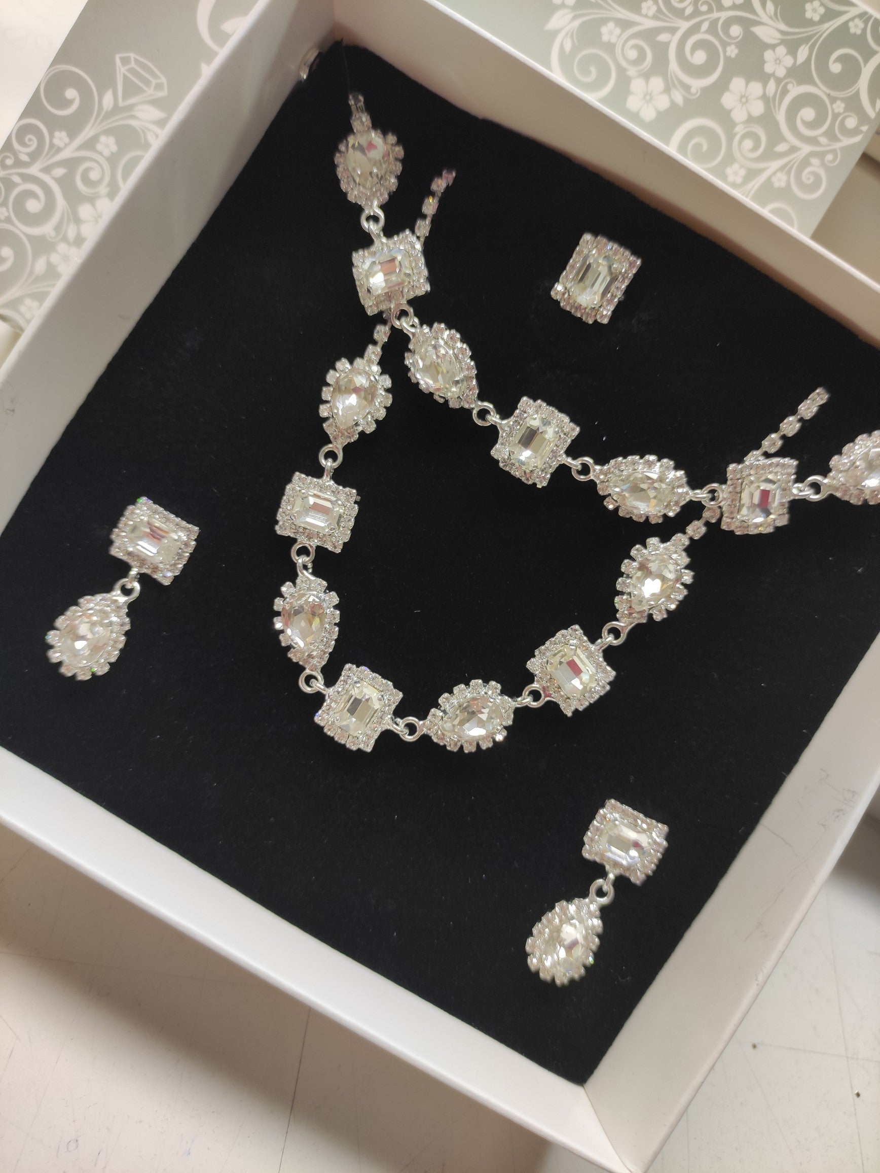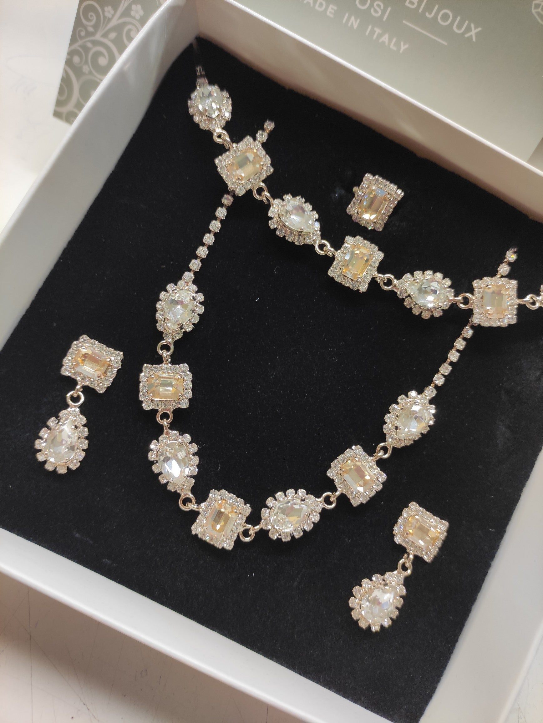 Parure composta da collana, orecchini, bracciale e anello in strass e pietre Swarovski con galvanica oro nickel free, chiusura con moschettone tradizionale e catenina regolabile, orecchini con chiusura a vite, personalizzabile con galvanica argento.