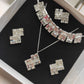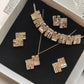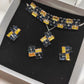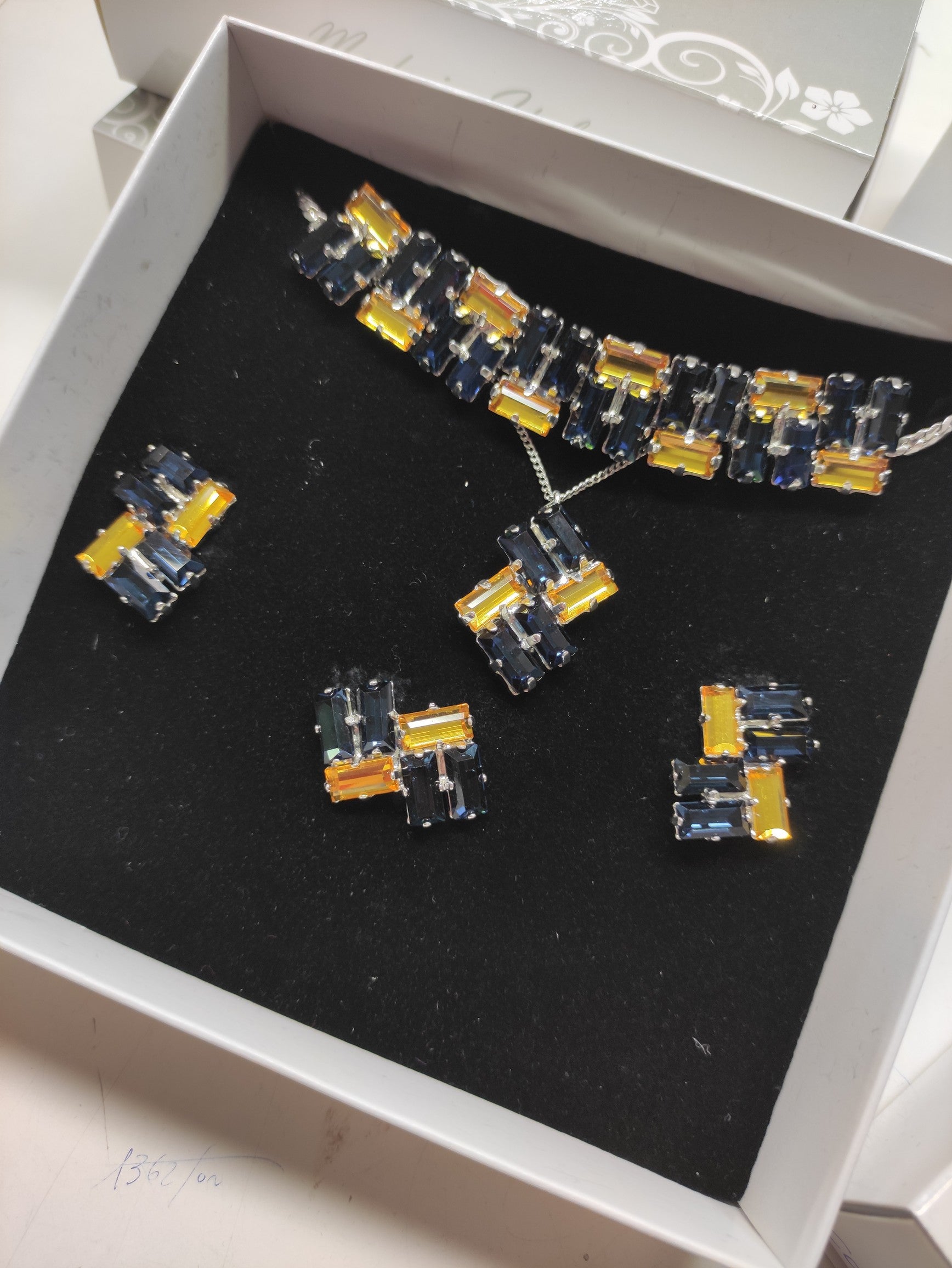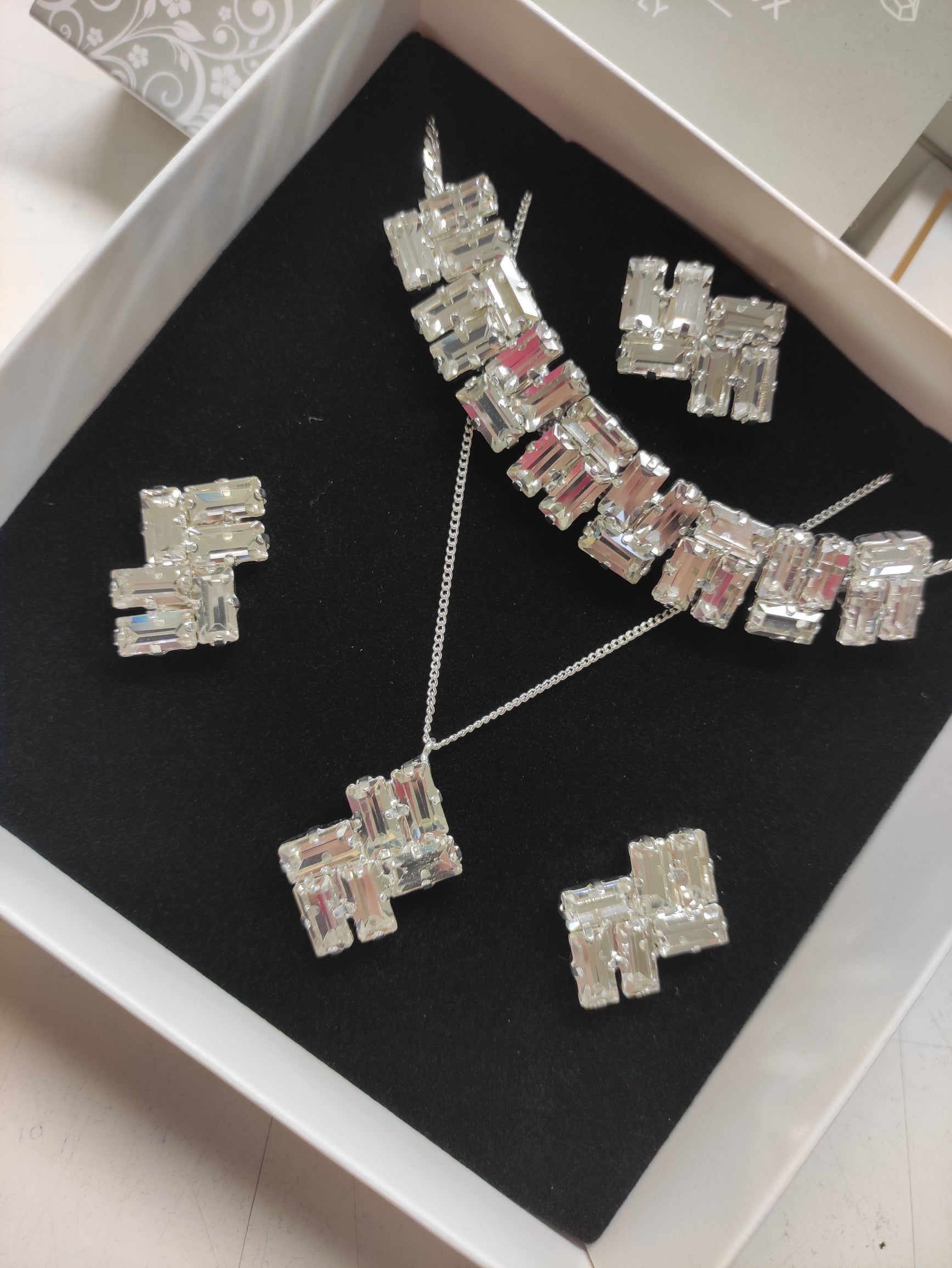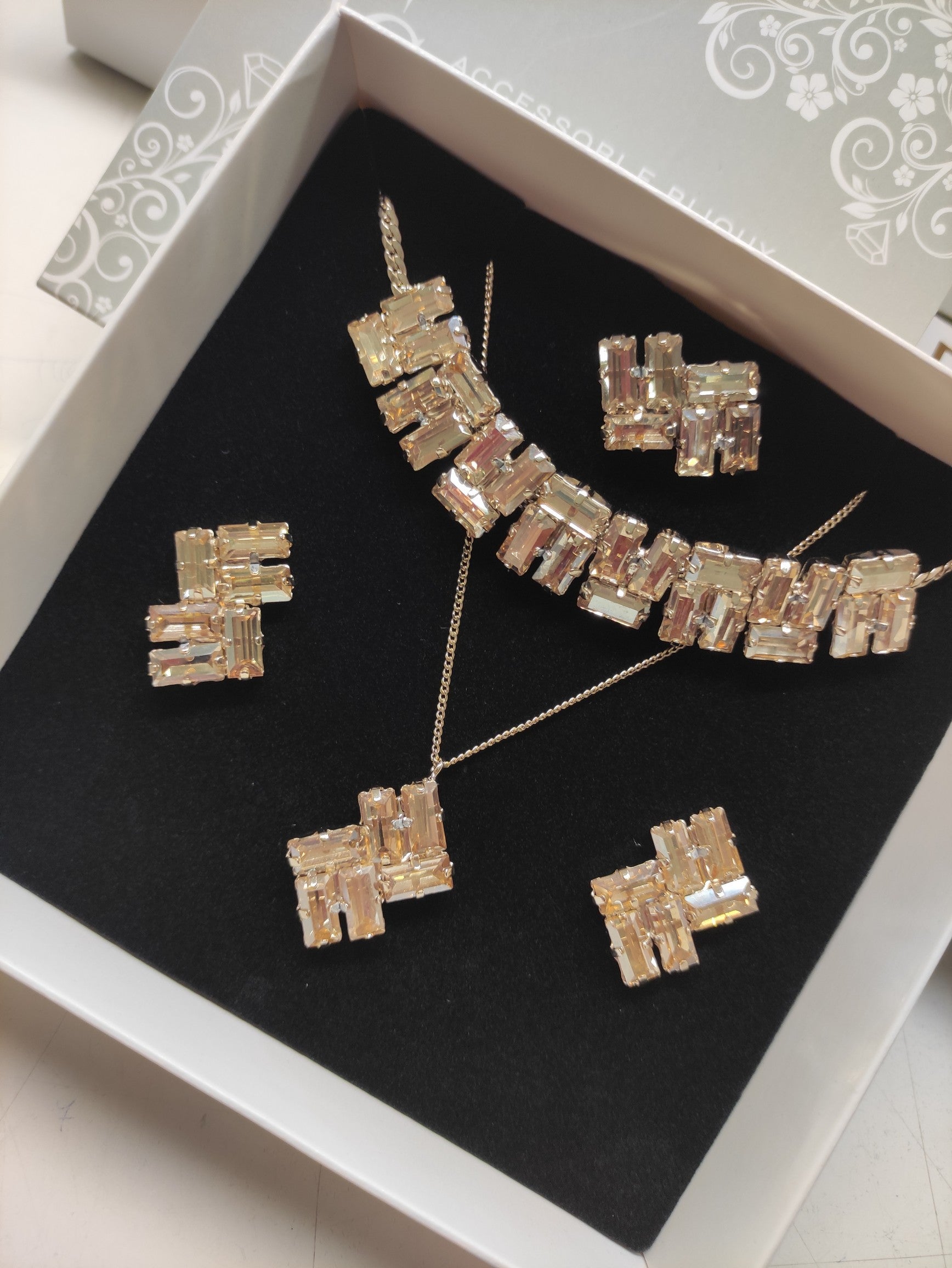 Parure composta da collana, orecchini, bracciale e anello realizzata con pietre castonate Swarovski, galvanica oro nickel free, chiusura con moschettone tradizionale e catenina regolabile, orecchini con chiusura a vite, personalizzabile con galvanica argento.