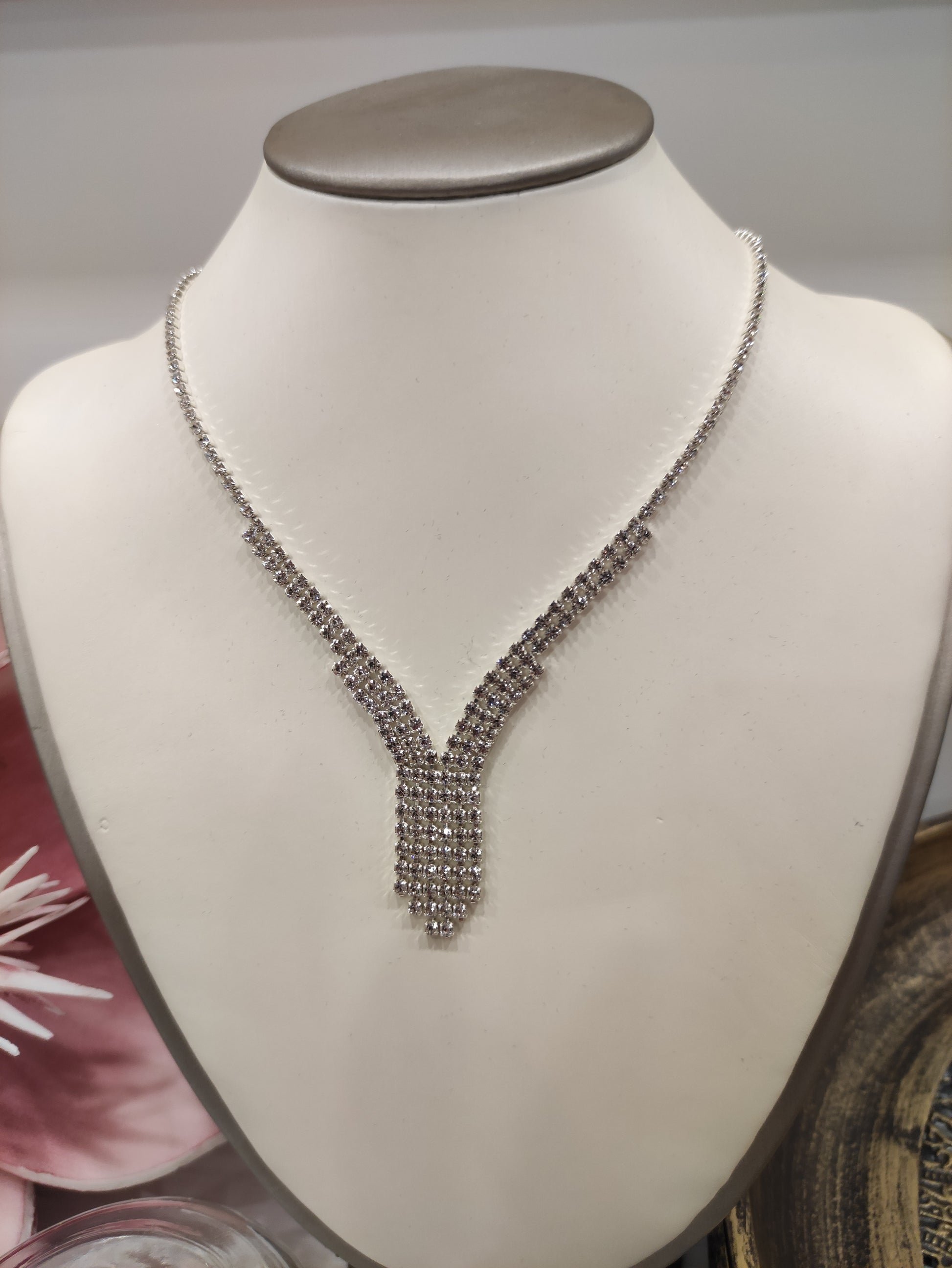 Parure composta da collana e orecchini in strass Swarovski, con galvanica argento nickel free, chiusura con moschettone tradizionale e catenina regolabile, orecchini con chiusura a vite, personalizzabile con galvanica oro