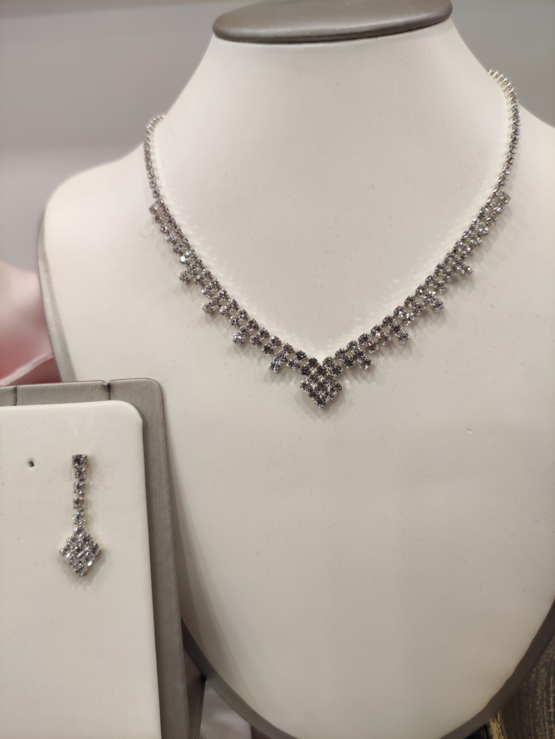 Parure composta da collana e orecchini in strass Swarovski, con galvanica argento nickel free, chiusura con moschettone tradizionale e catenina regolabile, orecchini con chiusura a vite, personalizzabile con galvanica oro