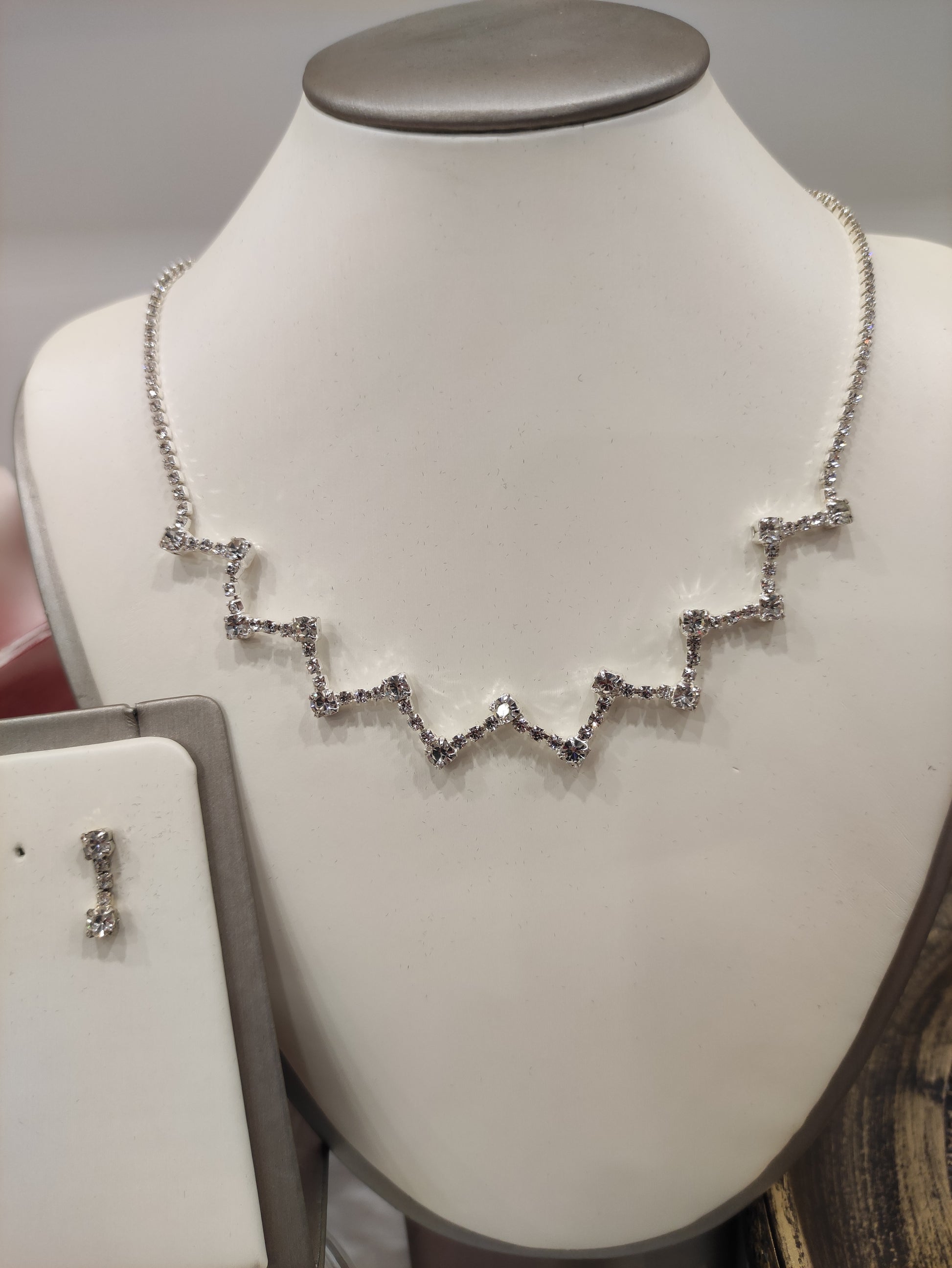 Parure composta da collana e orecchini in strass Swarovski, con galvanica argento nickel free, chiusura con moschettone tradizionale e catenina regolabile, orecchini con chiusura a vite, personalizzabile con galvanica oro