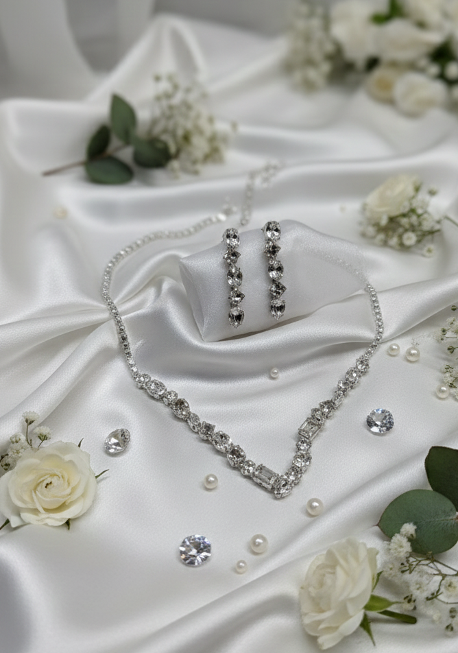 La nostra parure Mosaico di Luce è un inno alla pazienza artigiana. Un mix eclettico di cristalli Swarovski di tagli diversi — gocce, strass, navette, ottagoni, ovali — castonati singolarmente a mano, uno per uno, per creare un design unico e irripetibile.