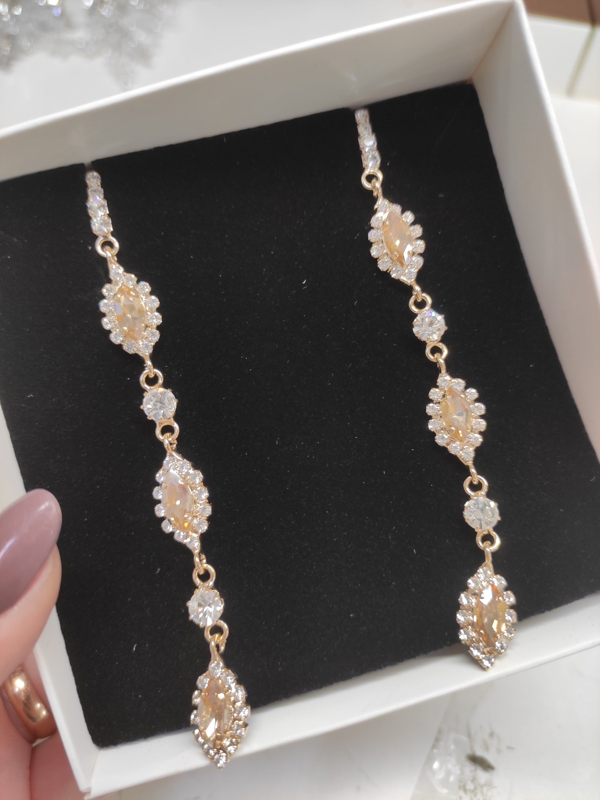 Orecchini pendenti realizzati in ottone placcato oro o argento con lega in stagno, impreziositi da strass e pietre Swarovski, galvanica nickel free.