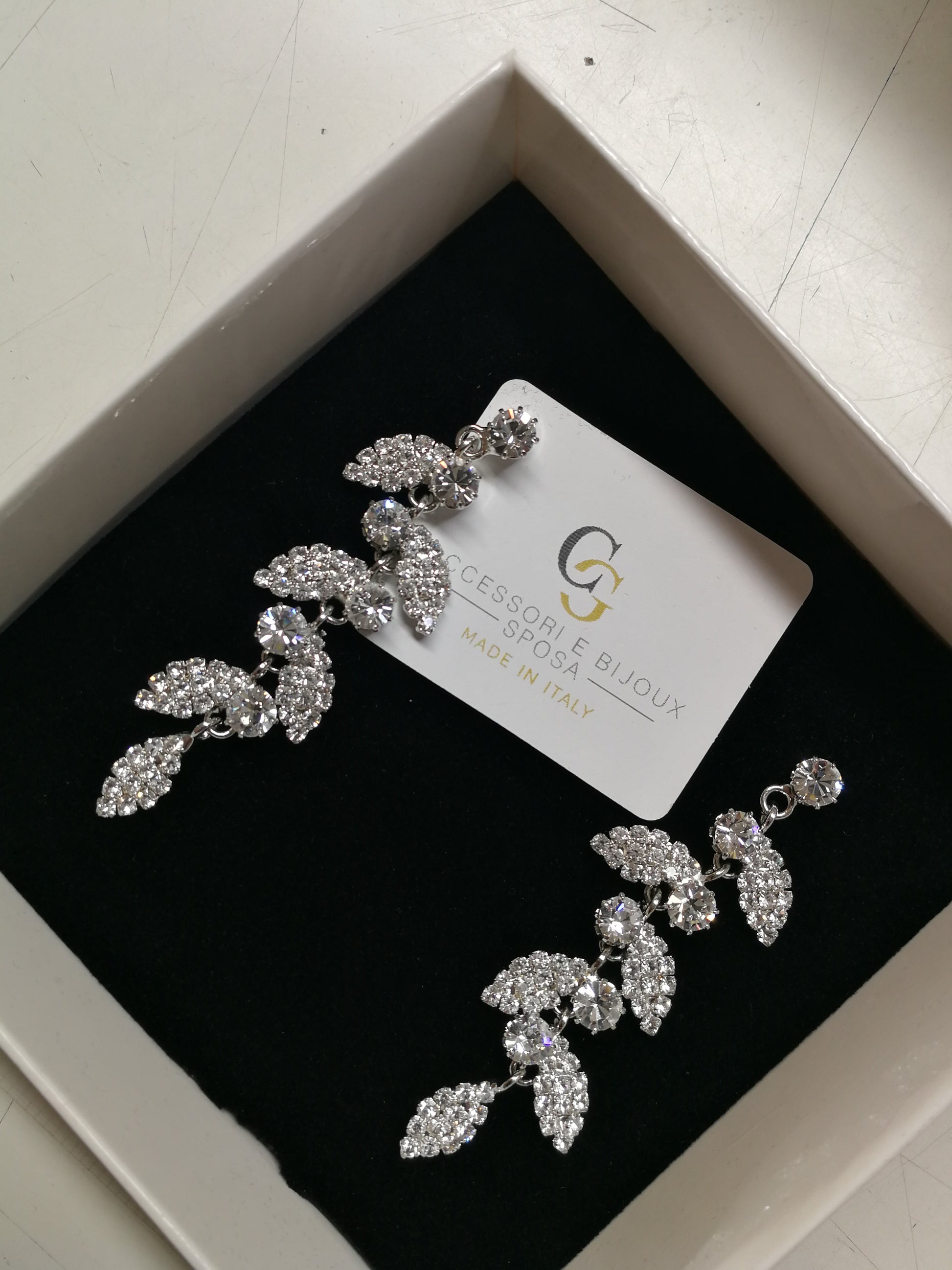 Orecchini pendenti realizzati in ottone placcato oro o argento con lega in stagno, arricchiti da foglioline di strass e punti luce Swarovski, galvanica nickel free.