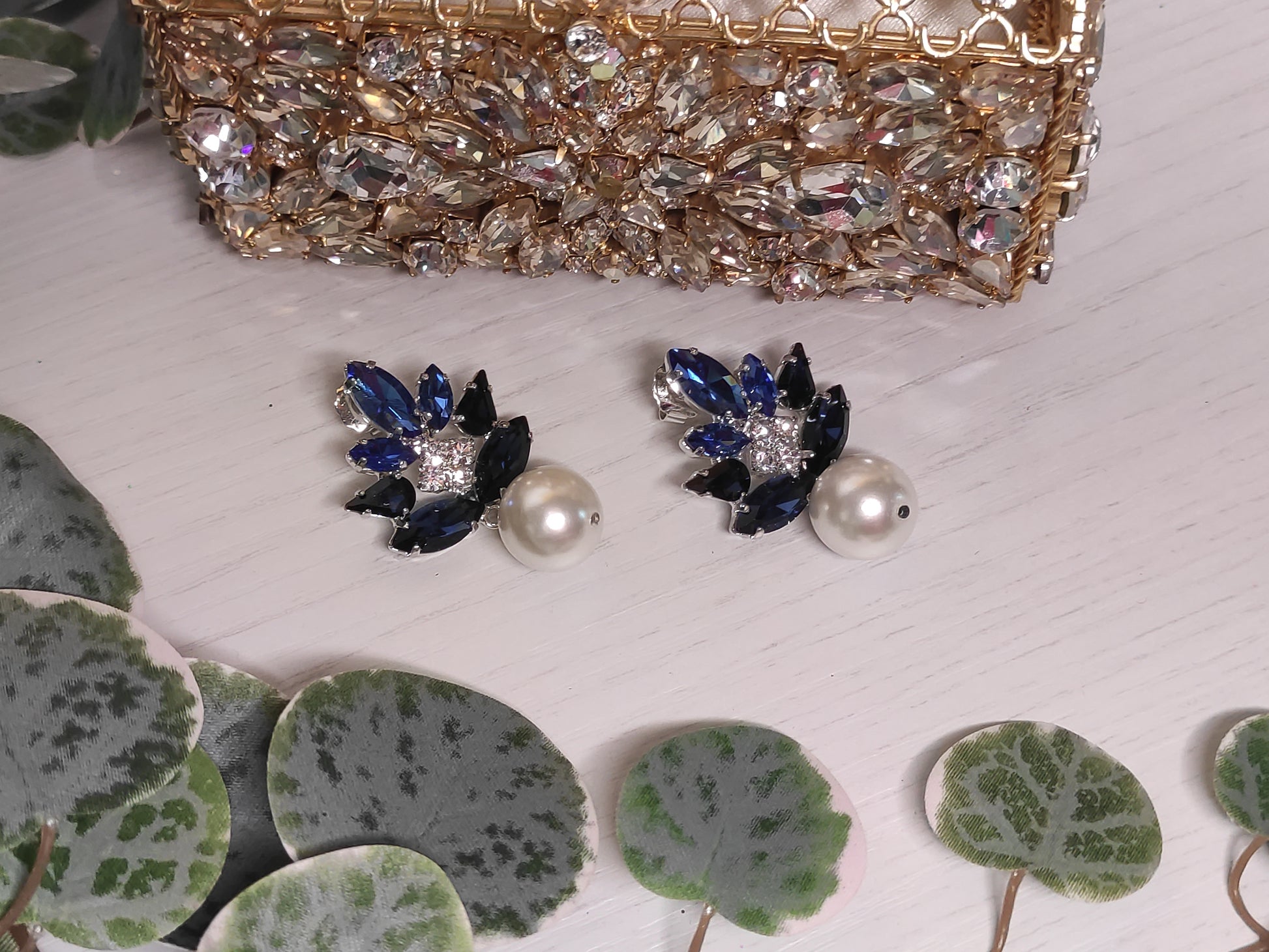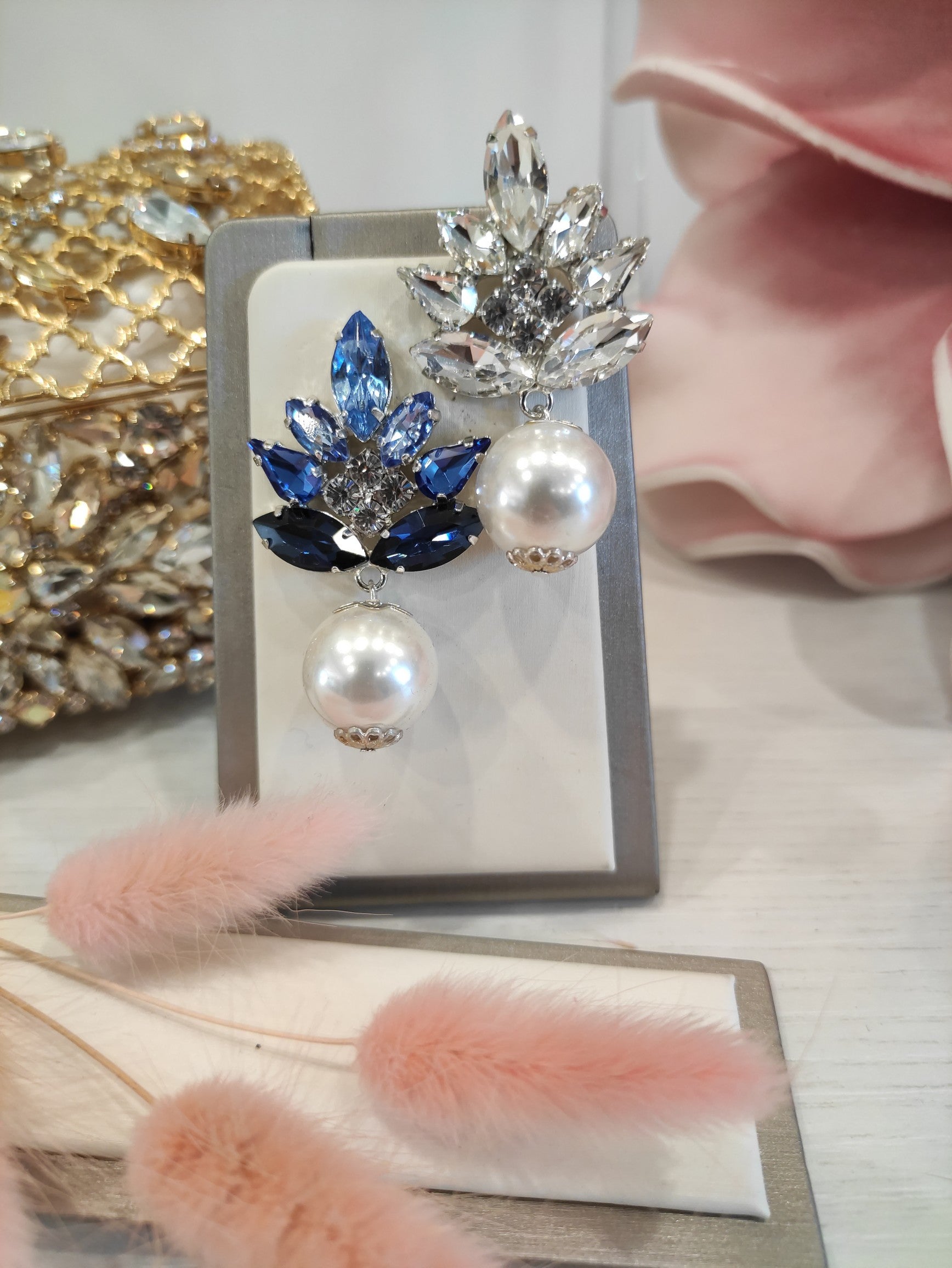 Orecchini con perla pendente realizzati in ottone placcato oro o argento con lega in stagno, impreziositi da strass e pietre Swarovski e perle, galvanica nickel free.