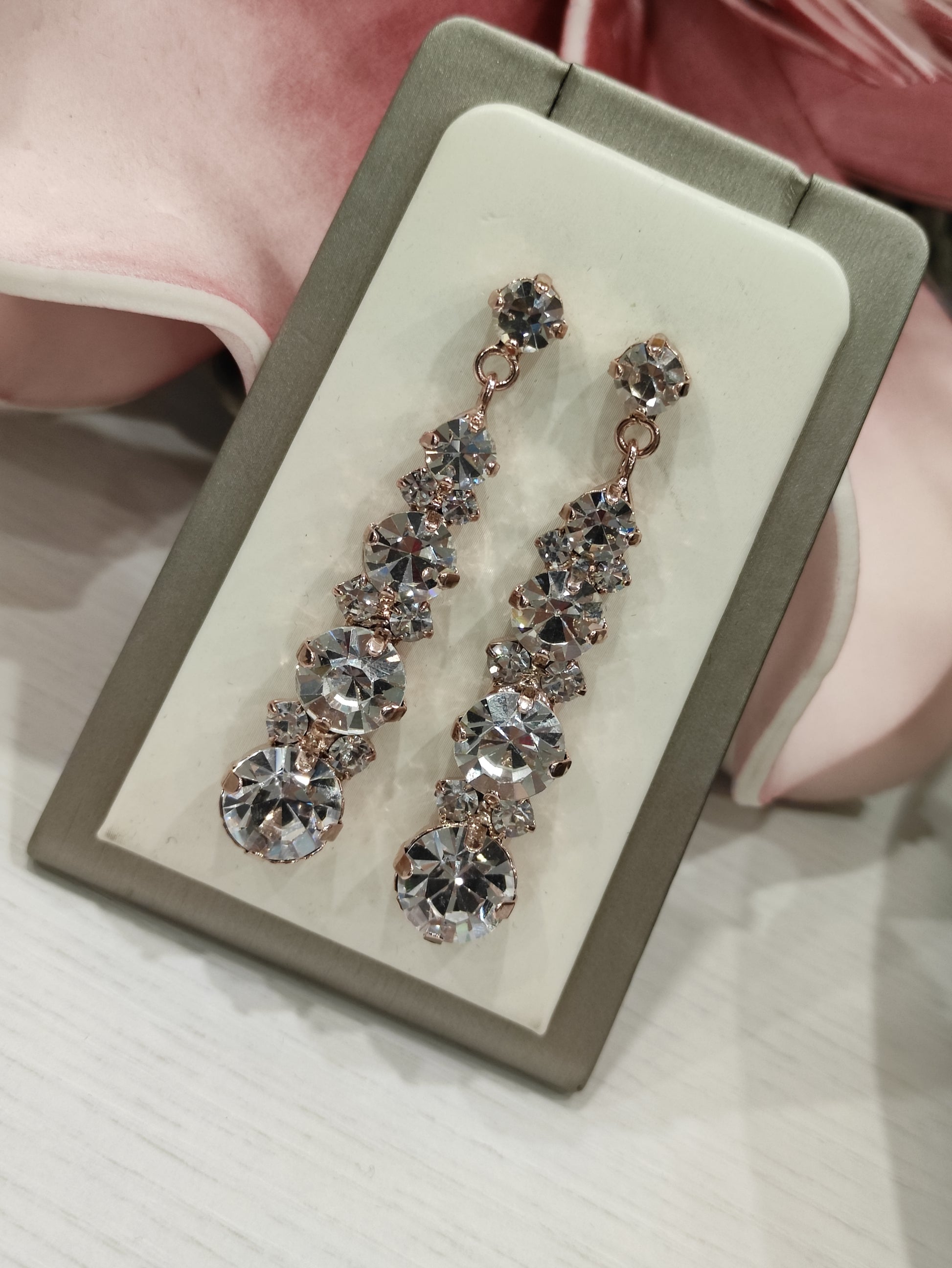 Orecchini pendenti realizzati in ottone placcato oro o argento con lega in stagno, impreziositi da strass e pietre Swarovski, galvanica nickel free.