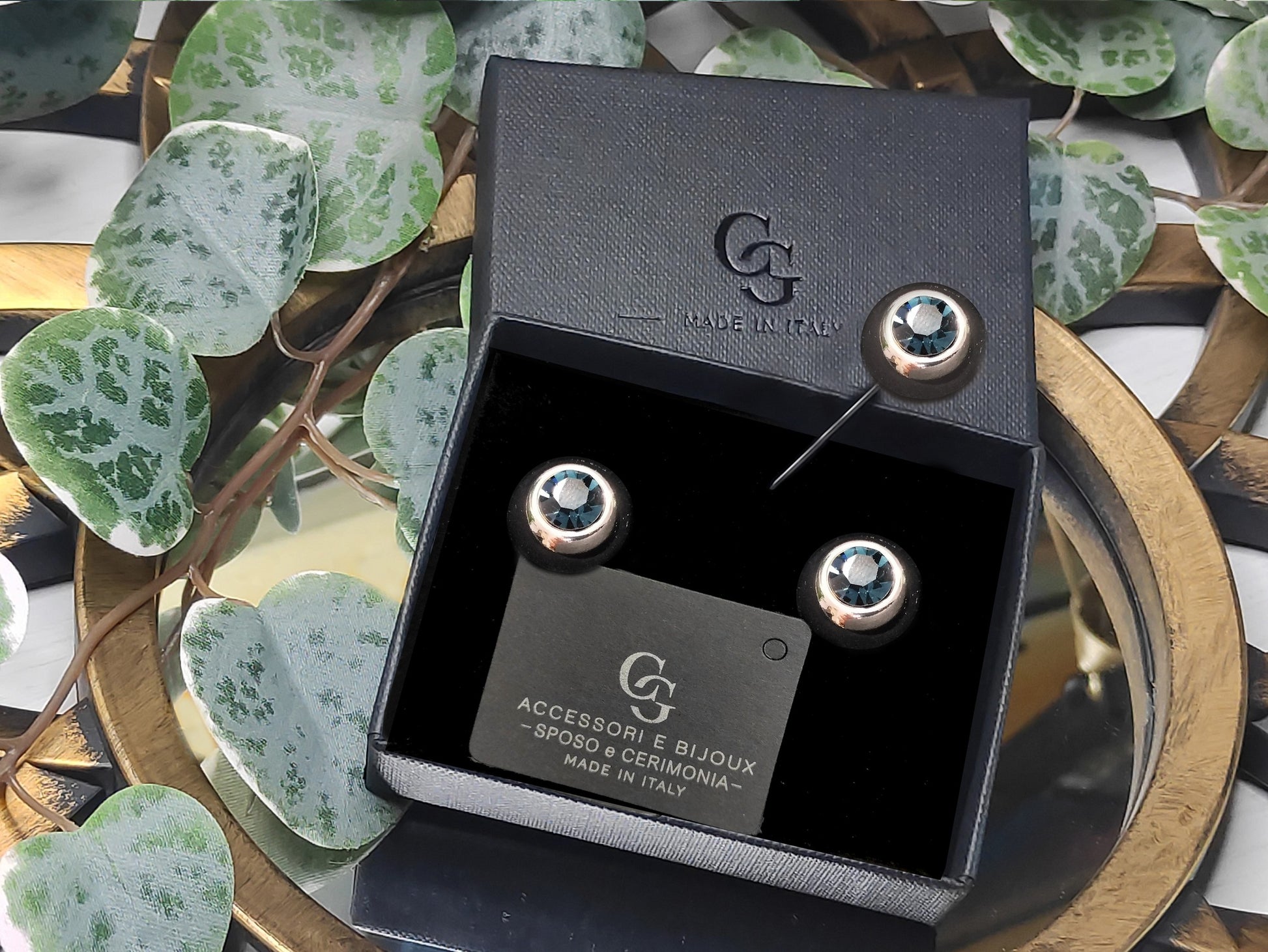 Gemelli da polso per camicia e spilla abbinata realizzati su una base di ottone, placcato rodio, impreziosita da un cristallo Swarovski, lega in stagno, nichel free.
