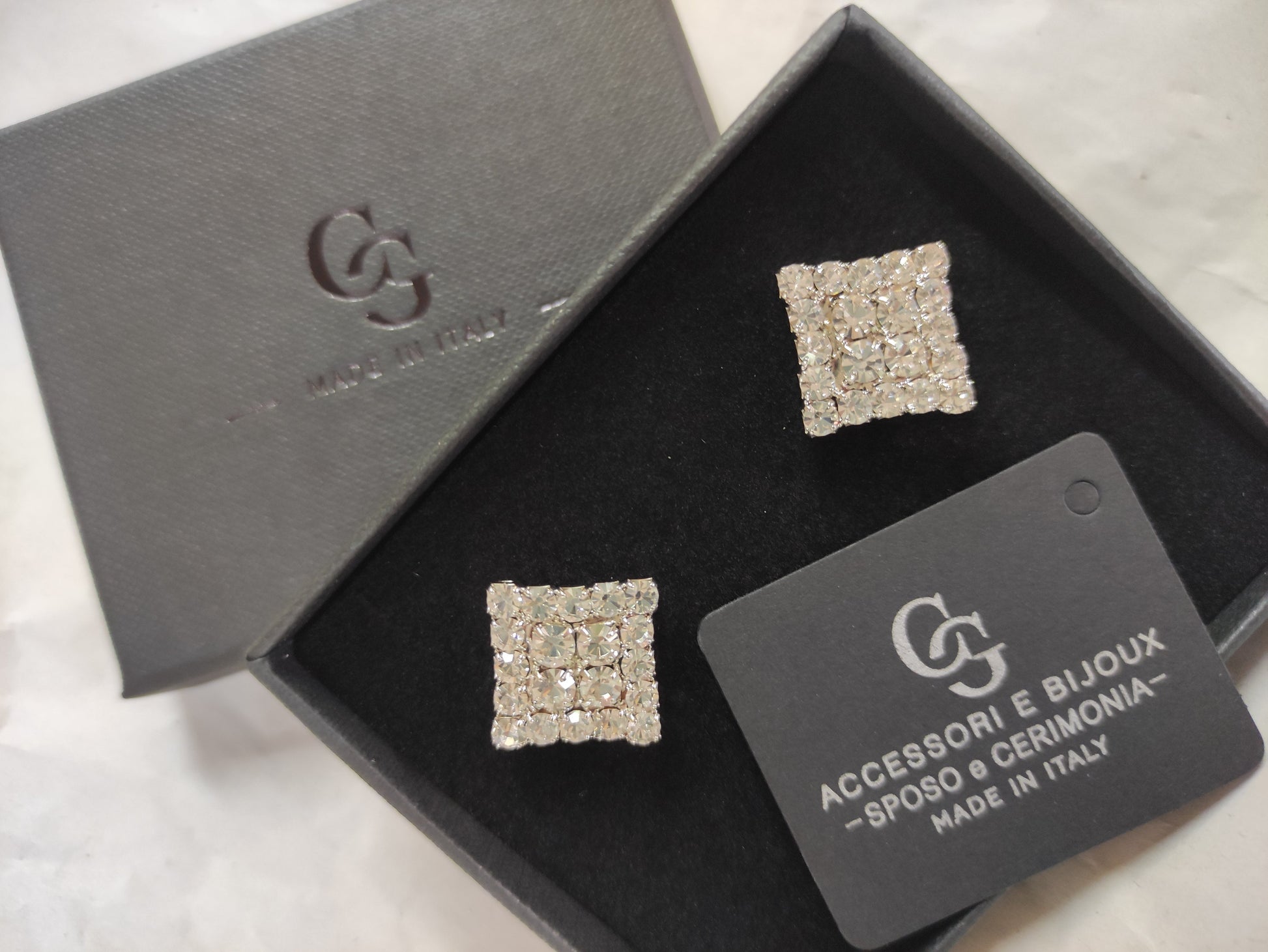 Gemelli da polso per camicia e spilla abbinata, in strass Swarovski e Preciosa, con lega in stagno, base ottone, placcato rodio, nichel free.