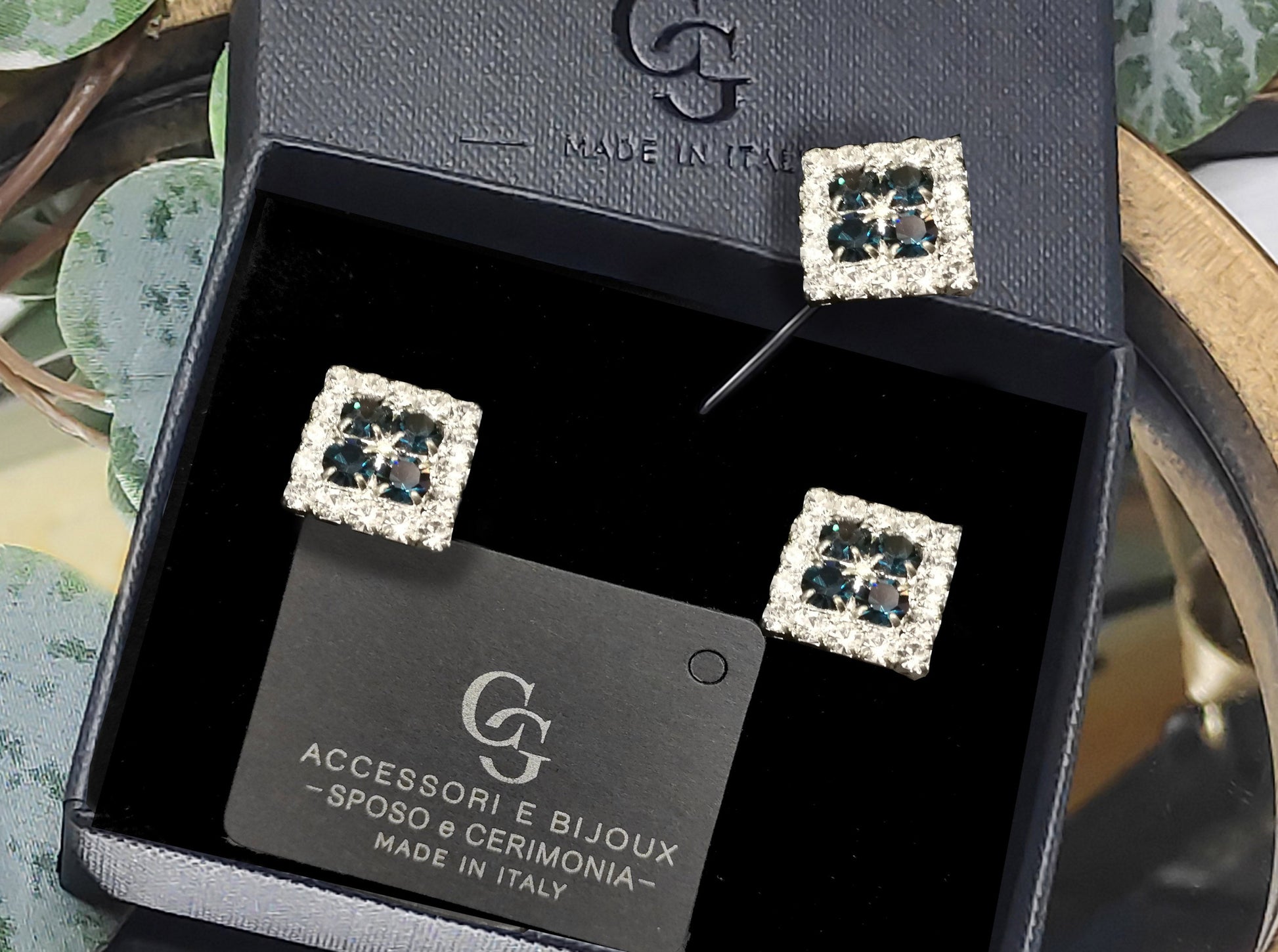 Gemelli da polso per camicia e spilla abbinata, in strass Swarovski e Preciosa, con lega in stagno, base ottone, placcato rodio, nichel free.