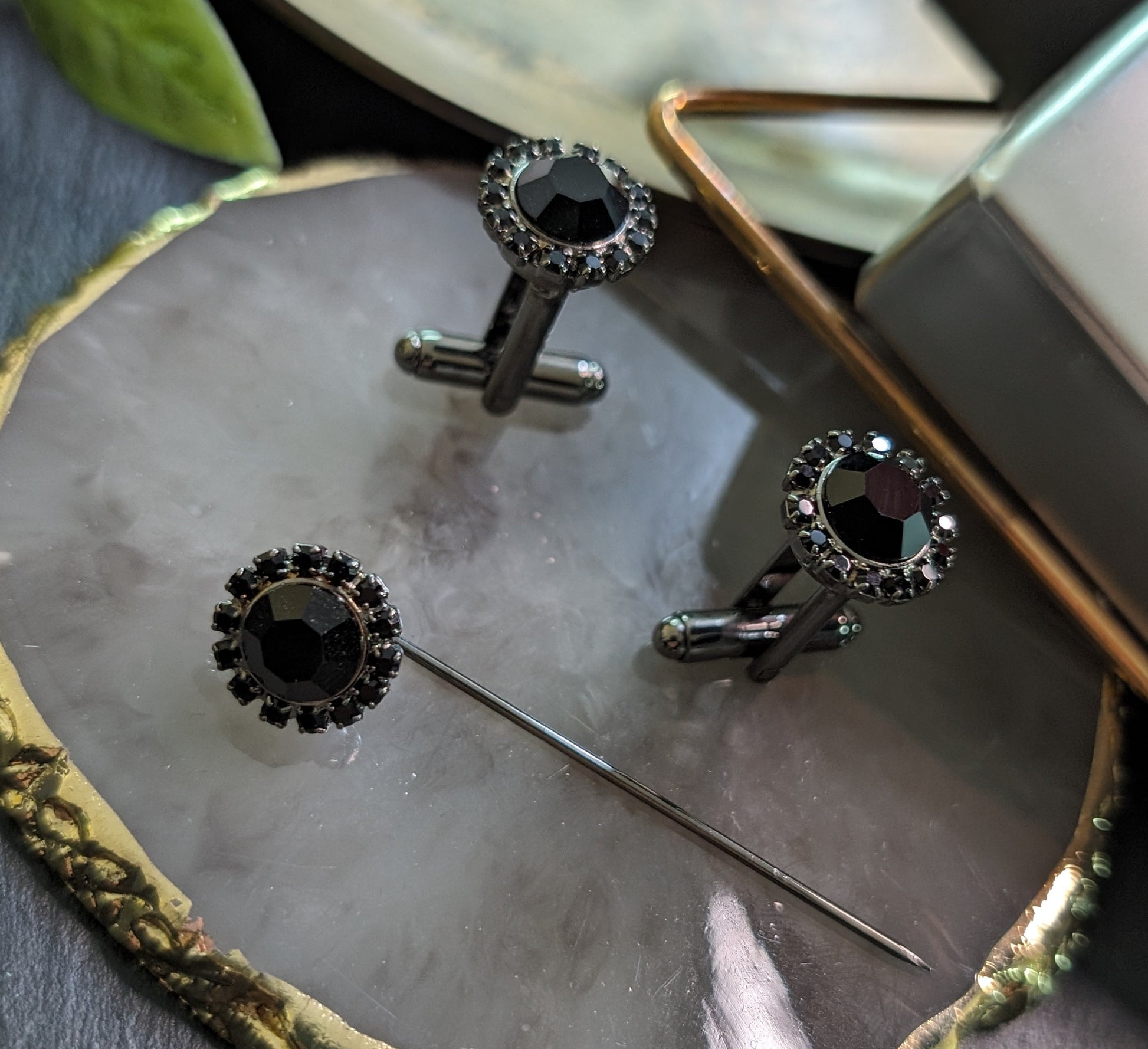 Gemelli da polso per camicia e spilla abbinata, in strass Swarovski, con lega in stagno, base ottone, placcato rodio, nichel free.