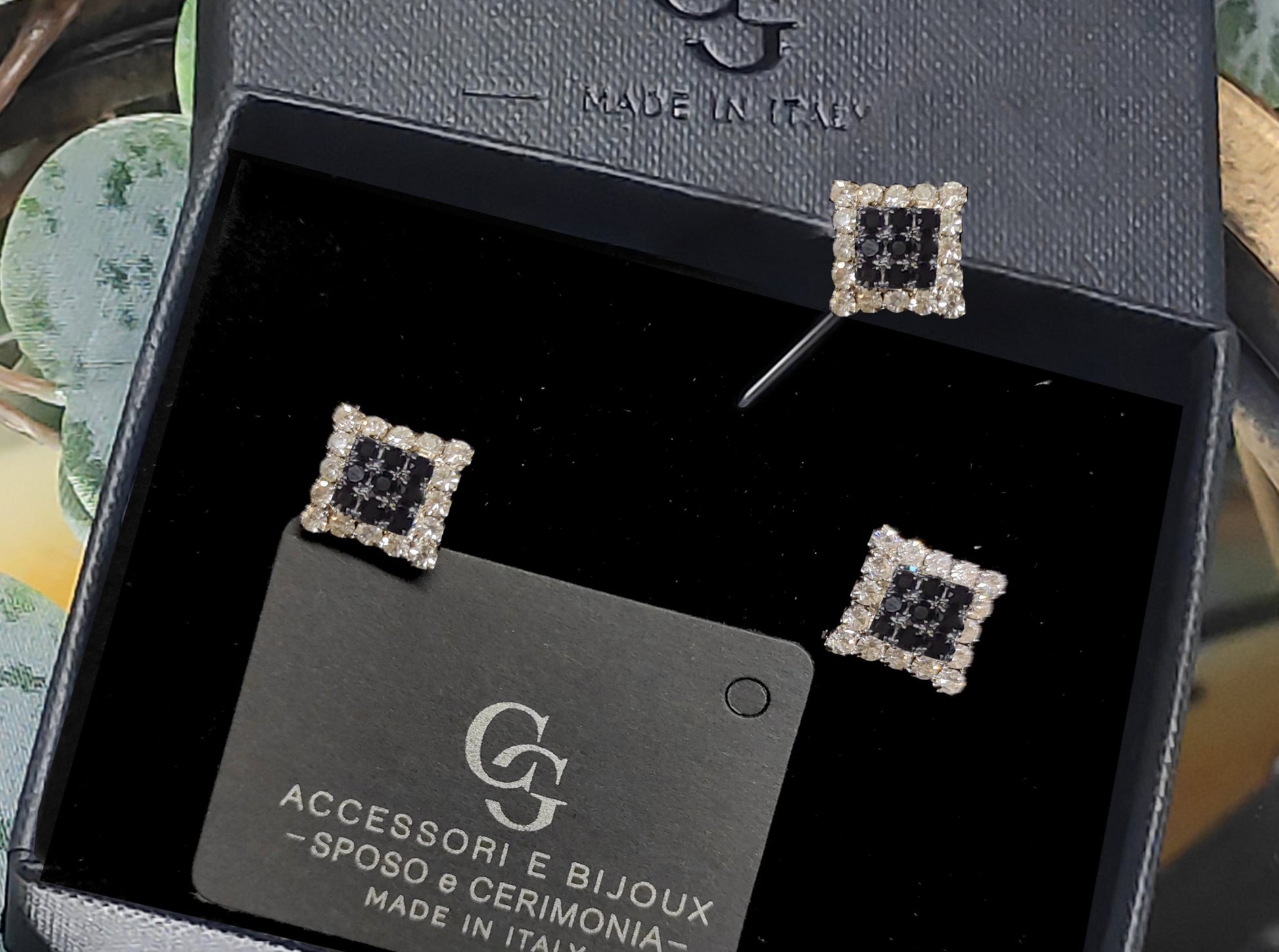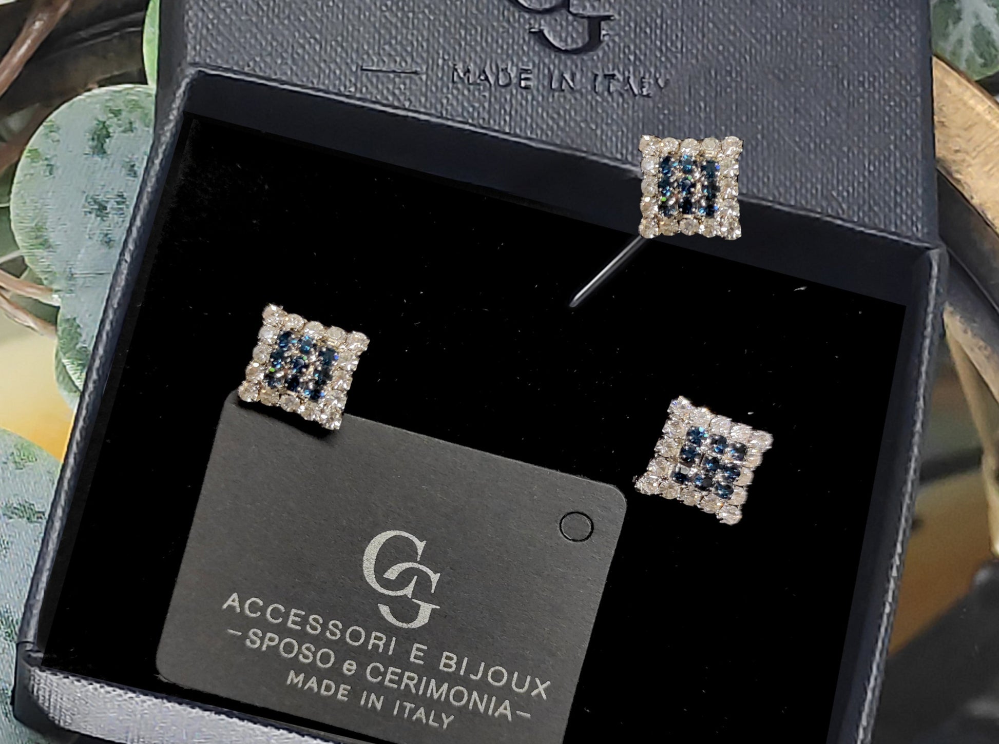 Gemelli da polso per camicia e spilla abbinata, in strass Swarovski e Preciosa, con lega in stagno, base ottone, placcato rodio, nichel free.