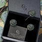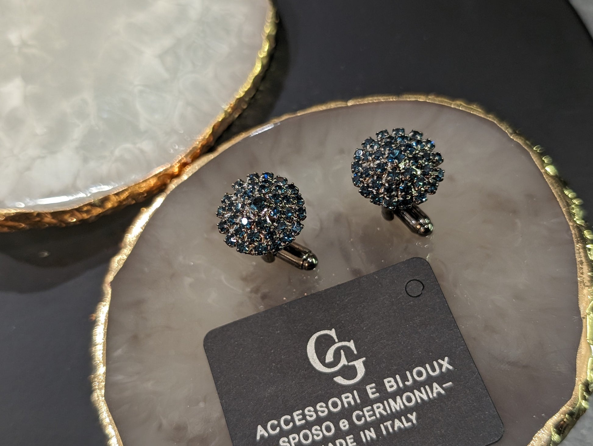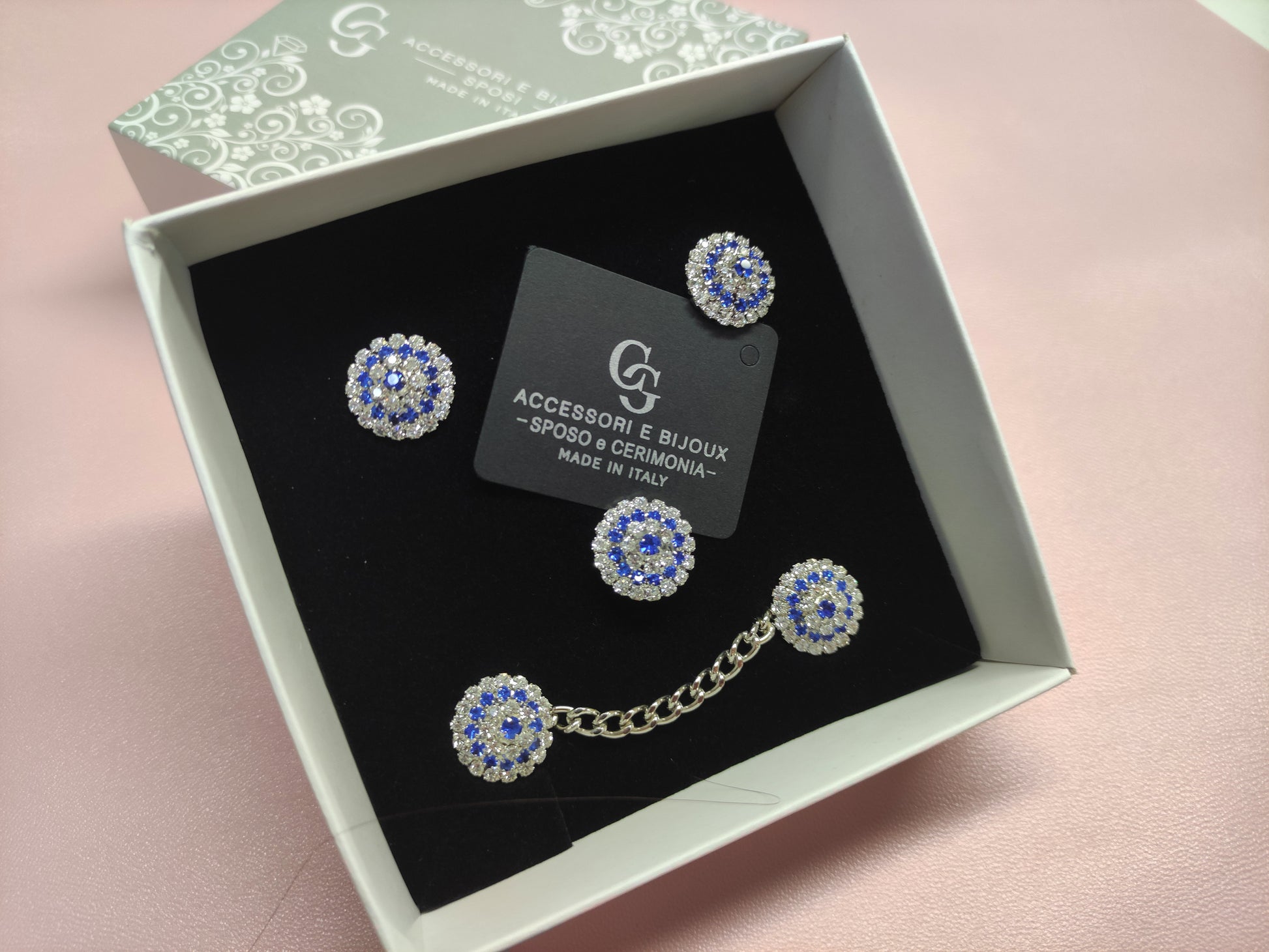 Gemelli da polso per camicia e spilla abbinata, in strass Swarovski e Preciosa, con lega in stagno, base ottone, placcato rodio, nichel free.