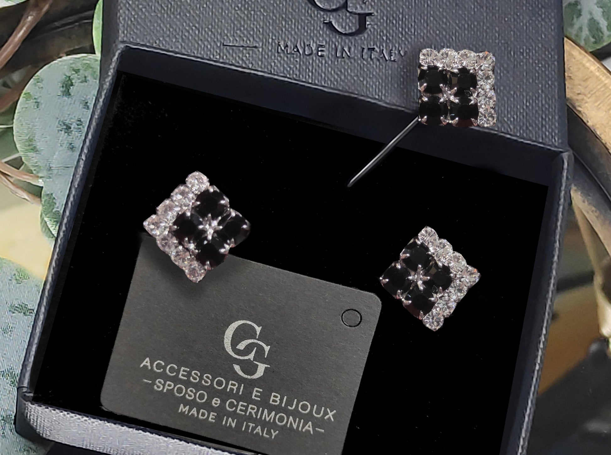 Gemelli da polso per camicia e spilla abbinata, in strass Swarovski e Preciosa, con lega in stagno, base ottone, placcato rodio, nichel free.